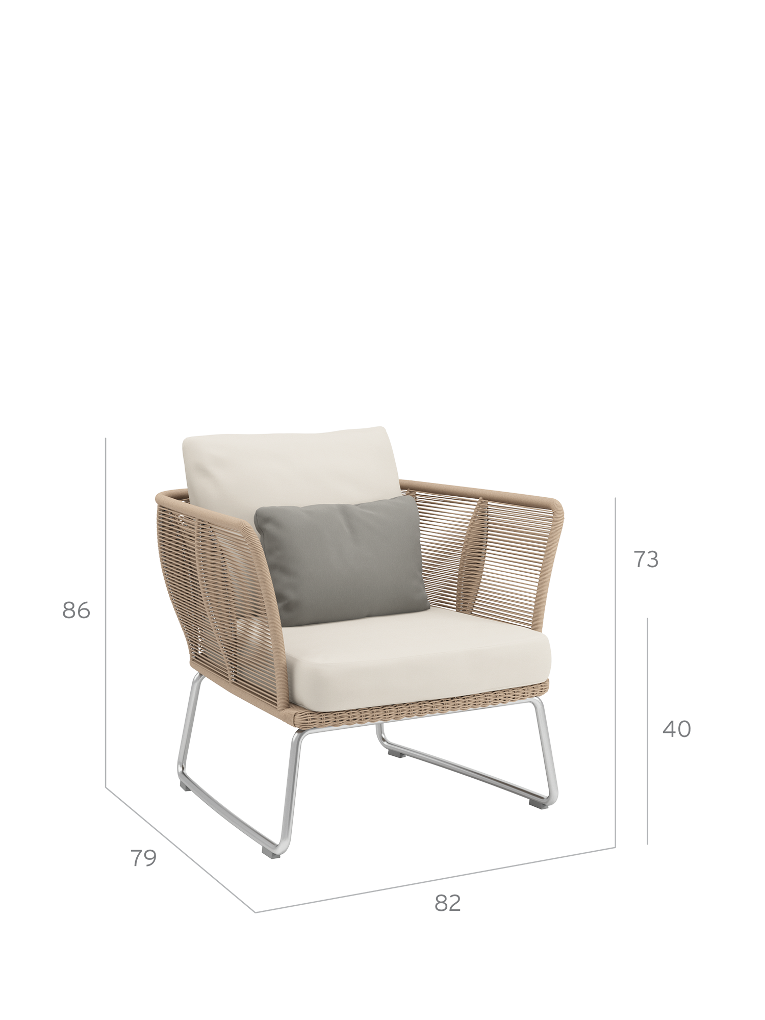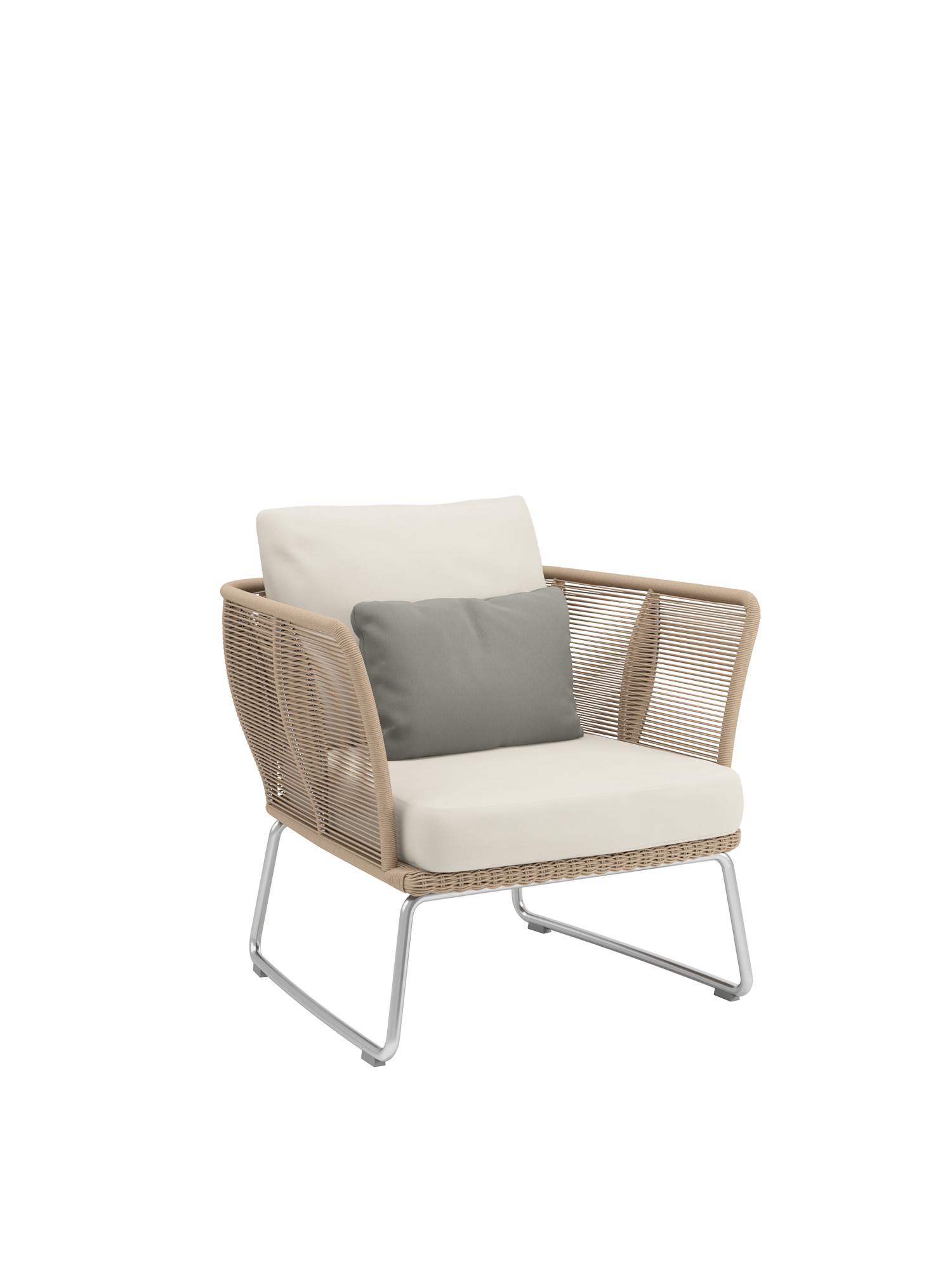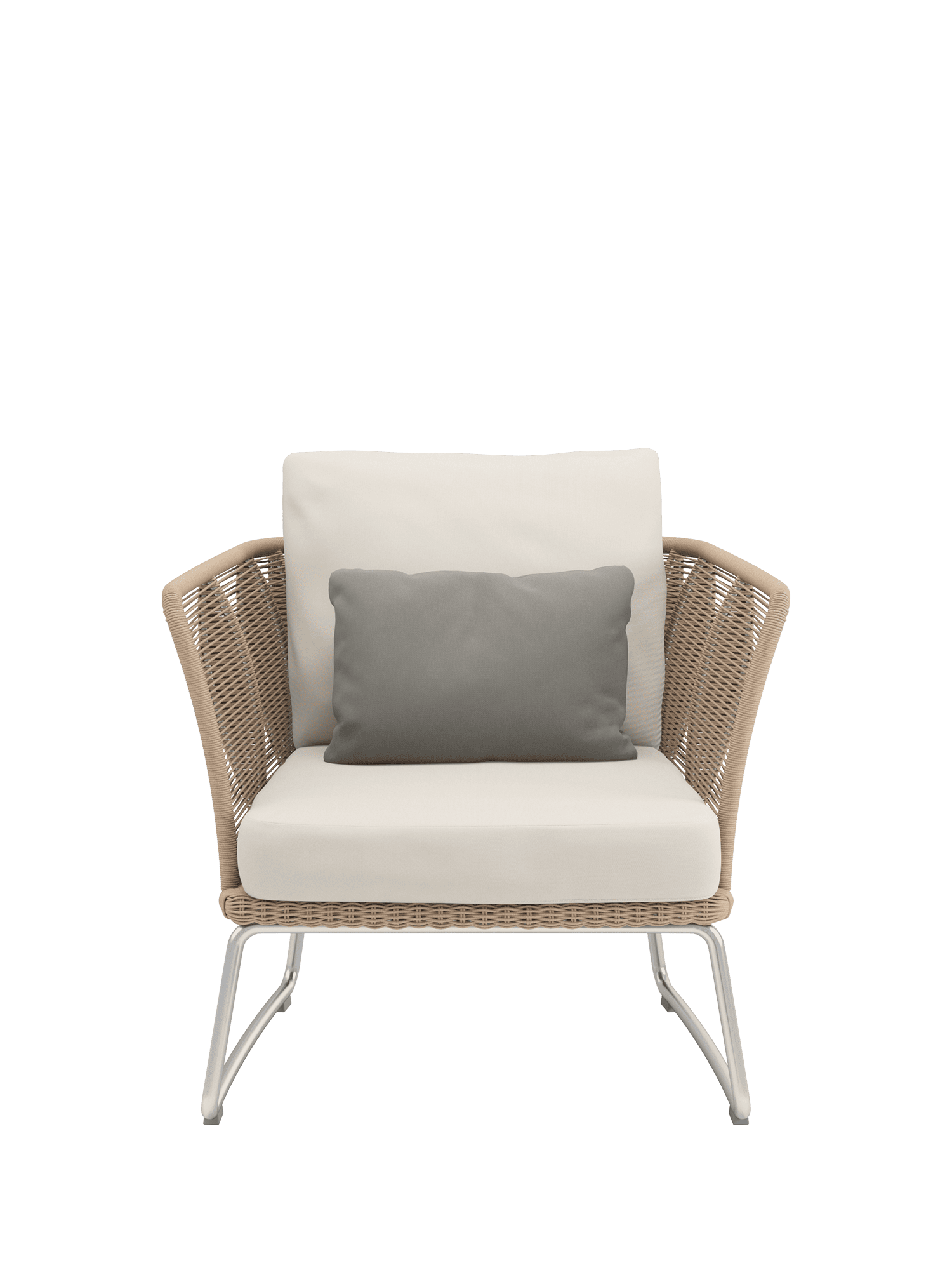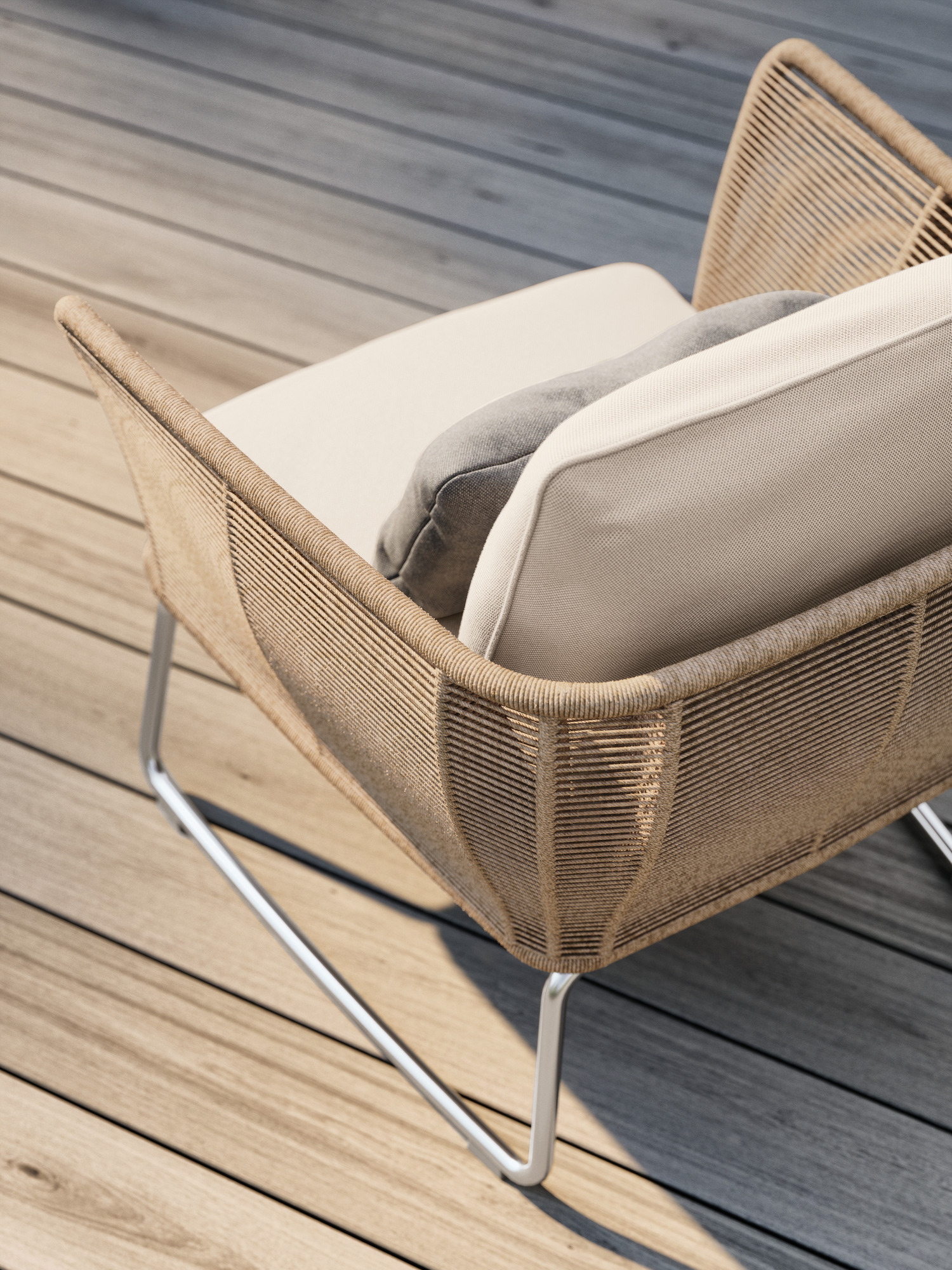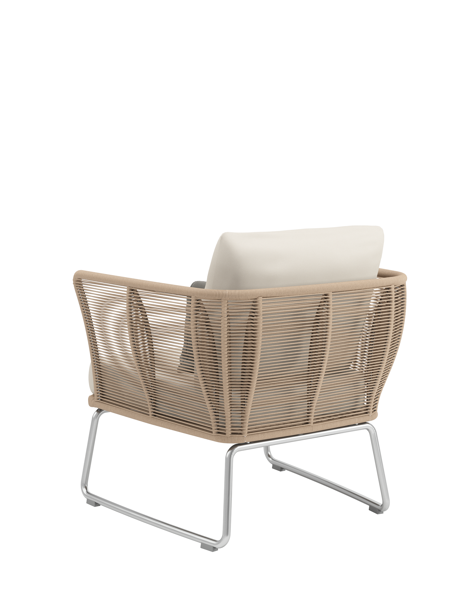 Eine Kombination aus witterungsbeständigem Kordelgeflecht und Edelstahl sorgt für Transparenz und Stabilität zugleich. Das geradlinige Flechtmuster der Loungemöbel lässt das Licht durchscheinen. Die auf gleicher Höhe verlaufenden Rücken- und Seitenteile des komfortablen Sessels sind doppellagig gearbeitet und bieten angenehmen Rückhalt. Schlanke, geschwungene Edelstahlkufen verleihen dem Design besondere Eleganz und zuverlässigen Halt.