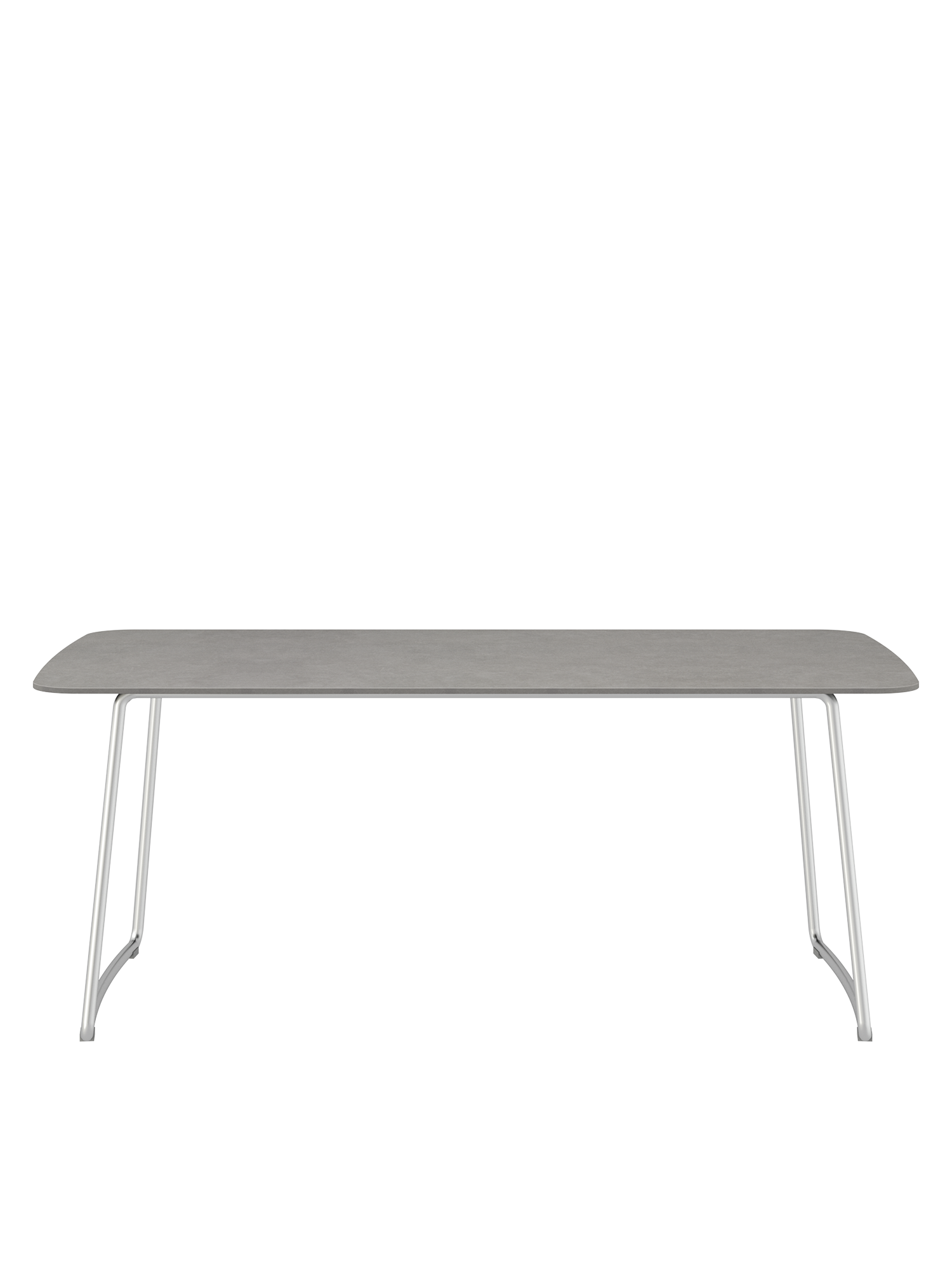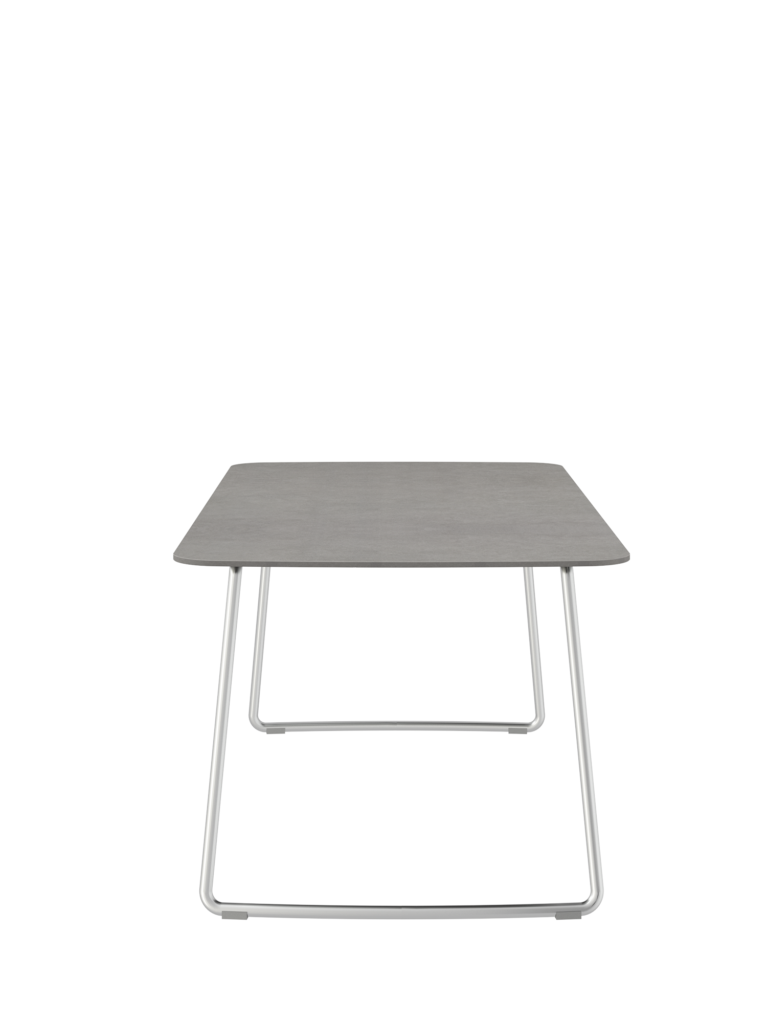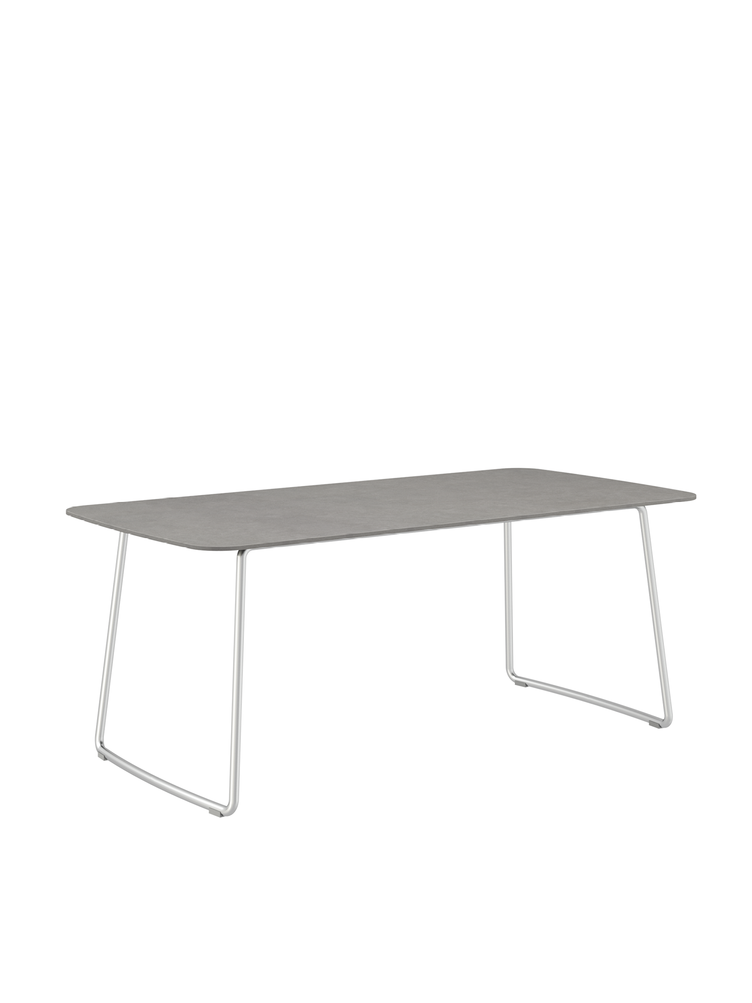 Die schlanke Tischplatte aus Kunstharz im Farbton Shade wird von den geschwungenen Edelstahlkufen des Esstisches getragen. Auch sie fügen sich harmonisch in das Gesamtbild der Amari Serie ein. Die passenden Armlehnstühle können einfach unter den Tisch geschoben werden.