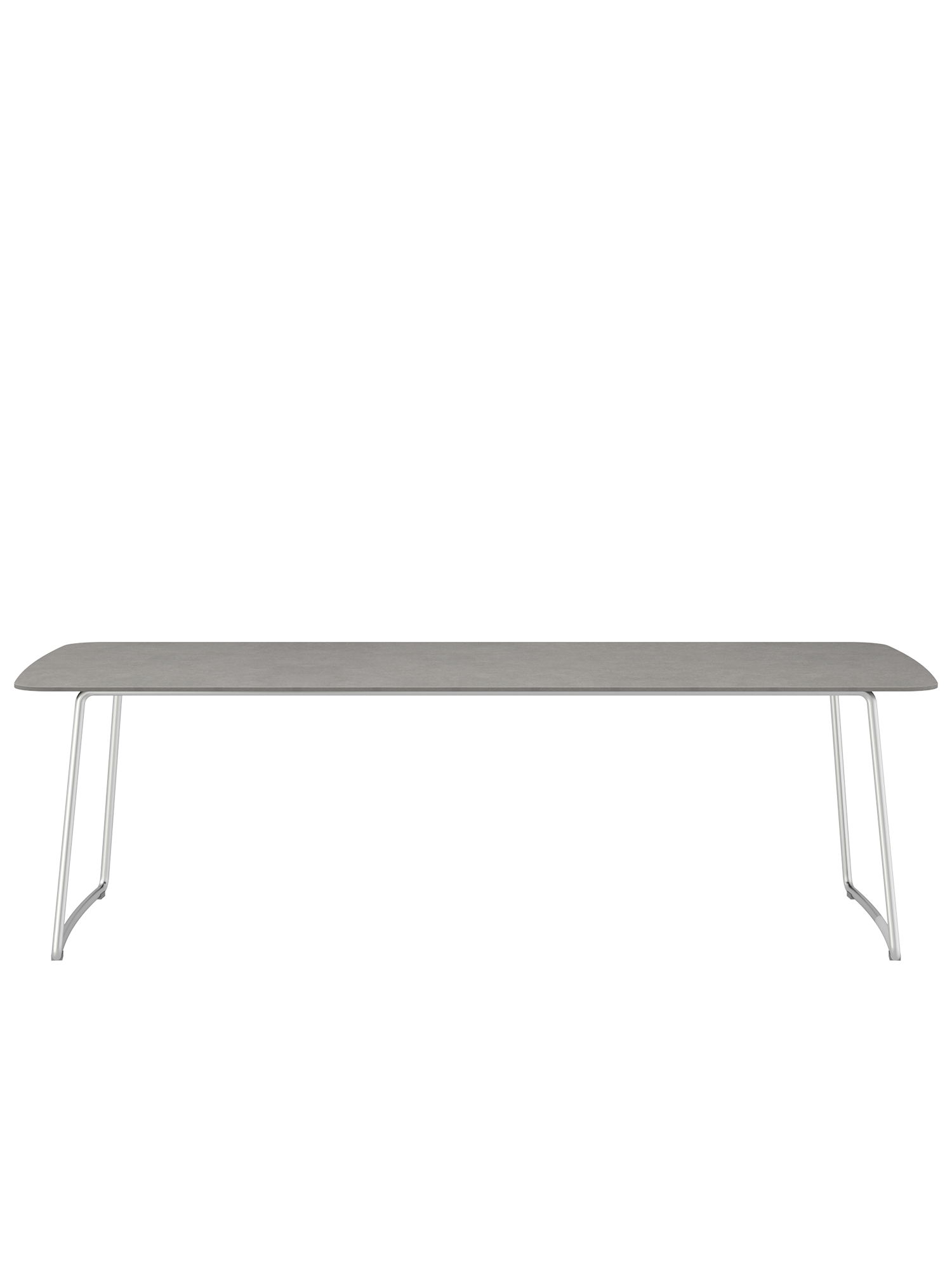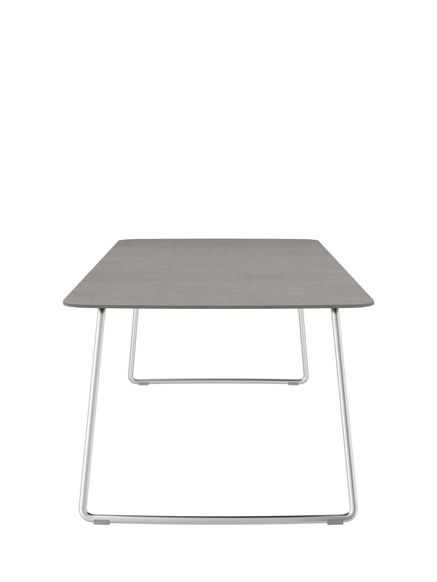 Die schlanke Tischplatte aus Kunstharz im Farbton Shade wird von den geschwungenen Edelstahlkufen des Esstisches getragen. Auch sie fügen sich harmonisch in das Gesamtbild der Amari Serie ein. Die passenden Armlehnstühle können einfach unter den Tisch geschoben werden.