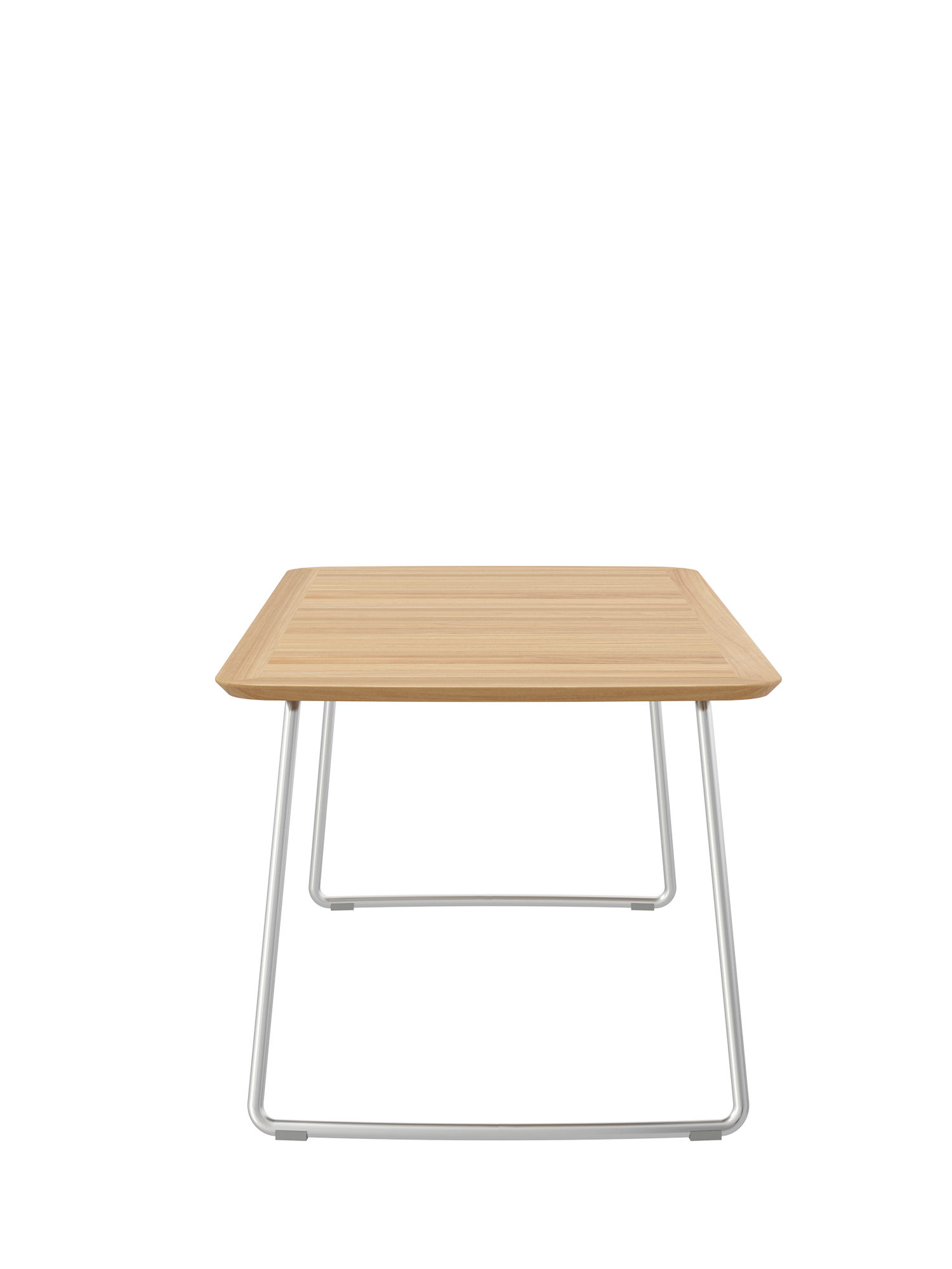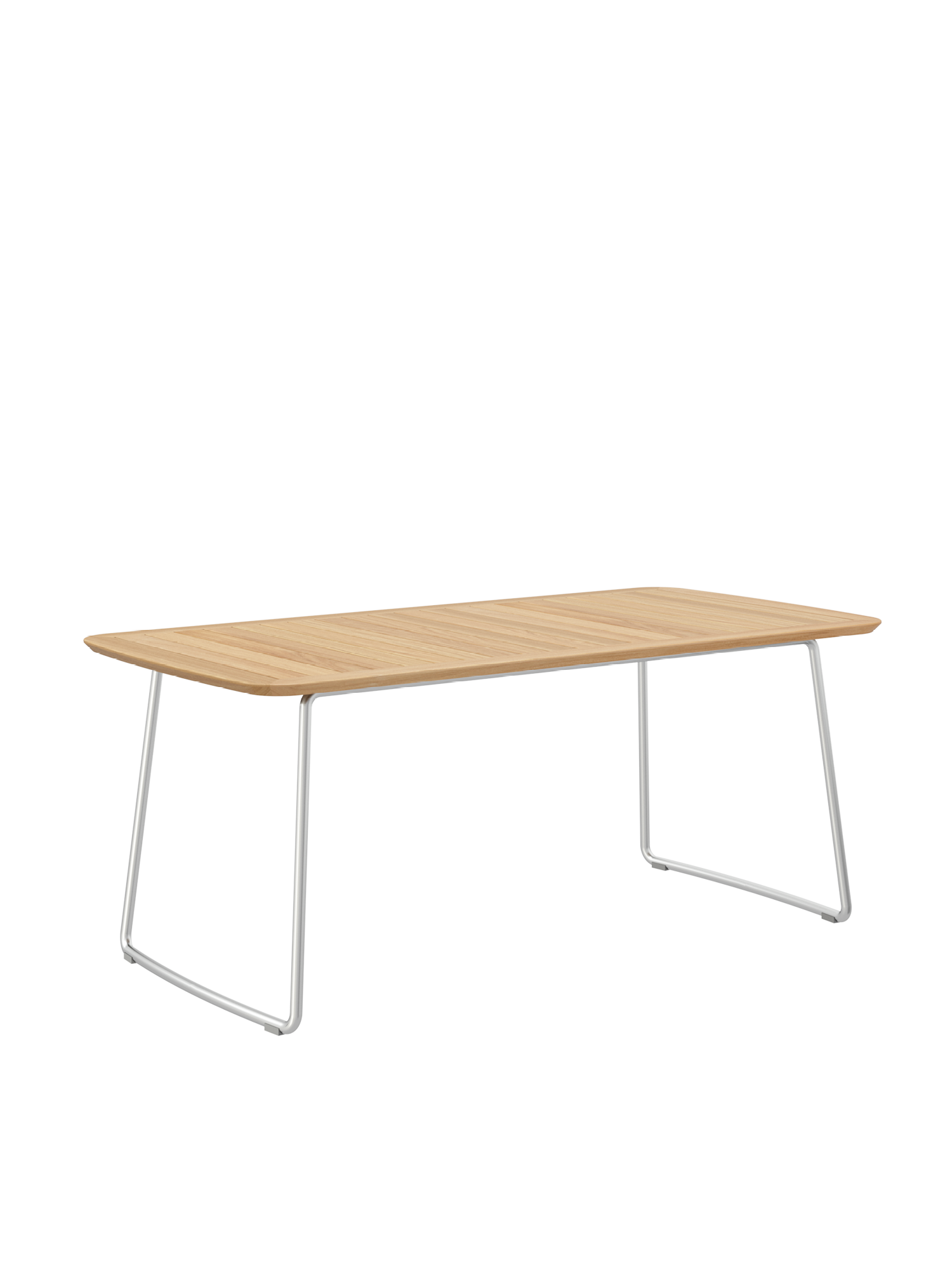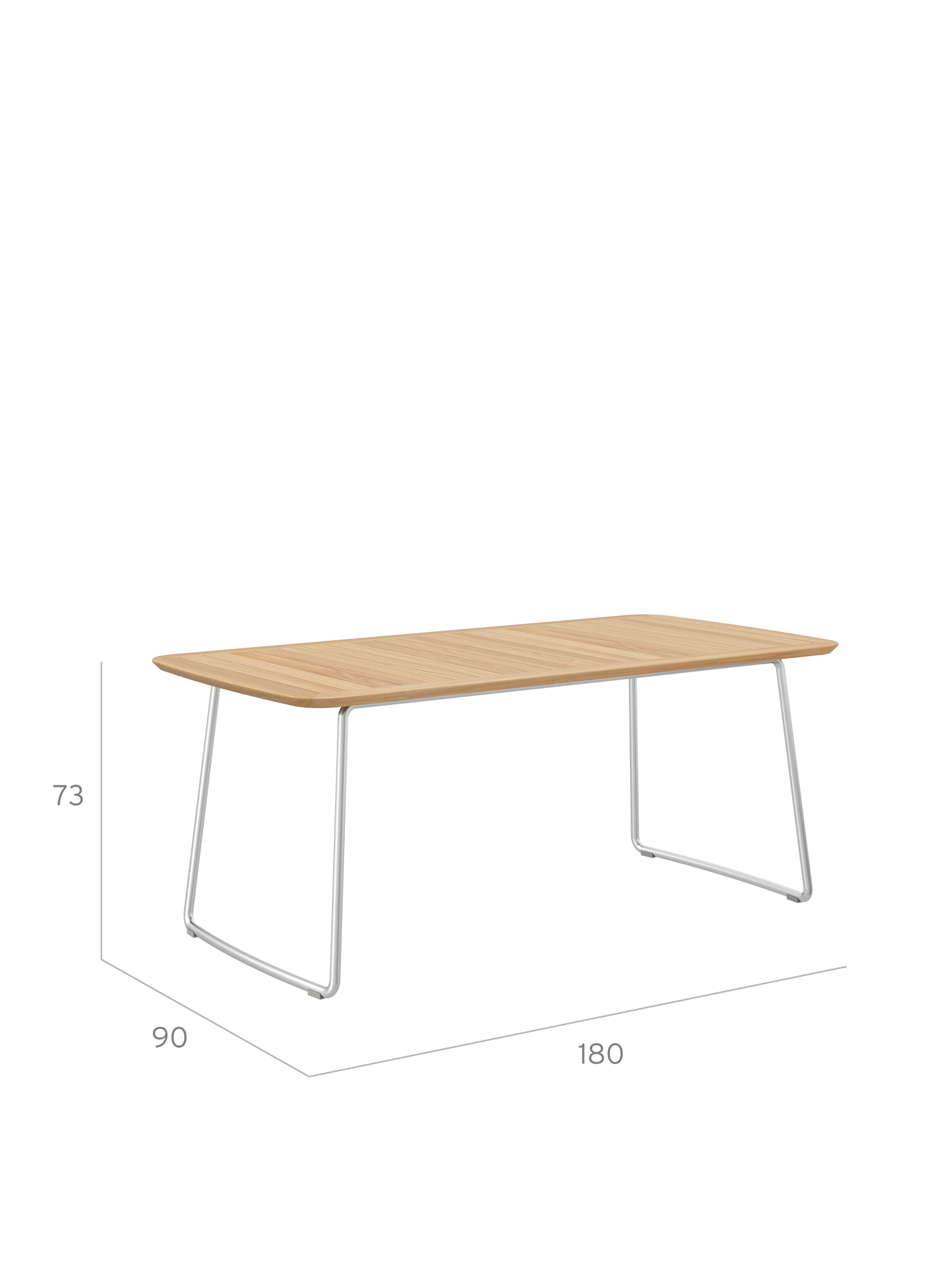 Die schlanke Tischplatte aus eng stehenden Teakholzleisten ist von einem Rahmen mit sorgfältig gerundeten Kanten eingefasst. Auch die geschwungenen Edelstahlkufen des Esstisches fügen sich harmonisch in das Gesamtbild der Amari Serie ein. Die passenden Armlehnstühle können einfach unter den Tisch geschoben werden.