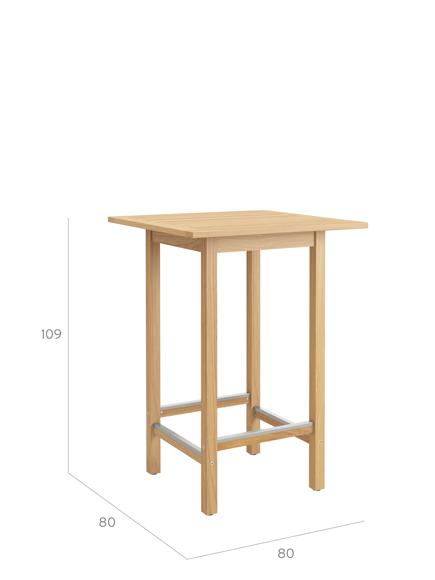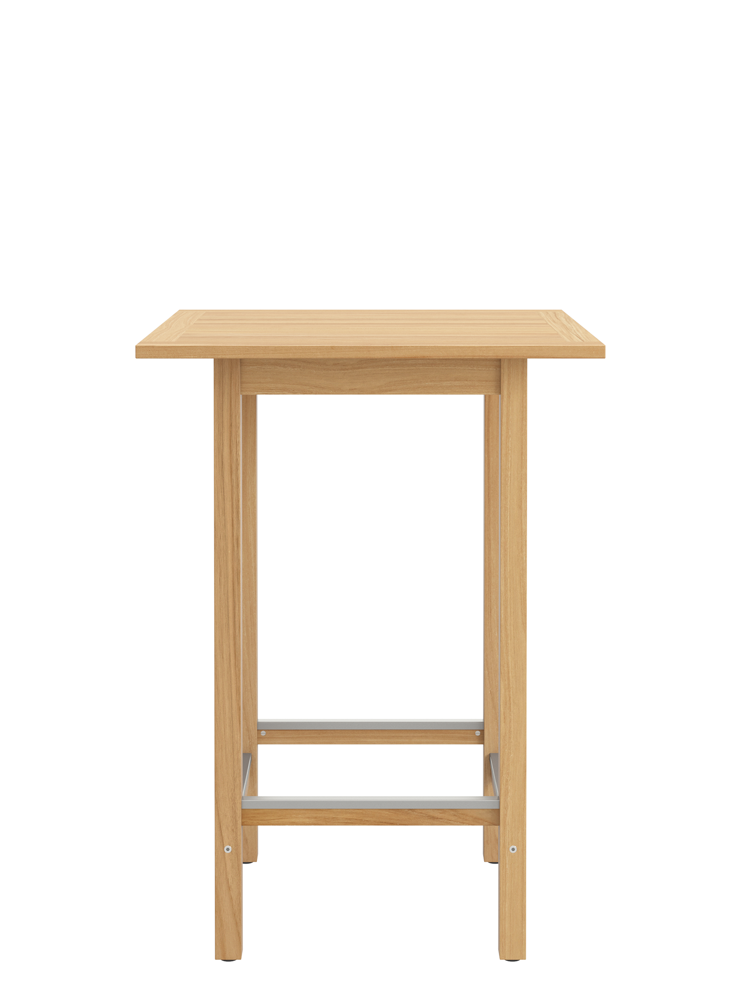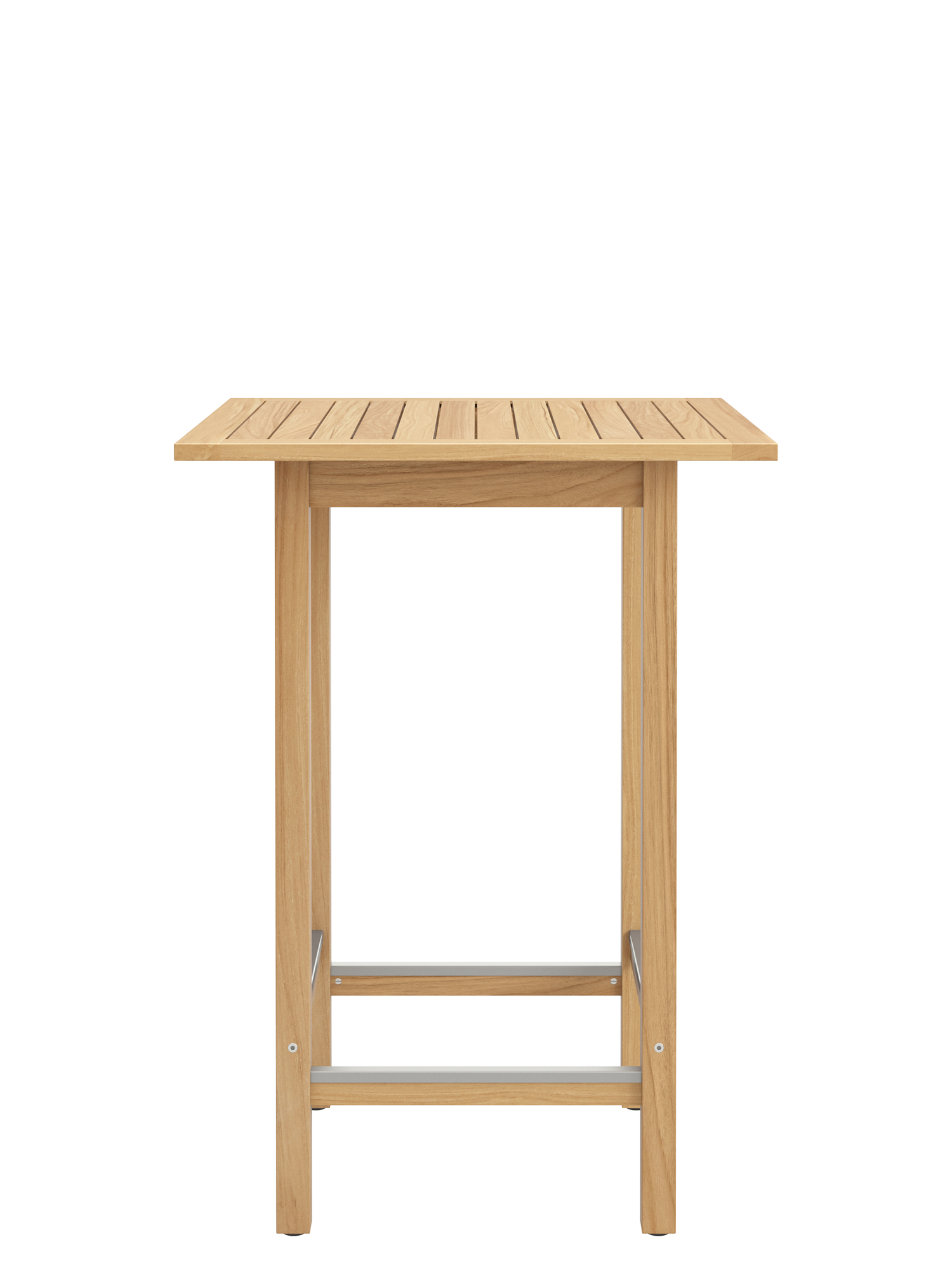 Im reduzierten Design offenbart sich gediegenes Handwerk – starkes Material, ergonomisch geformte Leisten, solide Verbindungen. Ob schneller Imbiss oder gesellige Happy Hour: Der hohe Bartisch aus wetterfestem Teak lädt ein zum legeren Treff auf Balkon oder Terrasse. Die Stege an Tisch und passendem Hocker werden durch Aluminiumprofile geschützt und geben den Füßen Halt.