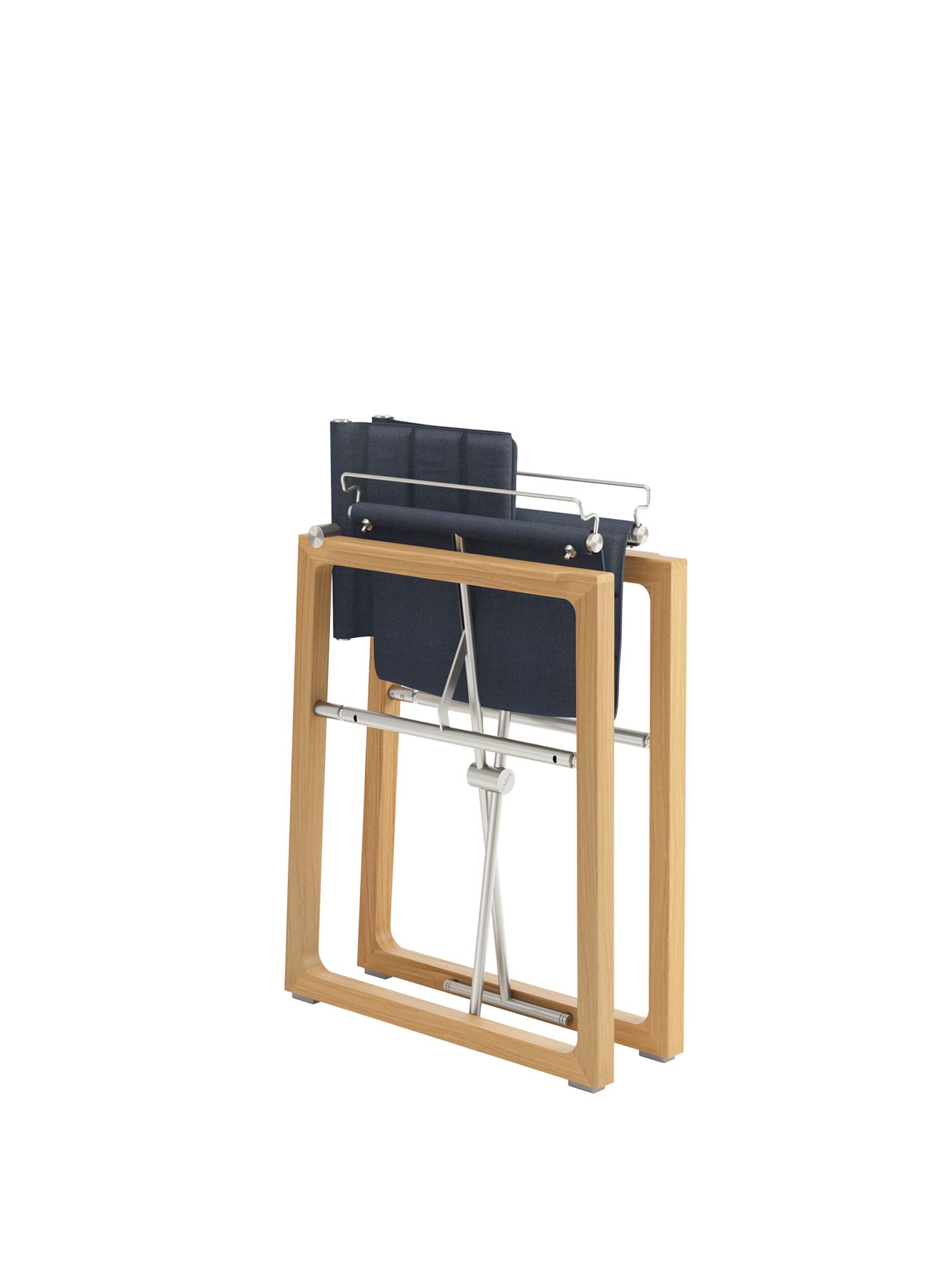 Arretiert werden die klappbaren Armlehnstühle mit schmalen Bügeln seitlich der Sitze; zusammengeklappt beanspruchen sie wenig Platz.