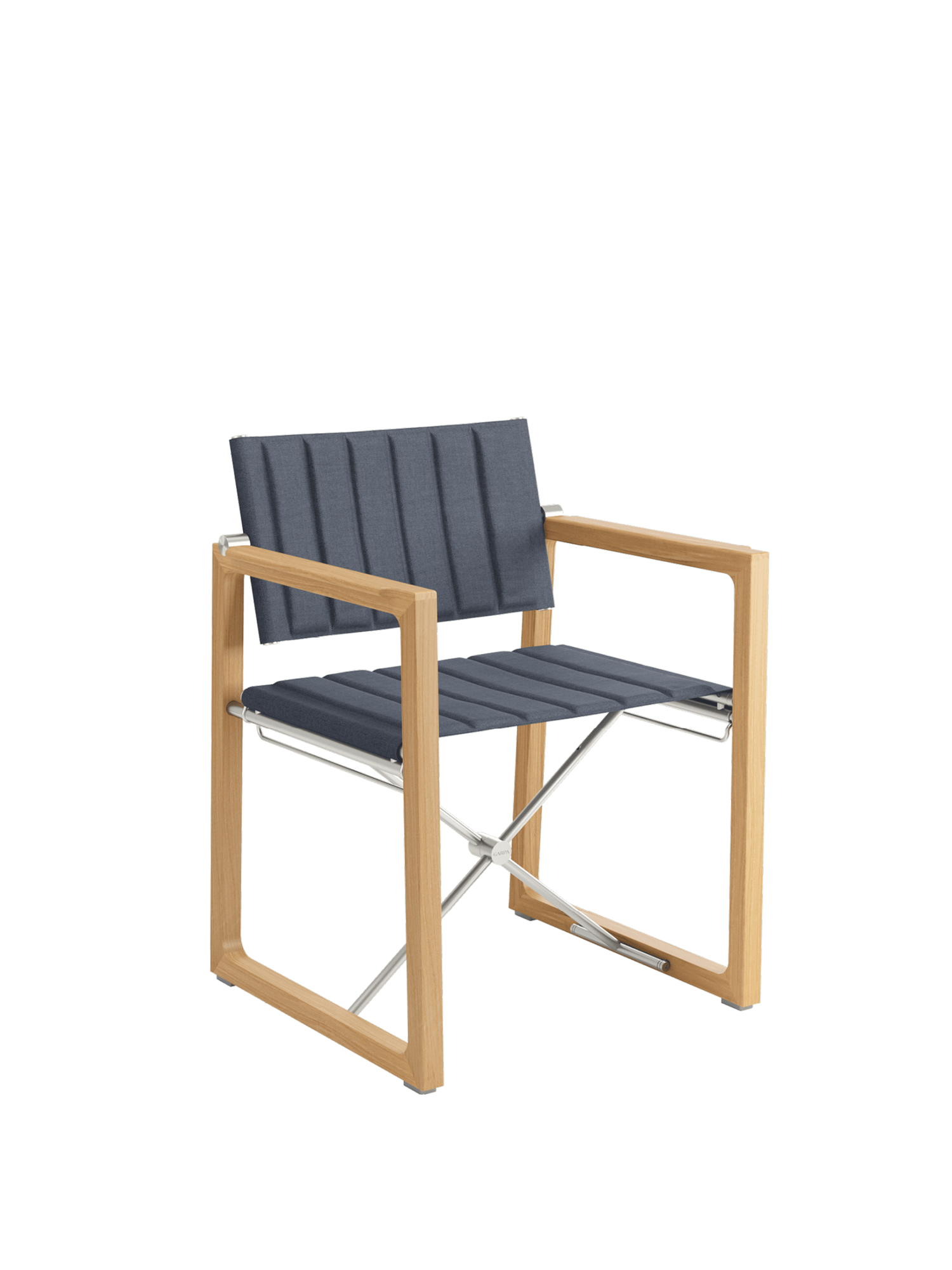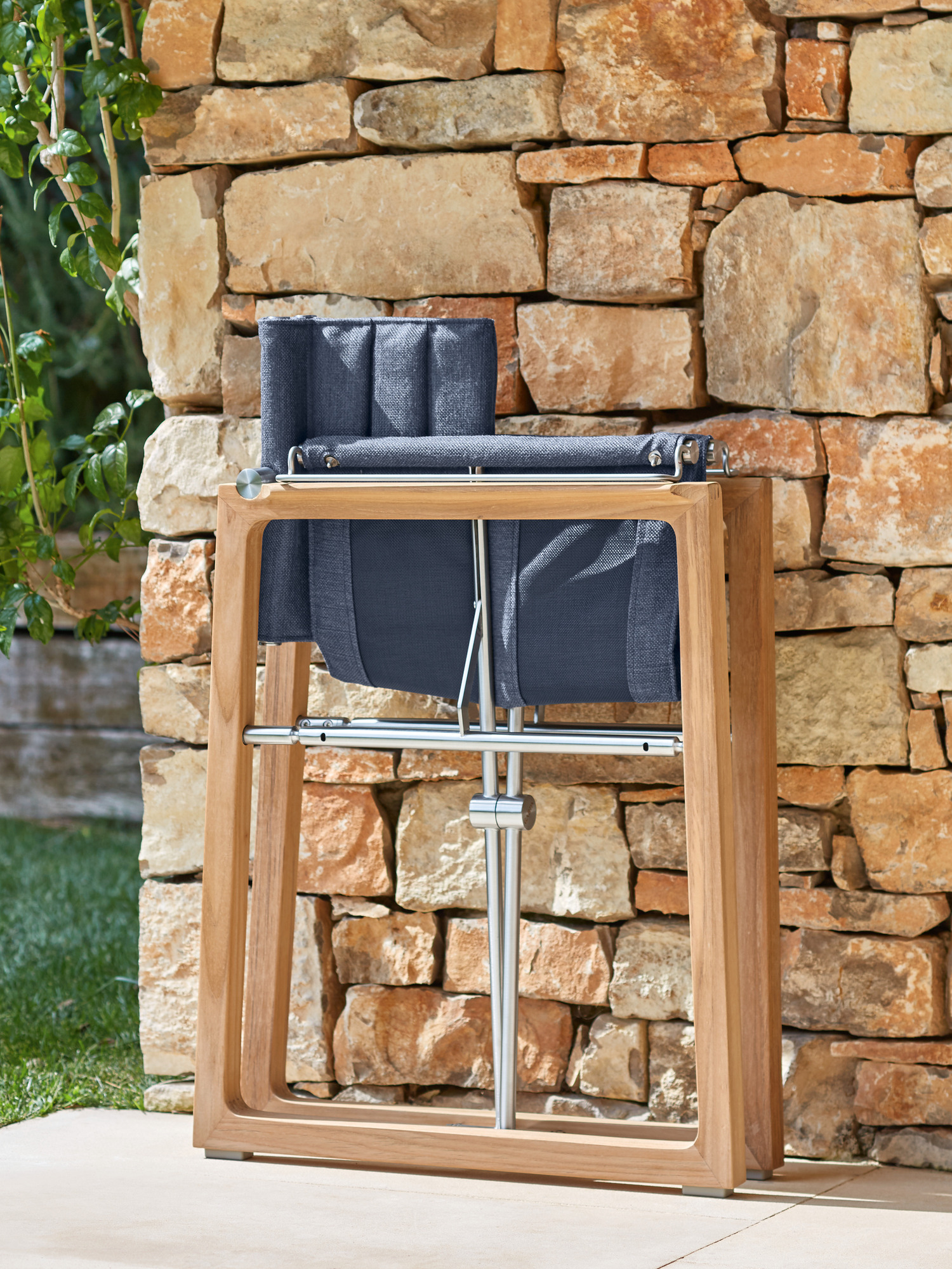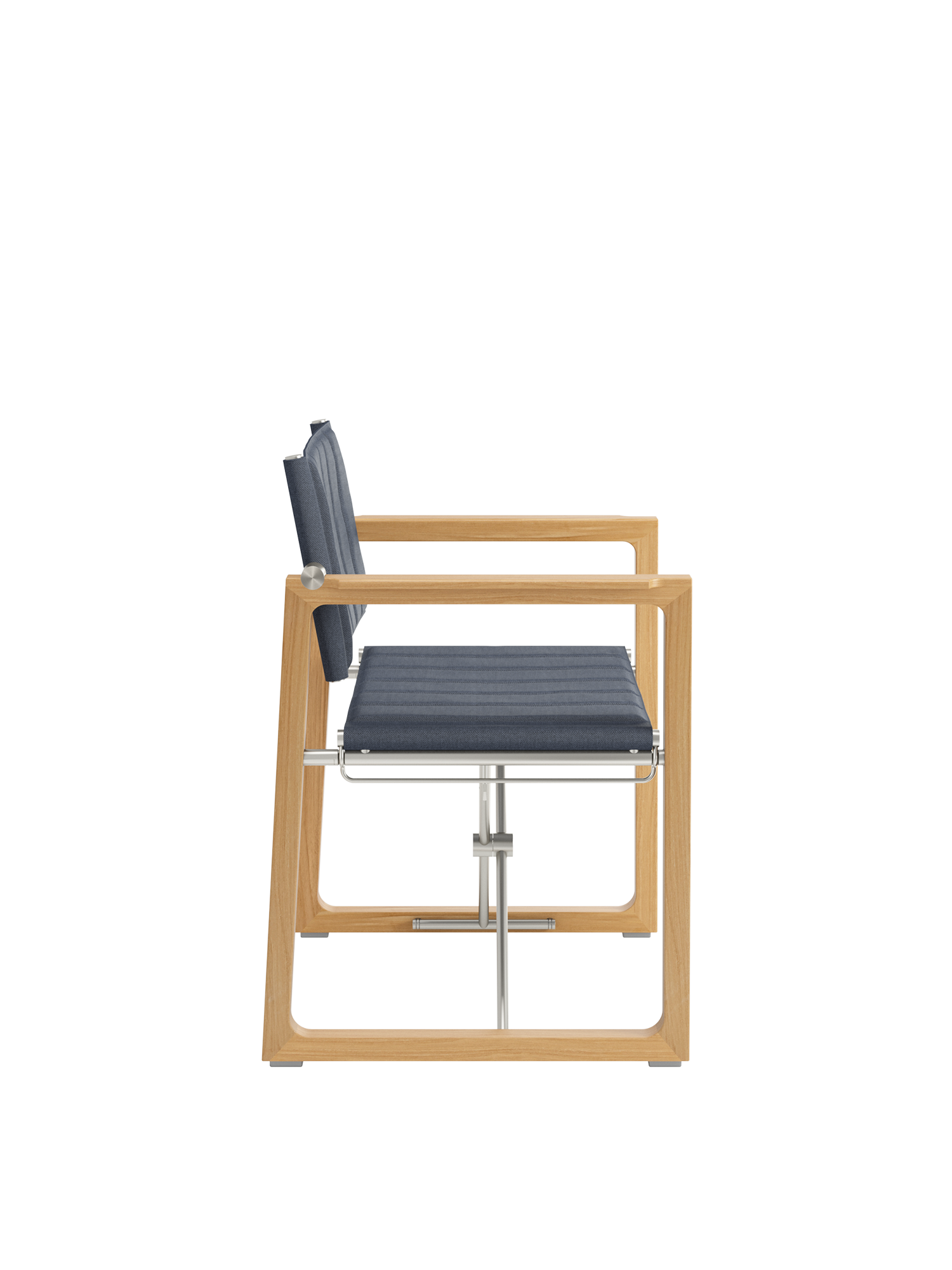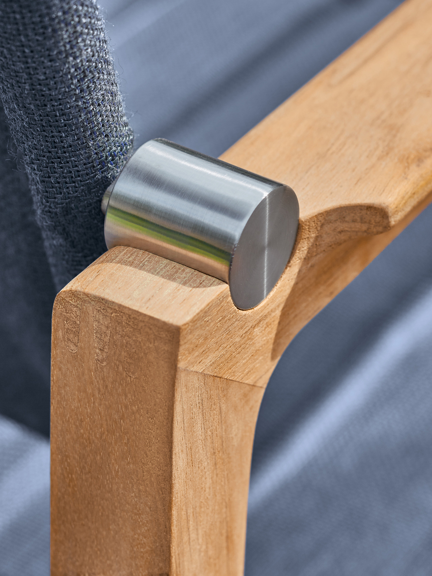 Die modernen Armlehnstühle verbreiten ein unbeschwertes Lebensgefühl. Geradlinige Teakholzwangen rahmen Sitz- und Rückenpolster; ein Edelstahlkreuz verbindet die puristische, dabei äußerst komfortable Konstruktion. Aus satiniertem Edelstahl sind auch die Gelenke, die die Rückenlehne in die bequemste Position bringen.