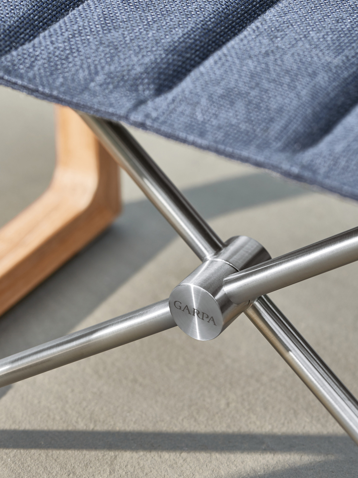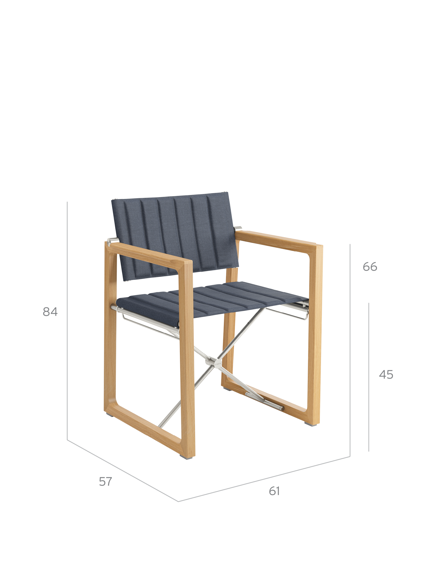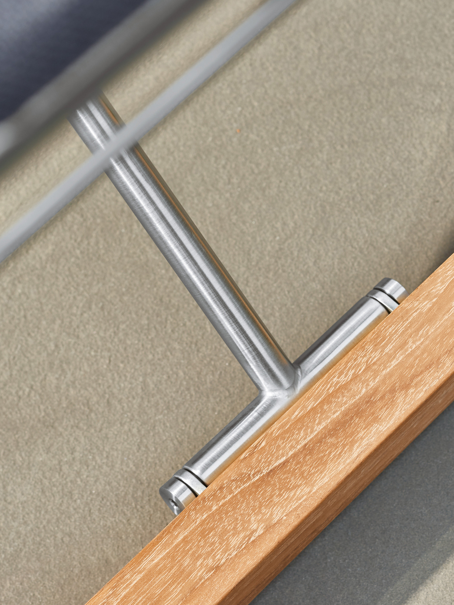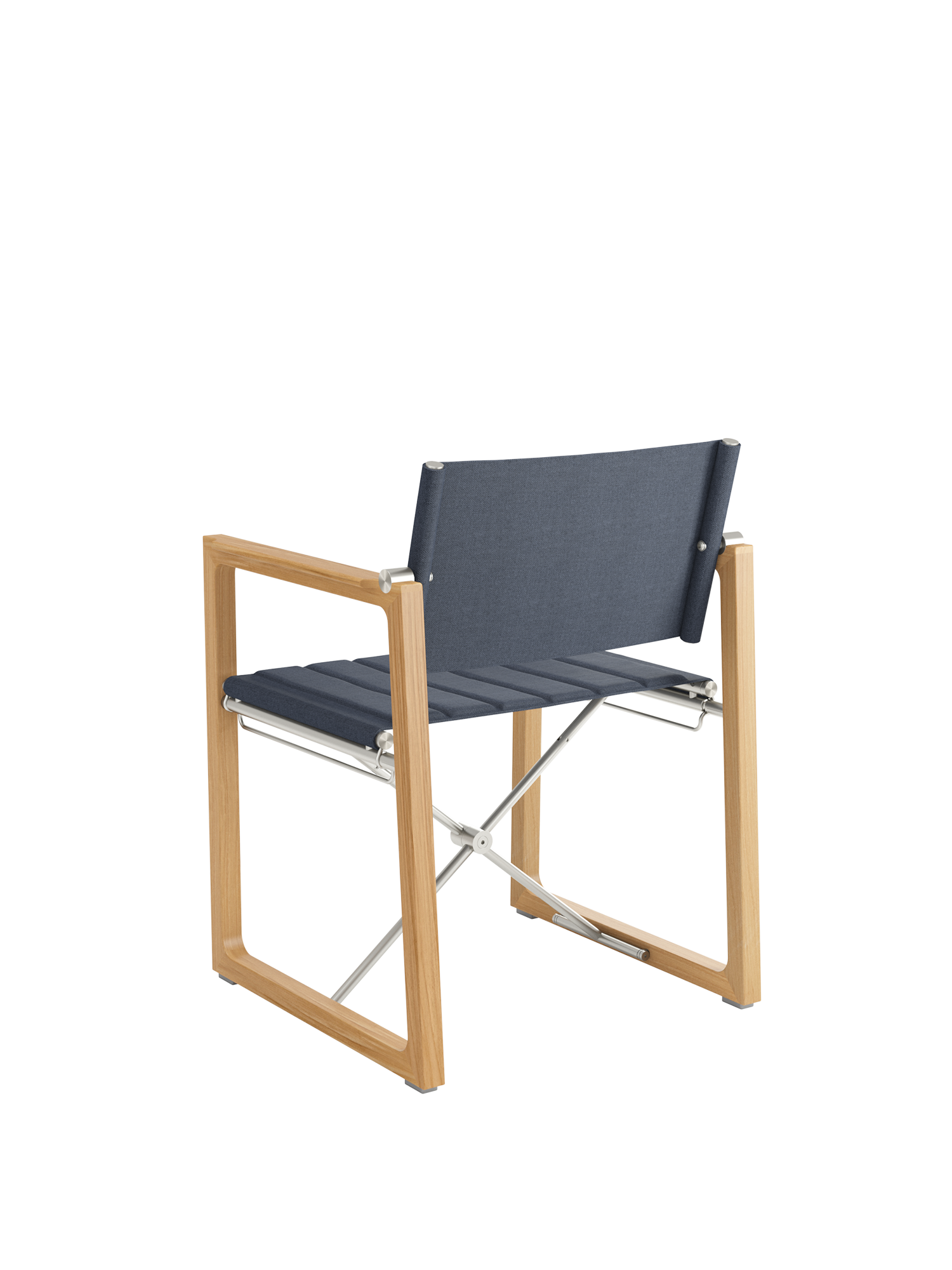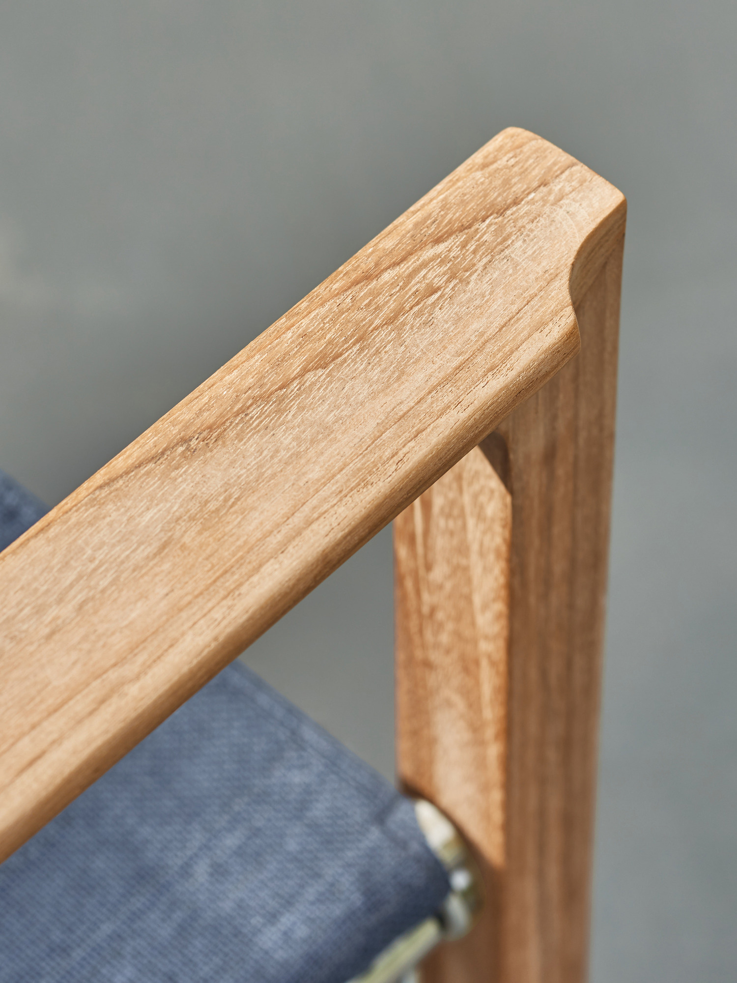 Die modernen Armlehnstühle verbreiten ein unbeschwertes Lebensgefühl. Geradlinige Teakholzwangen rahmen Sitz- und Rückenpolster; ein Edelstahlkreuz verbindet die puristische, dabei äußerst komfortable Konstruktion. Aus satiniertem Edelstahl sind auch die Gelenke, die die Rückenlehne in die bequemste Position bringen.