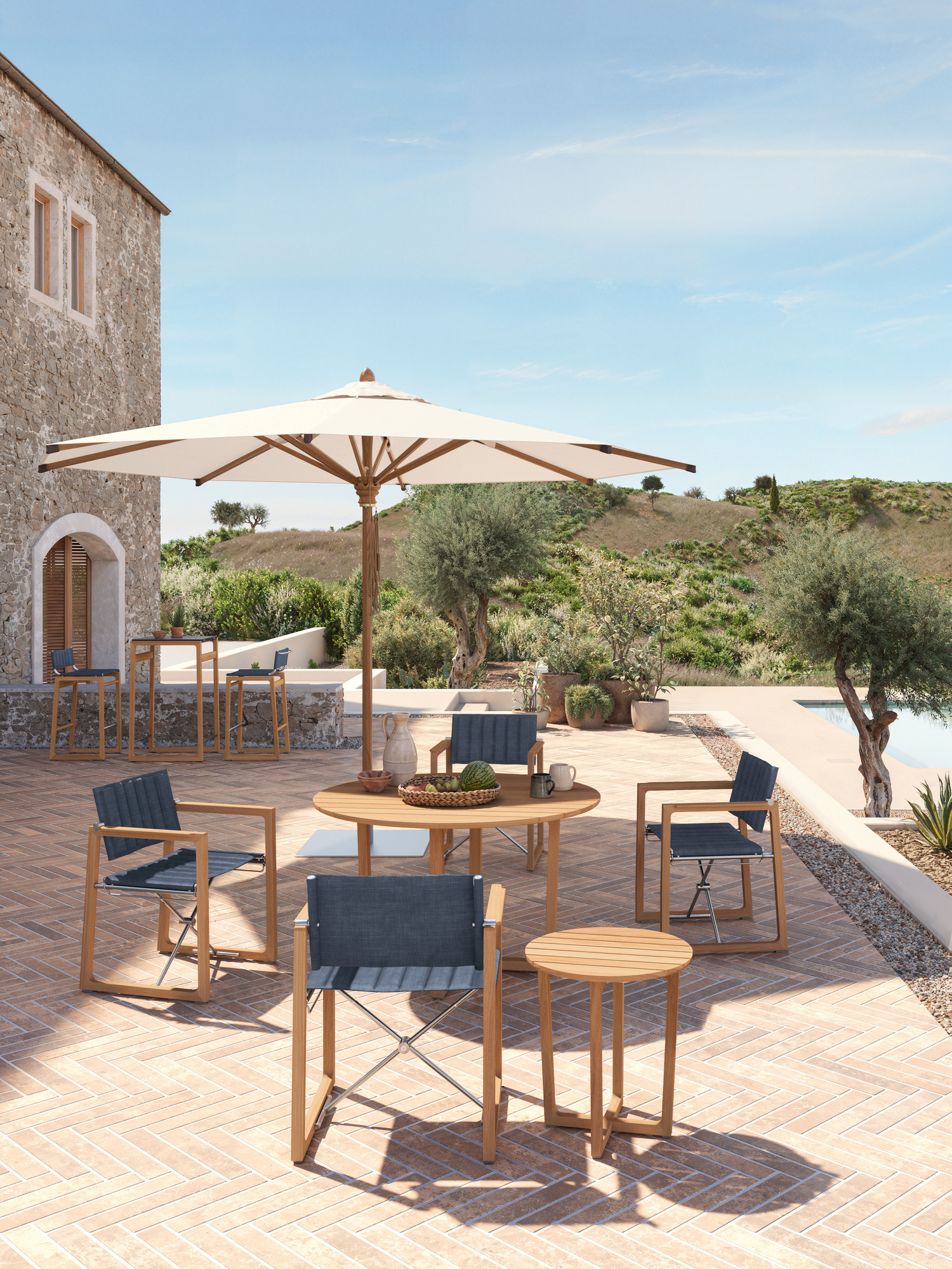 Teakholzwangen und Edelstahlkreuz prägen auch das Design der Benton Tische, deren Leisten an der Unterseite geschmeidig gerundet sind, was optisch und haptisch für einen angenehmen Effekt sorgt. Die eleganten Tische aus massivem und aufwendig verarbeitetem Plantagenteakholz sind in vier verschiedenen Größen und in runder oder eckiger Form erhältlich.