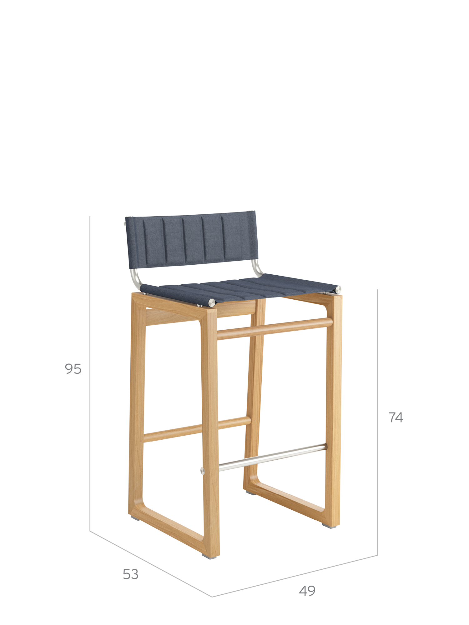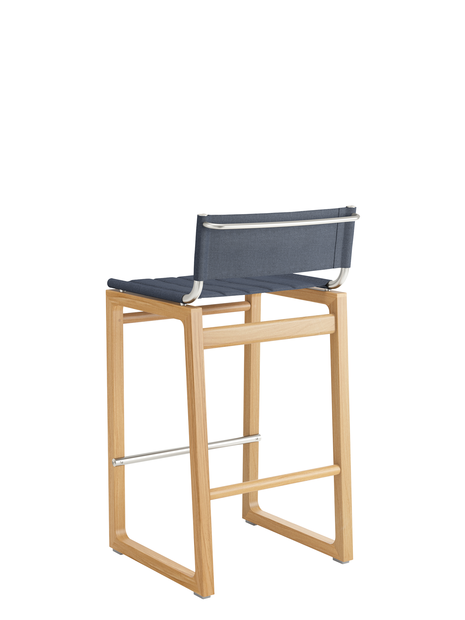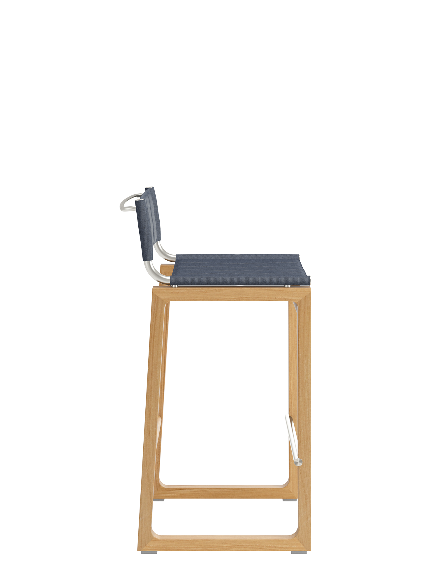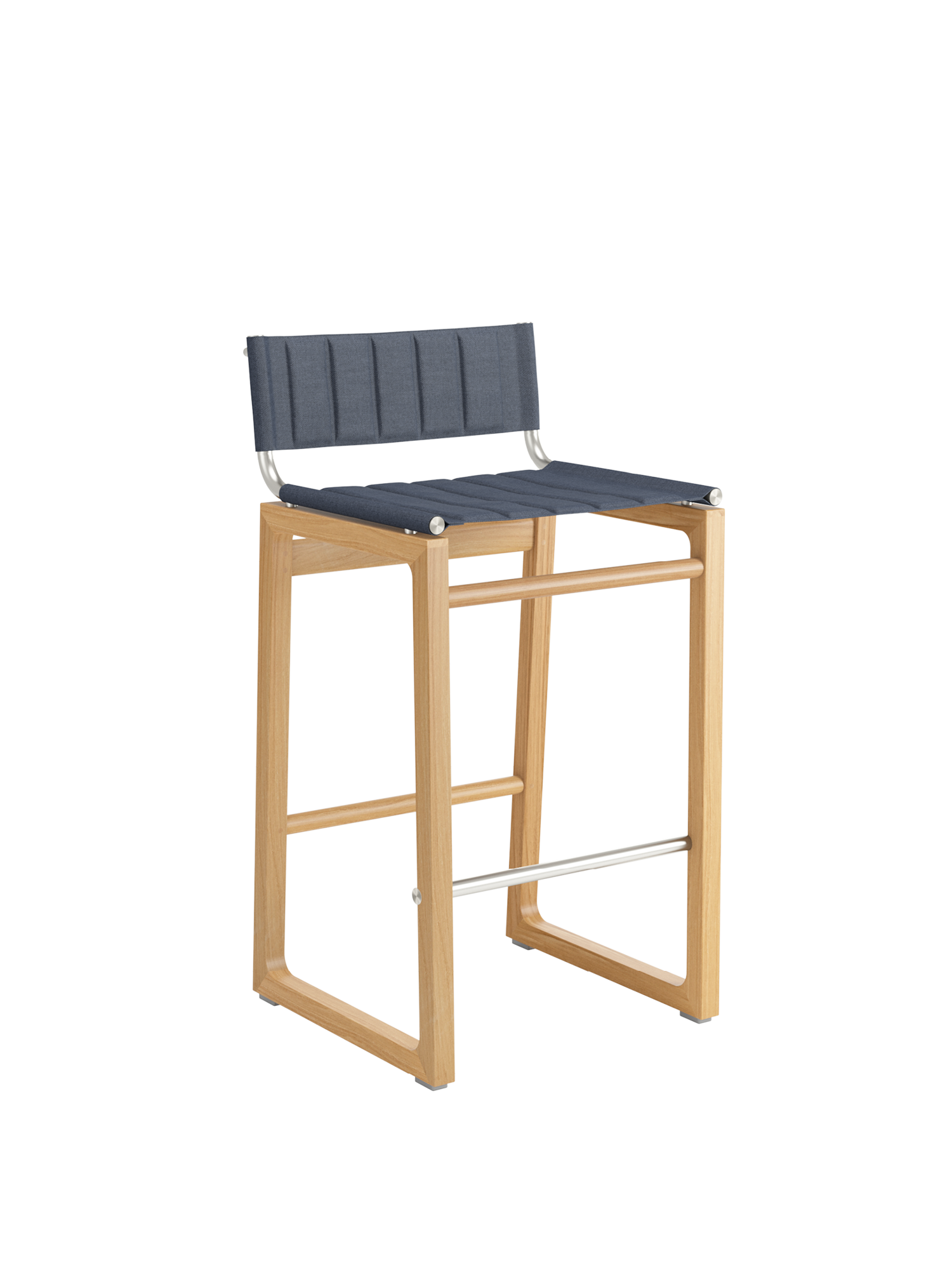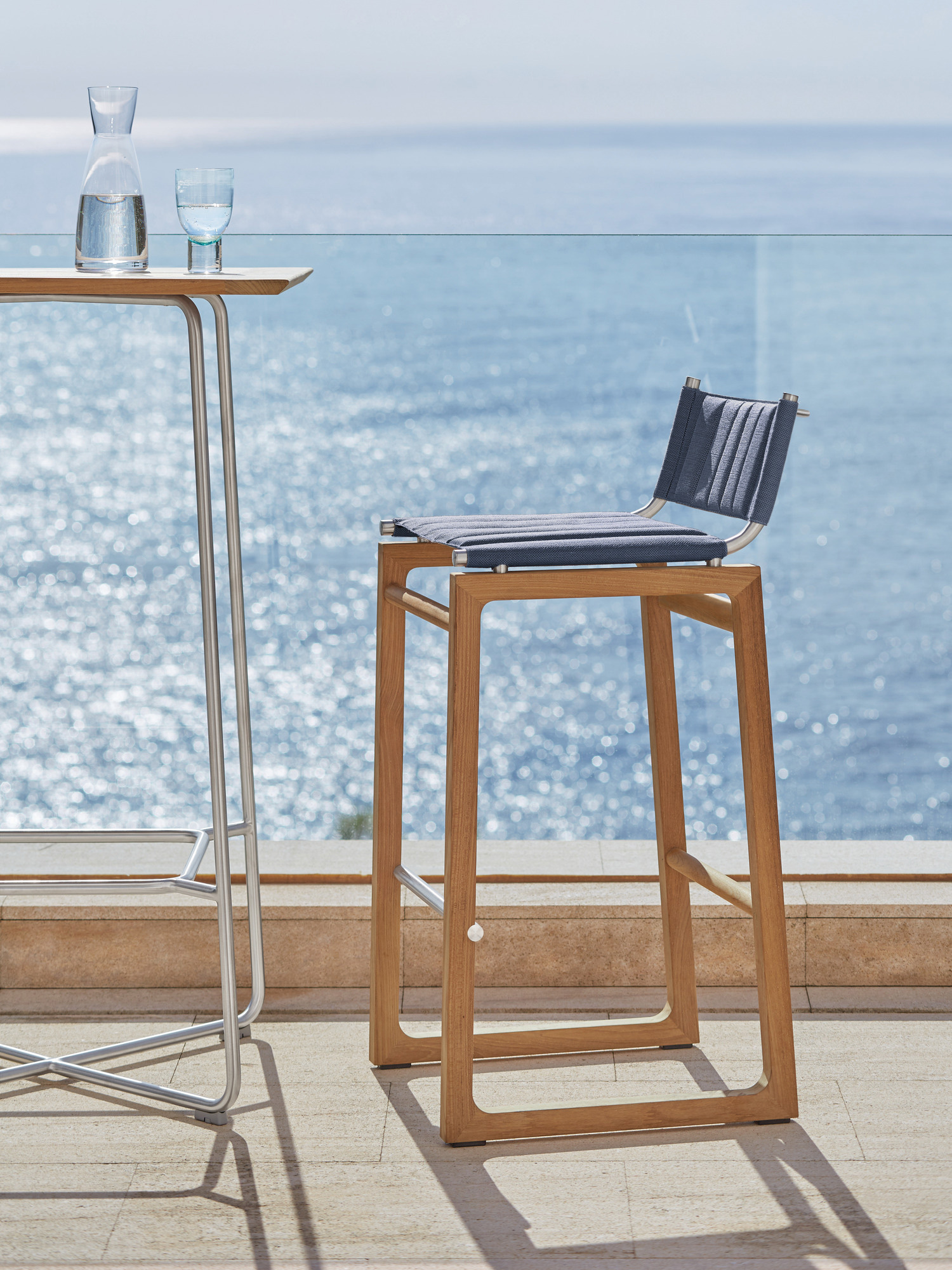 Sitz und gepolsterte Rückenlehne der puristischen Barhocker sorgen für schnörkellosen Komfort, eine Edelstahlleiste zwischen den markanten Teakwangen gibt den Füßen Halt. Am passenden quadratischen Bartisch mit Teakholzplatte finden bis zu vier Hocker Platz.