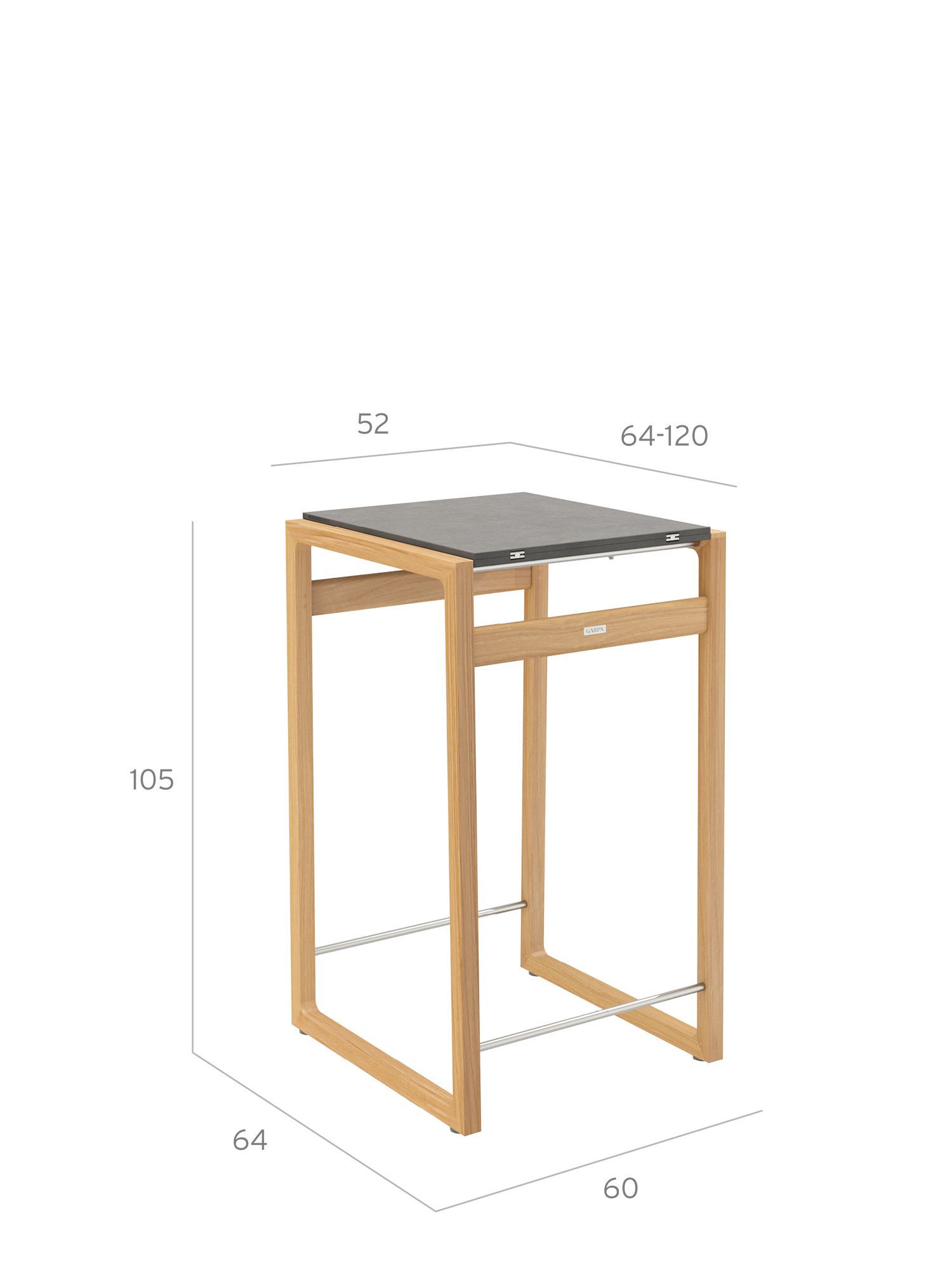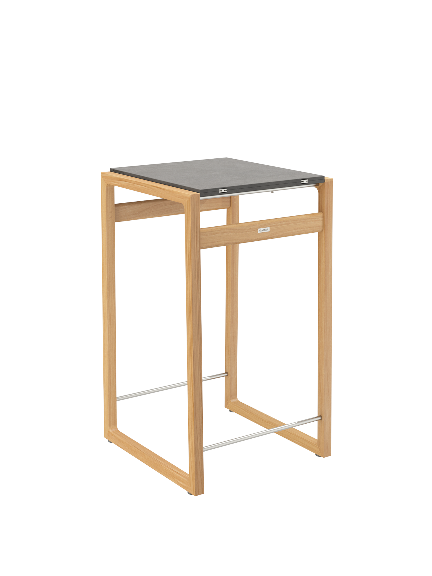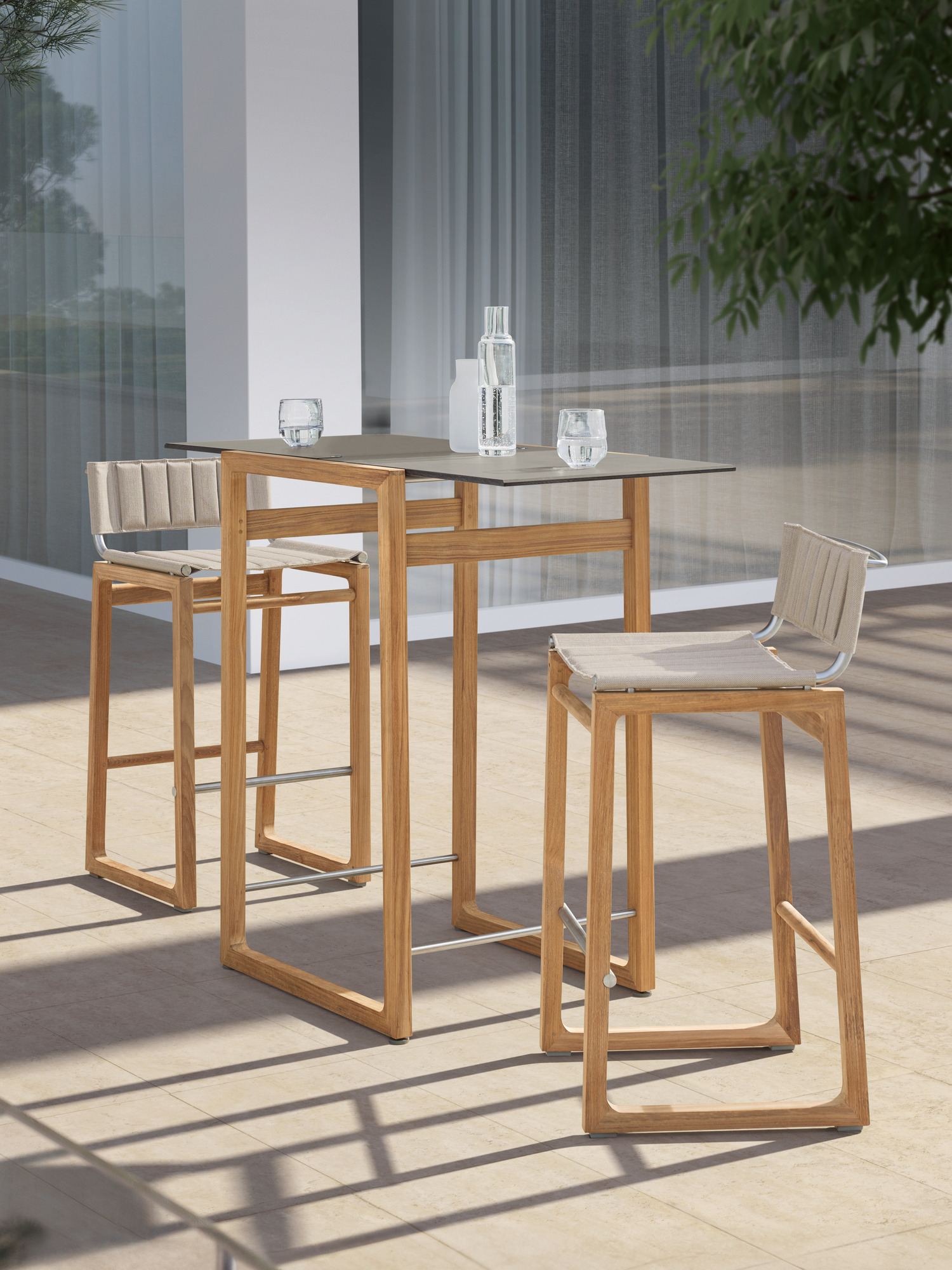 Am Benton Bartisch, der sich intuitiv ausklappen lässt, finden bis zu vier Personen Platz – auf den überaus komfortablen Barhockern der Kollektion oder im Stehen. Im nicht ausgeklappten Zustand schließt die Tischplatte – in klassischer Benton Manier – mit den Maßen des Untergestells ab. Der Bartisch eignet sich nicht nur für Getränke im Freien, sondern auch für ein exquisites Dinner zu zweit.