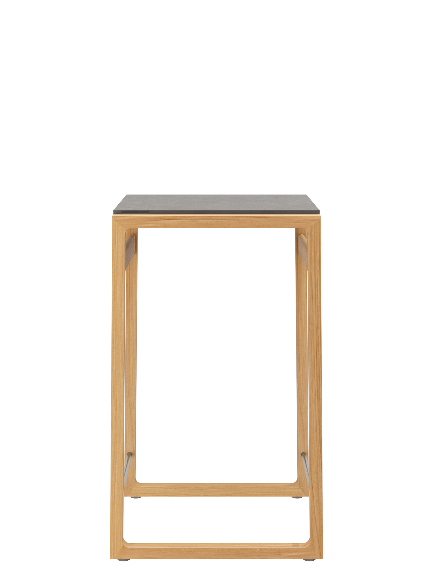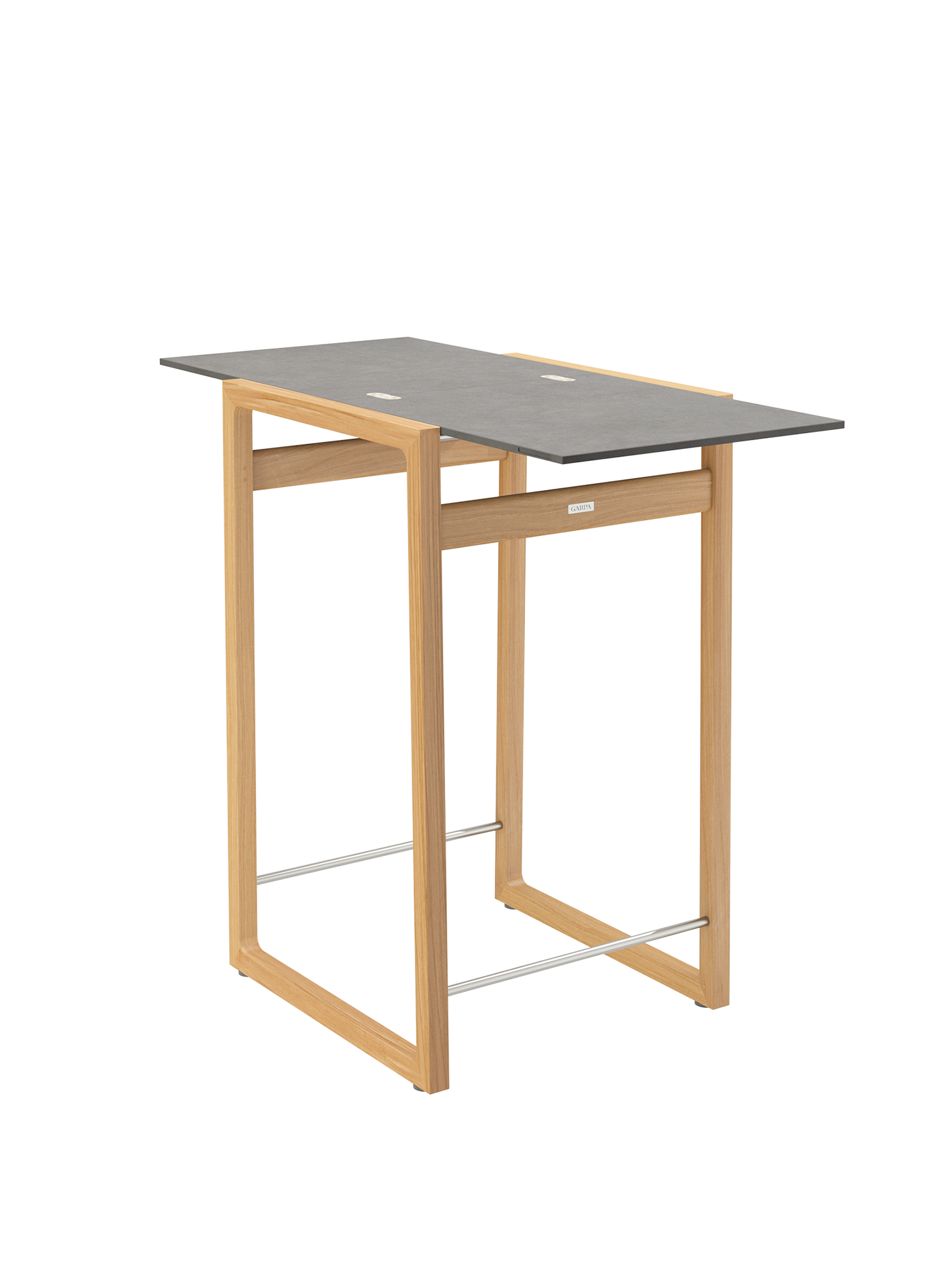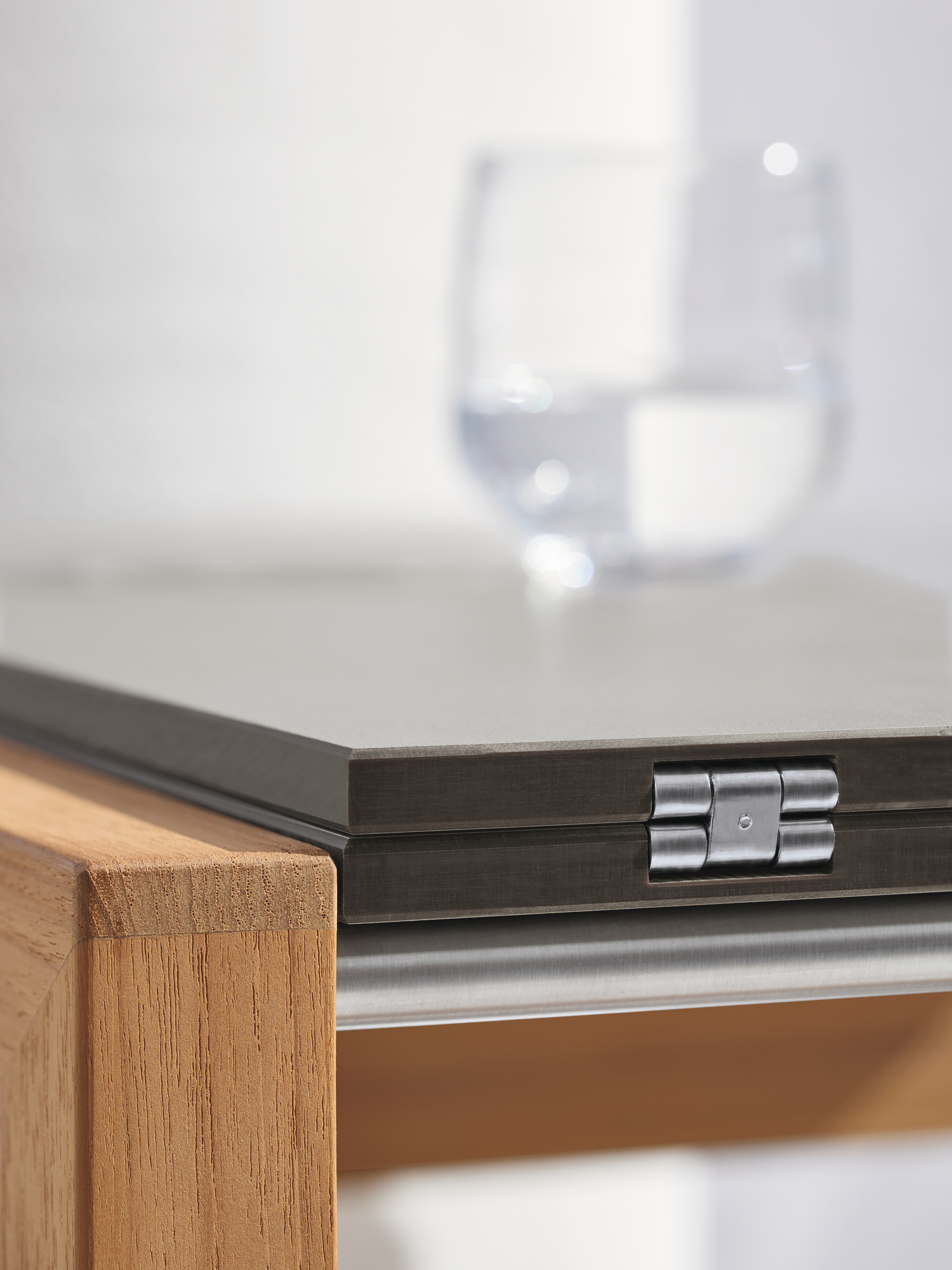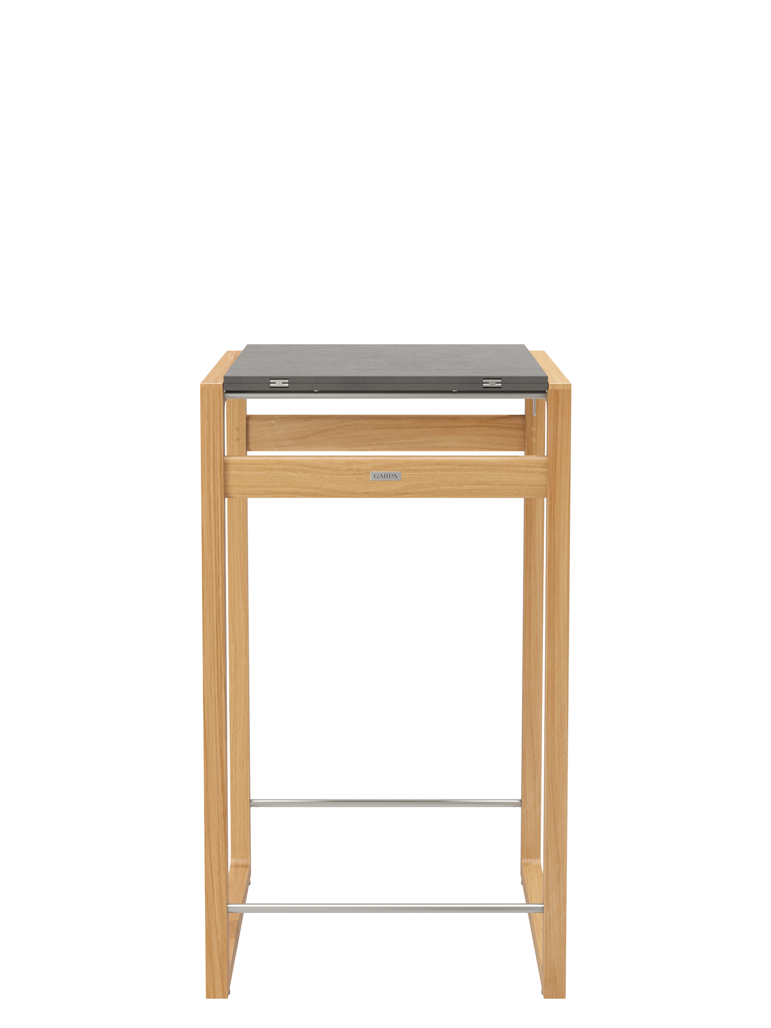 Am Benton Bartisch, der sich intuitiv ausklappen lässt, finden bis zu vier Personen Platz – auf den überaus komfortablen Barhockern der Kollektion oder im Stehen. Im nicht ausgeklappten Zustand schließt die Tischplatte – in klassischer Benton Manier – mit den Maßen des Untergestells ab. Der Bartisch eignet sich nicht nur für Getränke im Freien, sondern auch für ein exquisites Dinner zu zweit.