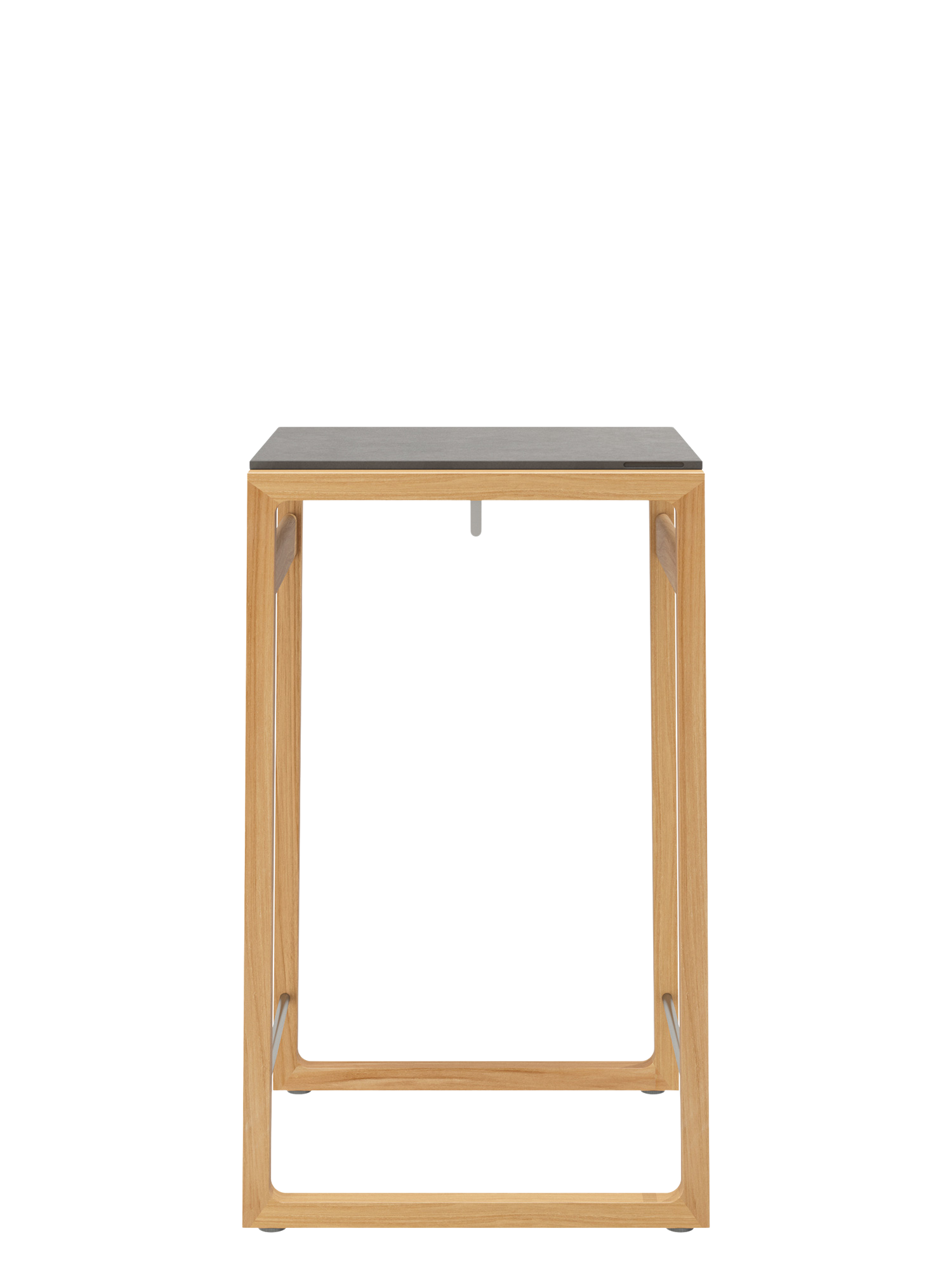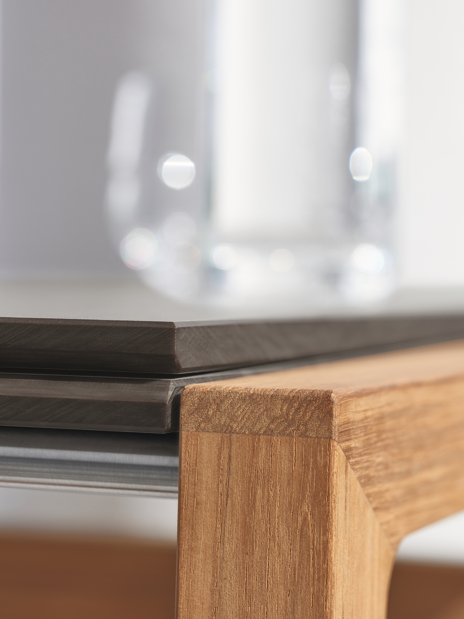 Das Gestell aus hochwertigem Teakholz harmoniert mit der Tischplatte aus pflegeleichtem Kunstharz. Auf den Streben aus Edelstahl können die Füße abgestellt werden.