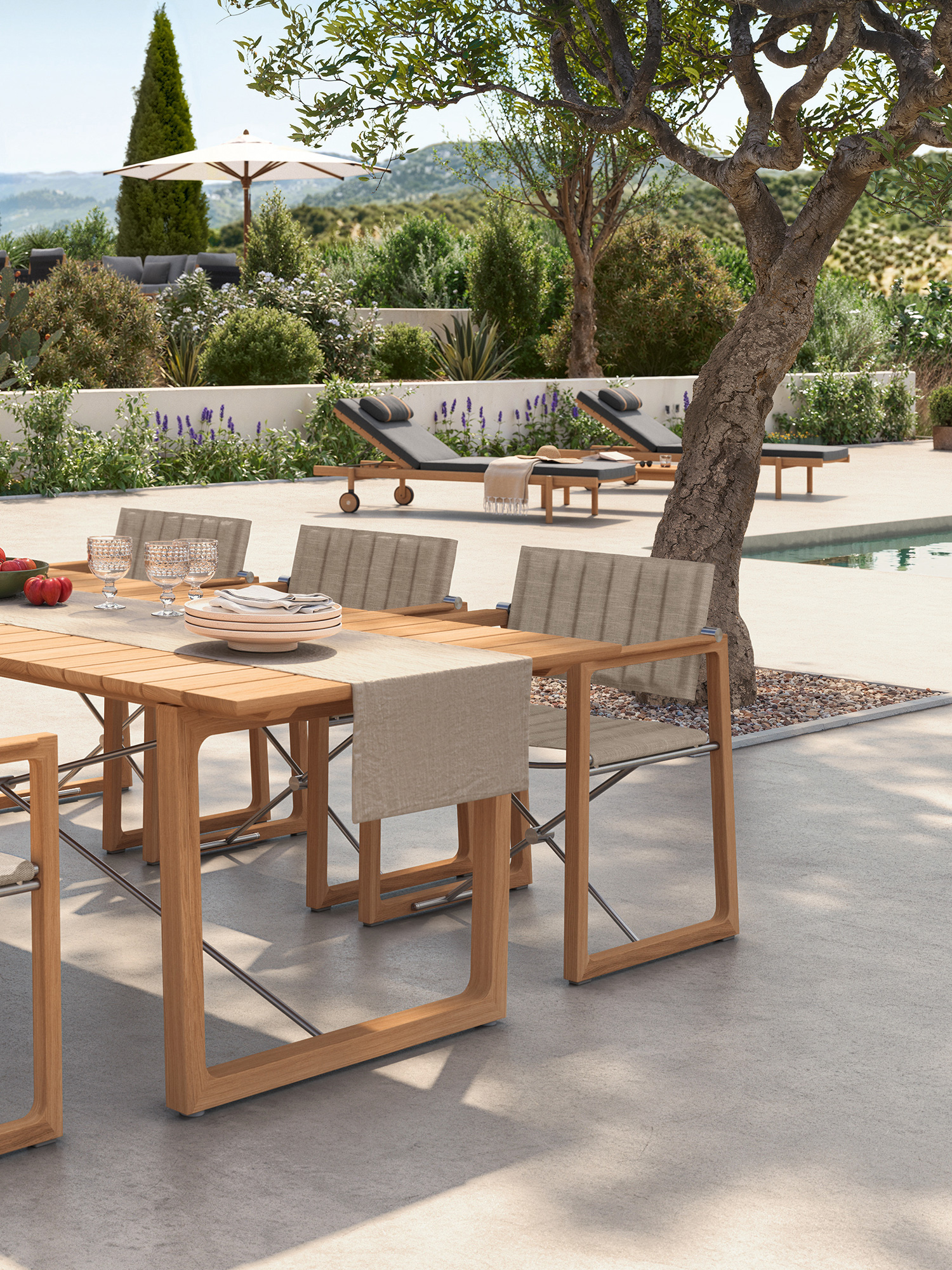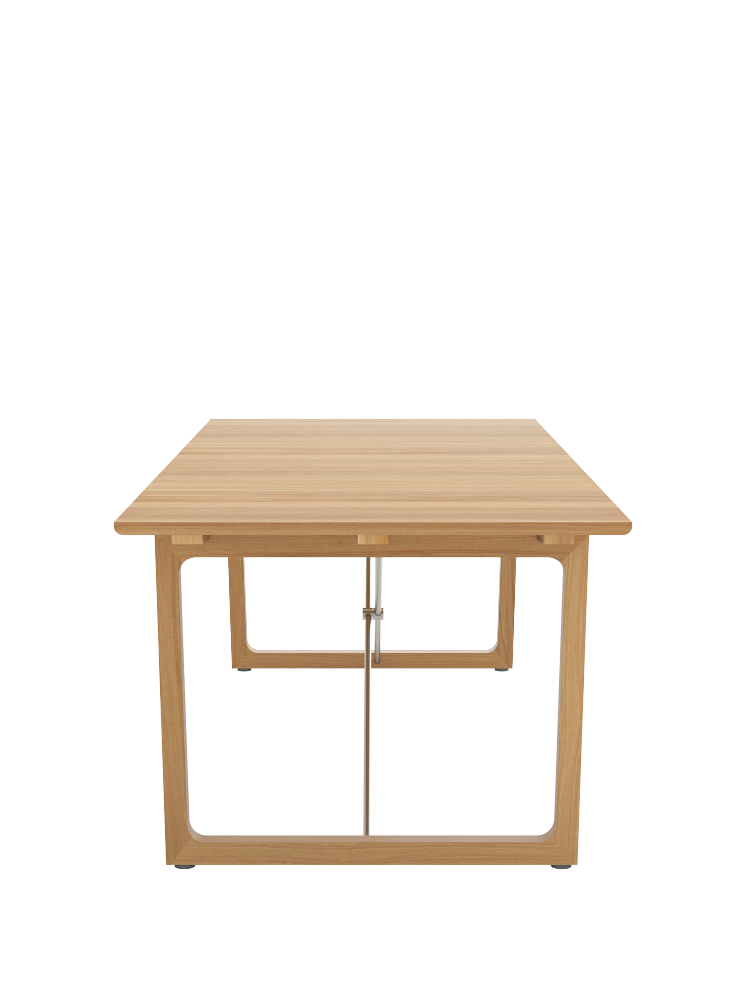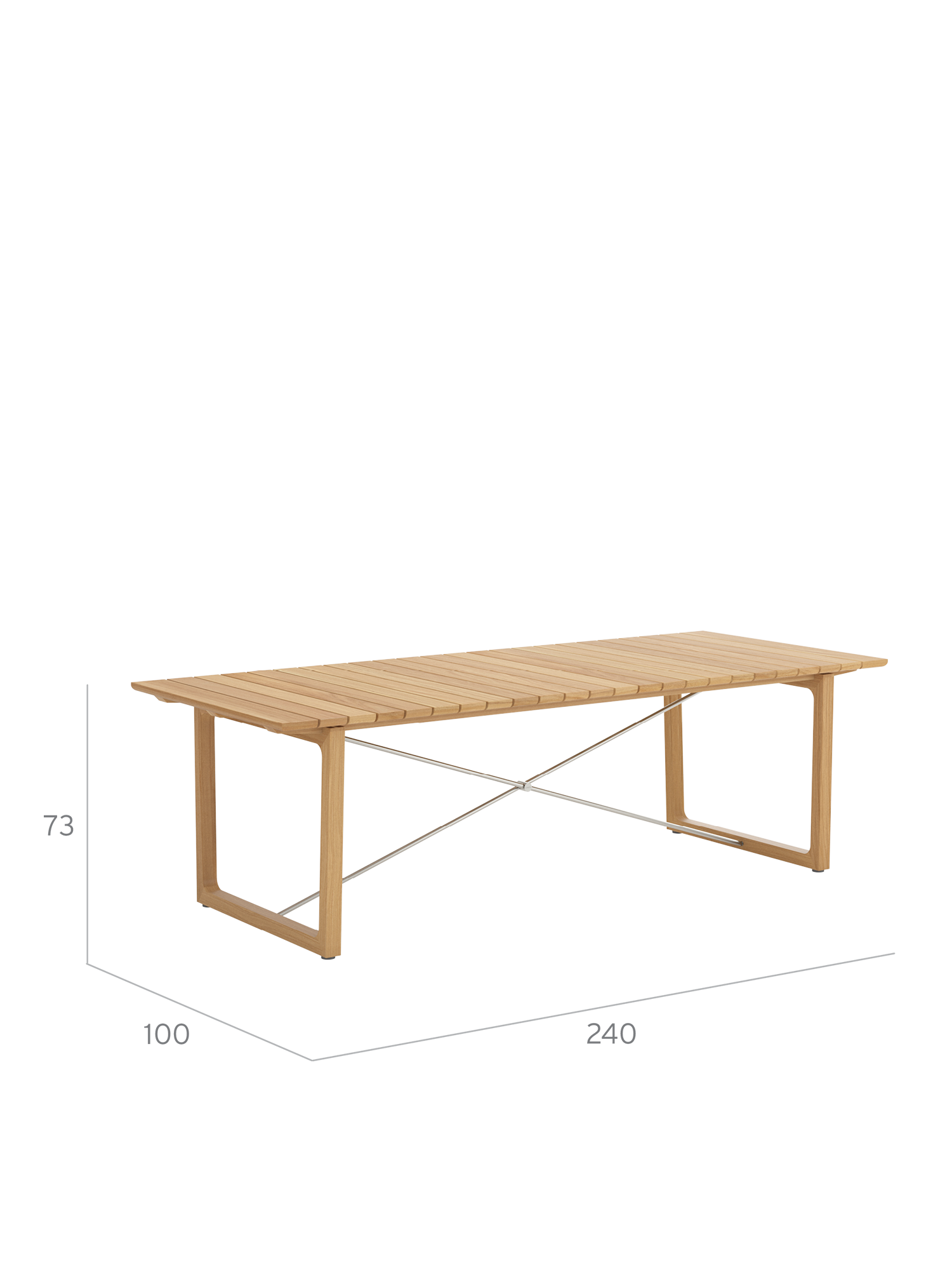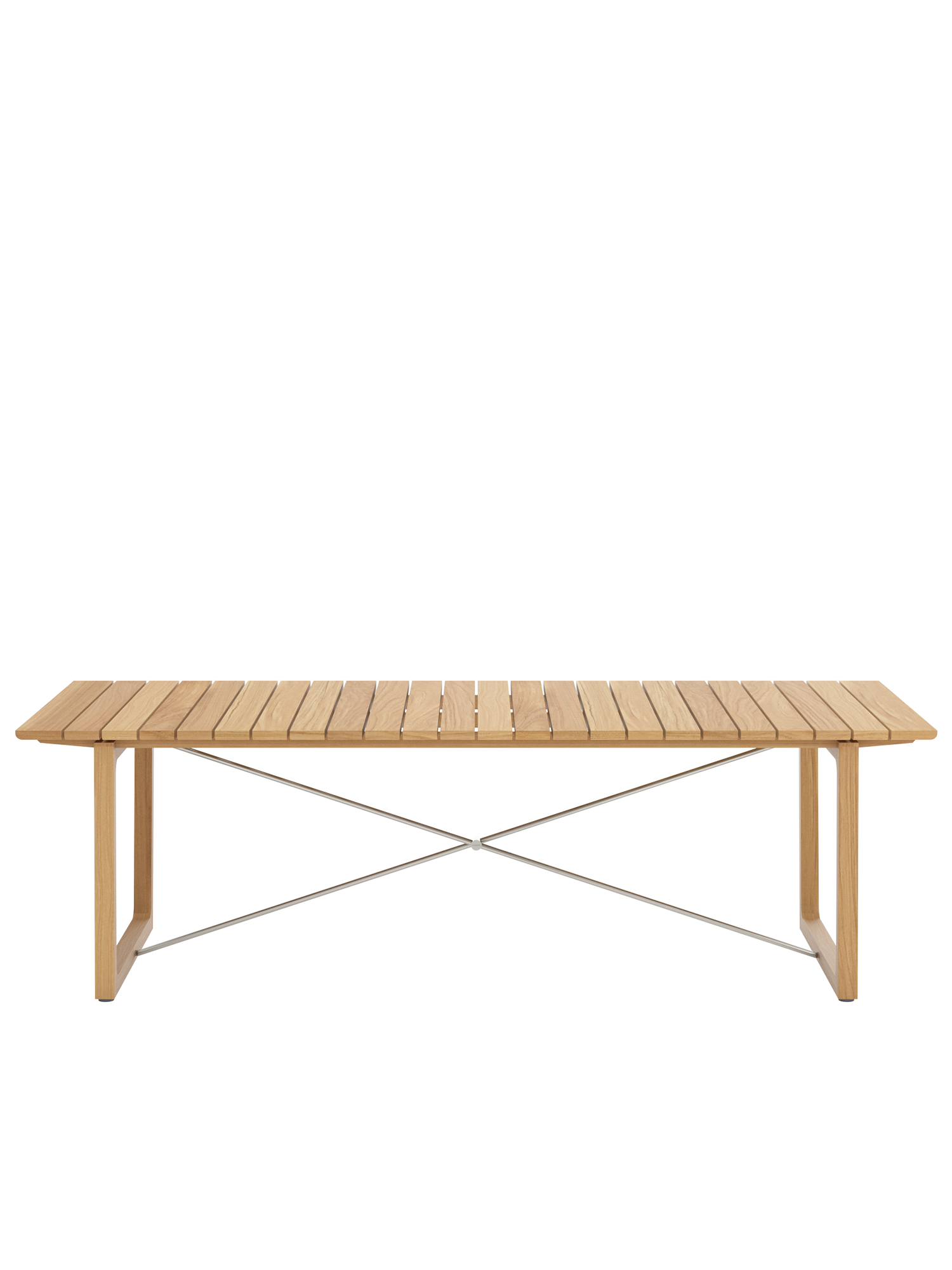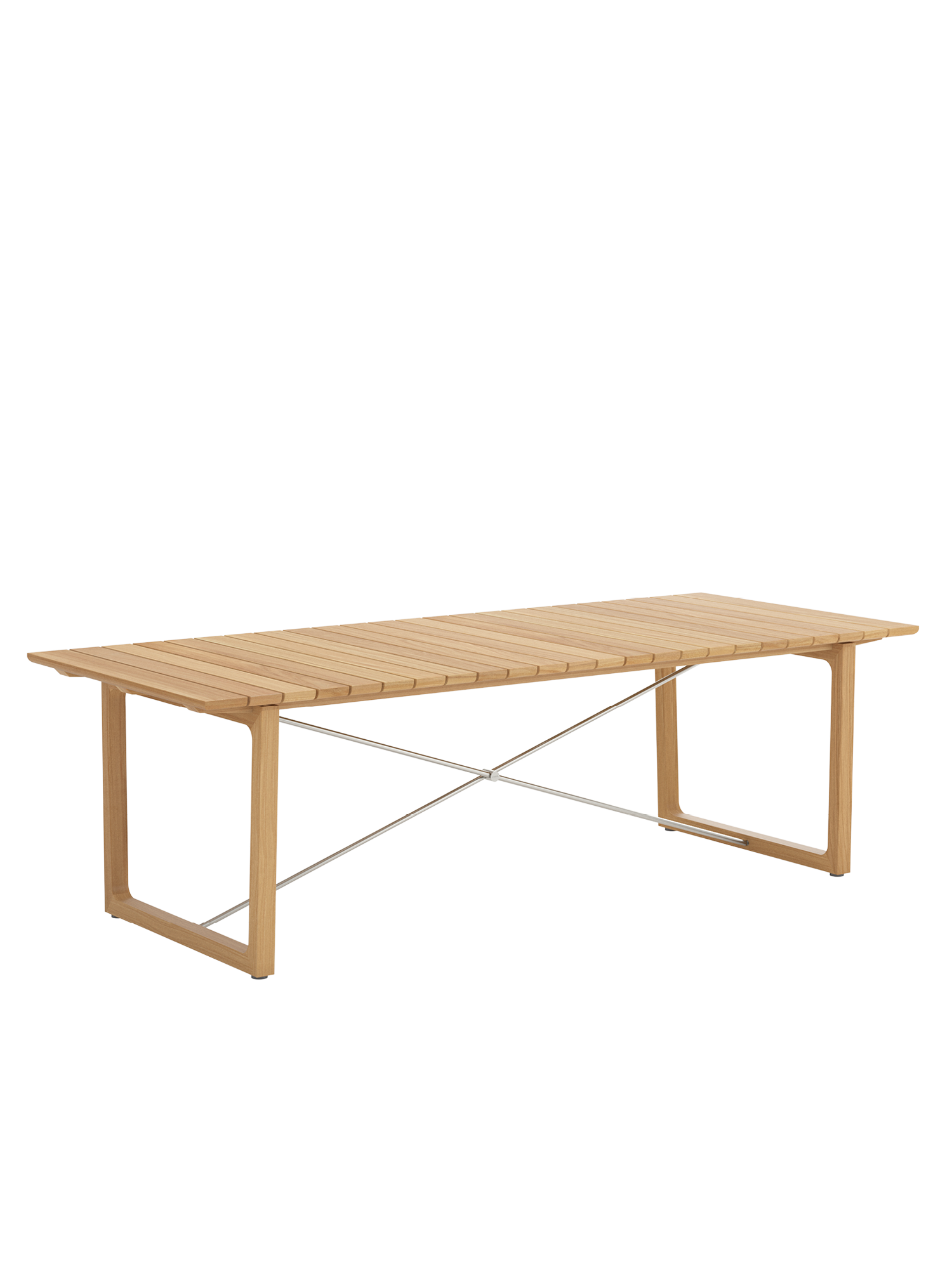 Teakholzwangen und Edelstahlkreuz prägen das Design der rechteckigen Benton Tische, deren Leisten an der Unterseite geschmeidig gerundet sind, was optisch und haptisch für einen angenehmen Effekt sorgt. Die eleganten Tische aus massivem und aufwendig verarbeitetem Plantagenteakholz sind in zwei verschiedenen Größen erhältlich.