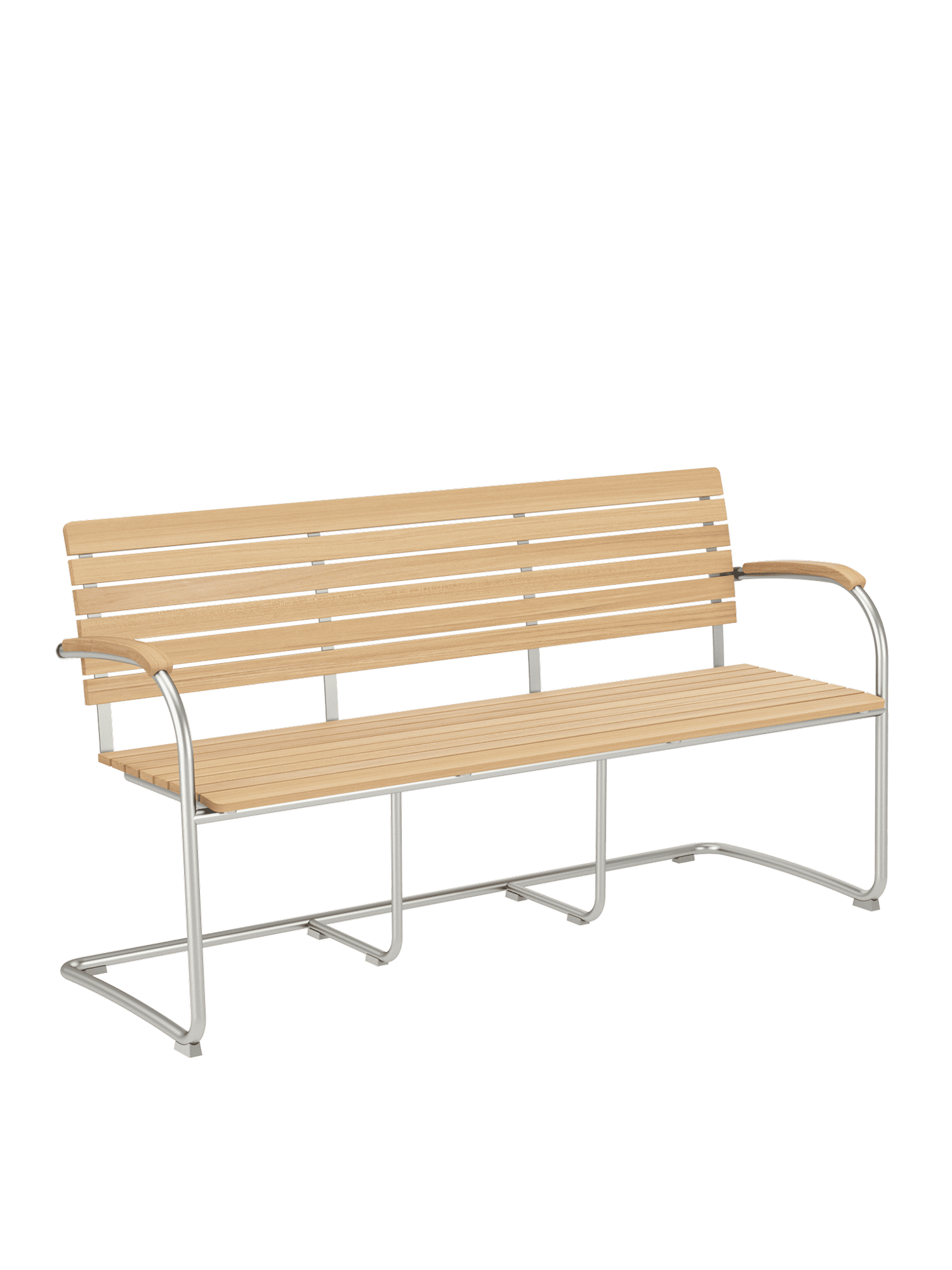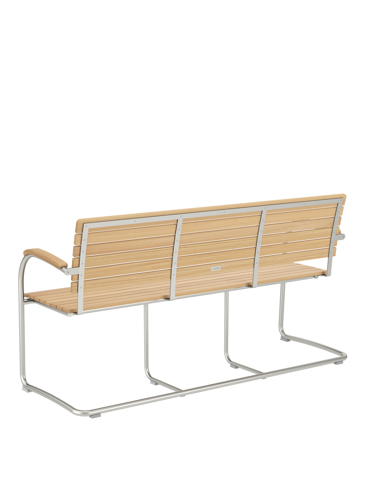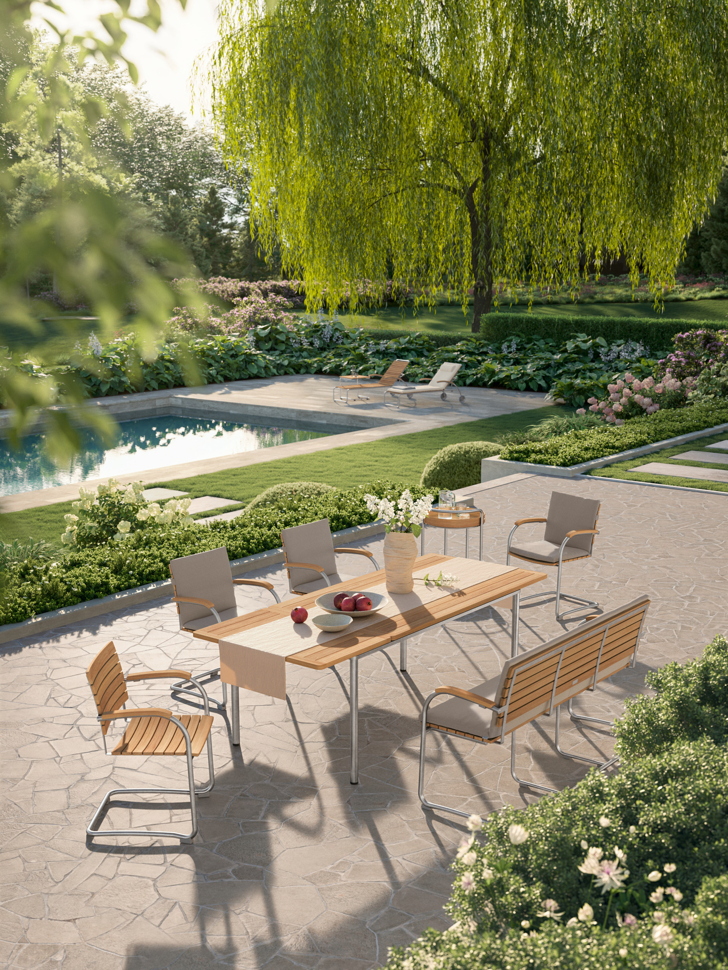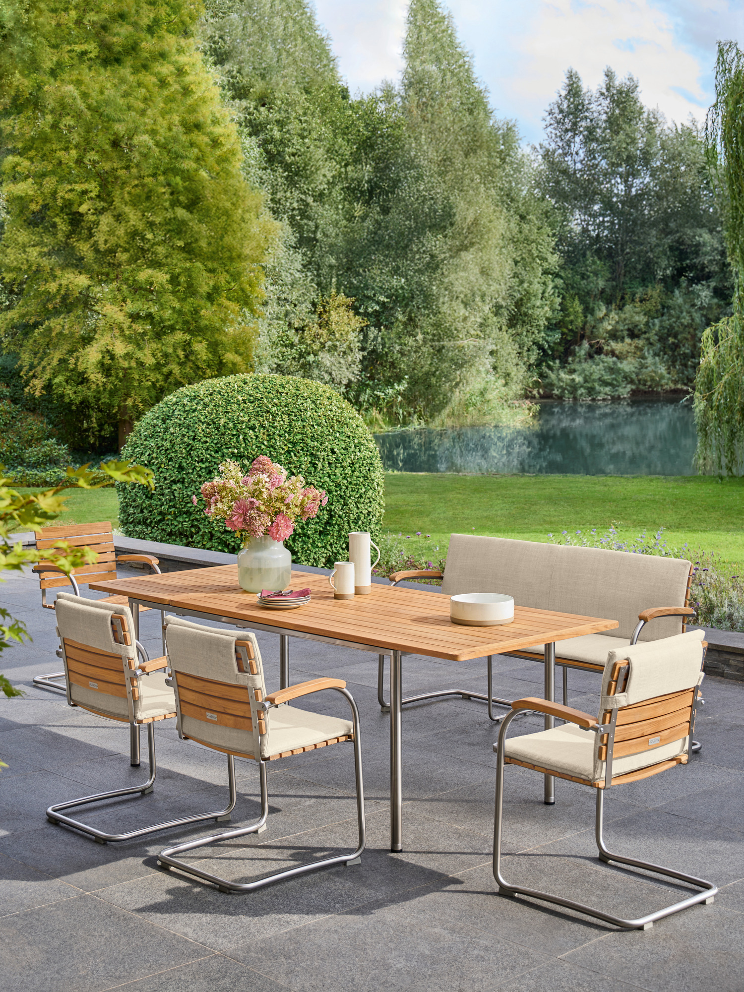 Für die Befestigung von Sitz- und Rückenflächen wurde statt eines Rundrohrs ein flacher Edelstahlrahmen gewählt. Er schmiegt sich den breiten Teakleisten an und hält sie selbst bei großen Schwingungen dauerhaft fest. Unter dem Gestell befinden sich auswechselbare Gleiter aus Kunststoff, die empfindliche Böden schützen.