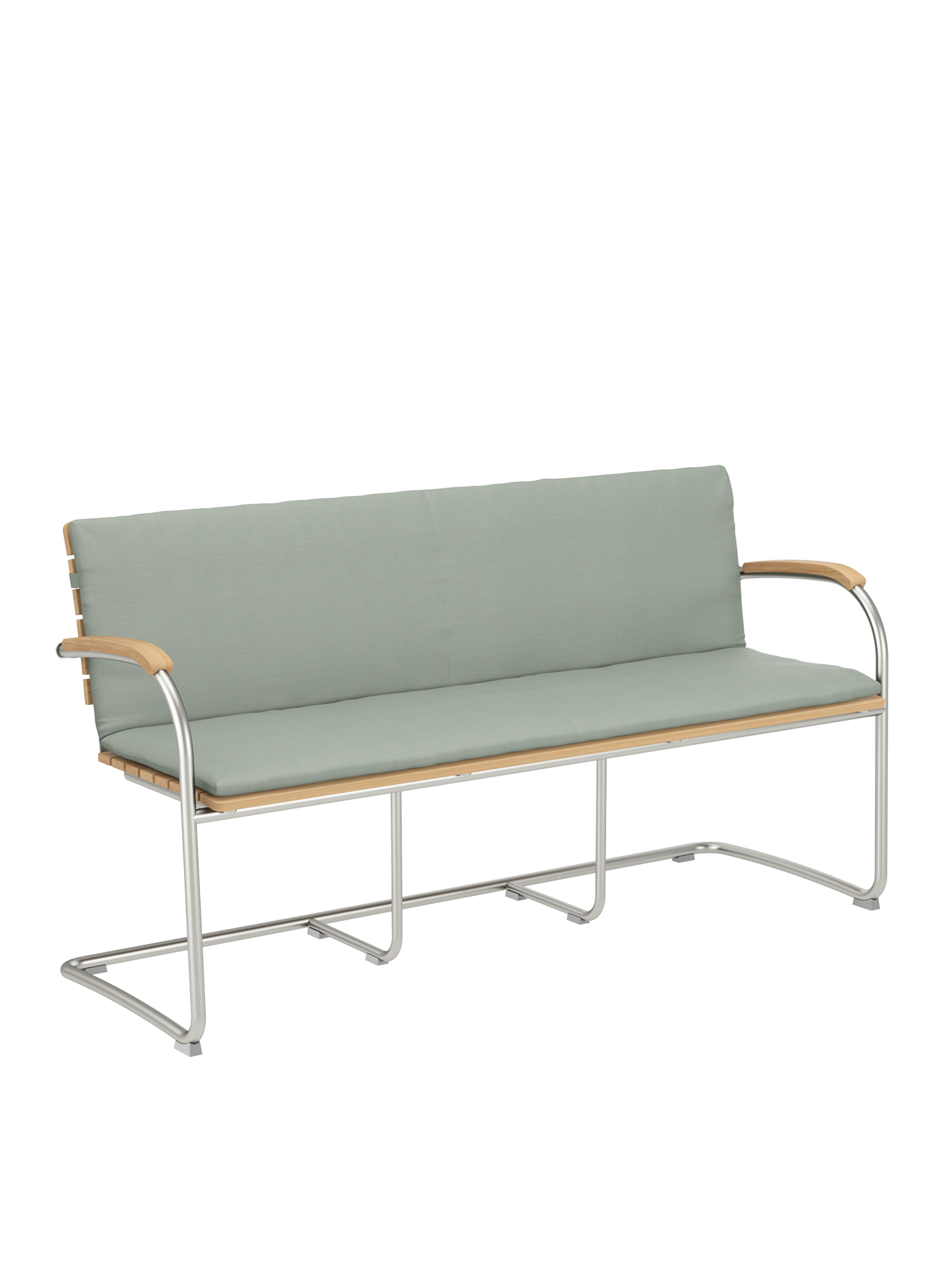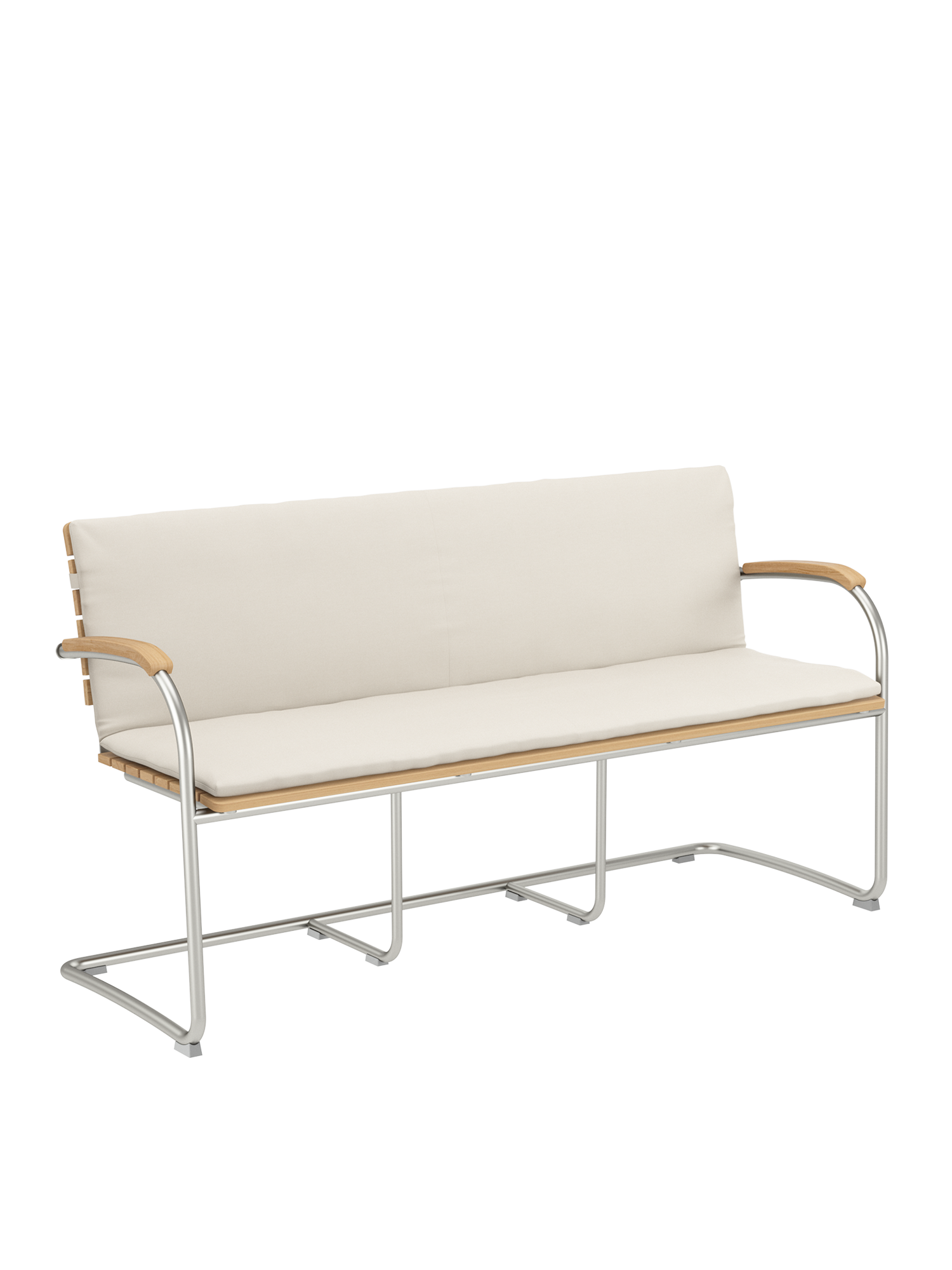 In den vom Bauhaus inspirierten Möbeln der Serie Bolero ergänzen sich edles Metall und warmes Teakholz in idealer Weise. Sitz- und Rückenflächen der Bank aus Teak sind ergonomisch geformt und sorgen für besonderen Komfort. Das Rohrgestell aus satiniertem Edelstahl trotzt allen Wetterlaunen, die gewölbten Armlehnen aus Teak passen sich seinem Profil an und schmeicheln den Händen. Auflagen in verschiedenen Farbtönen erhöhen noch die Bequemlichkeit der Möbel und setzen feine Akzente.
