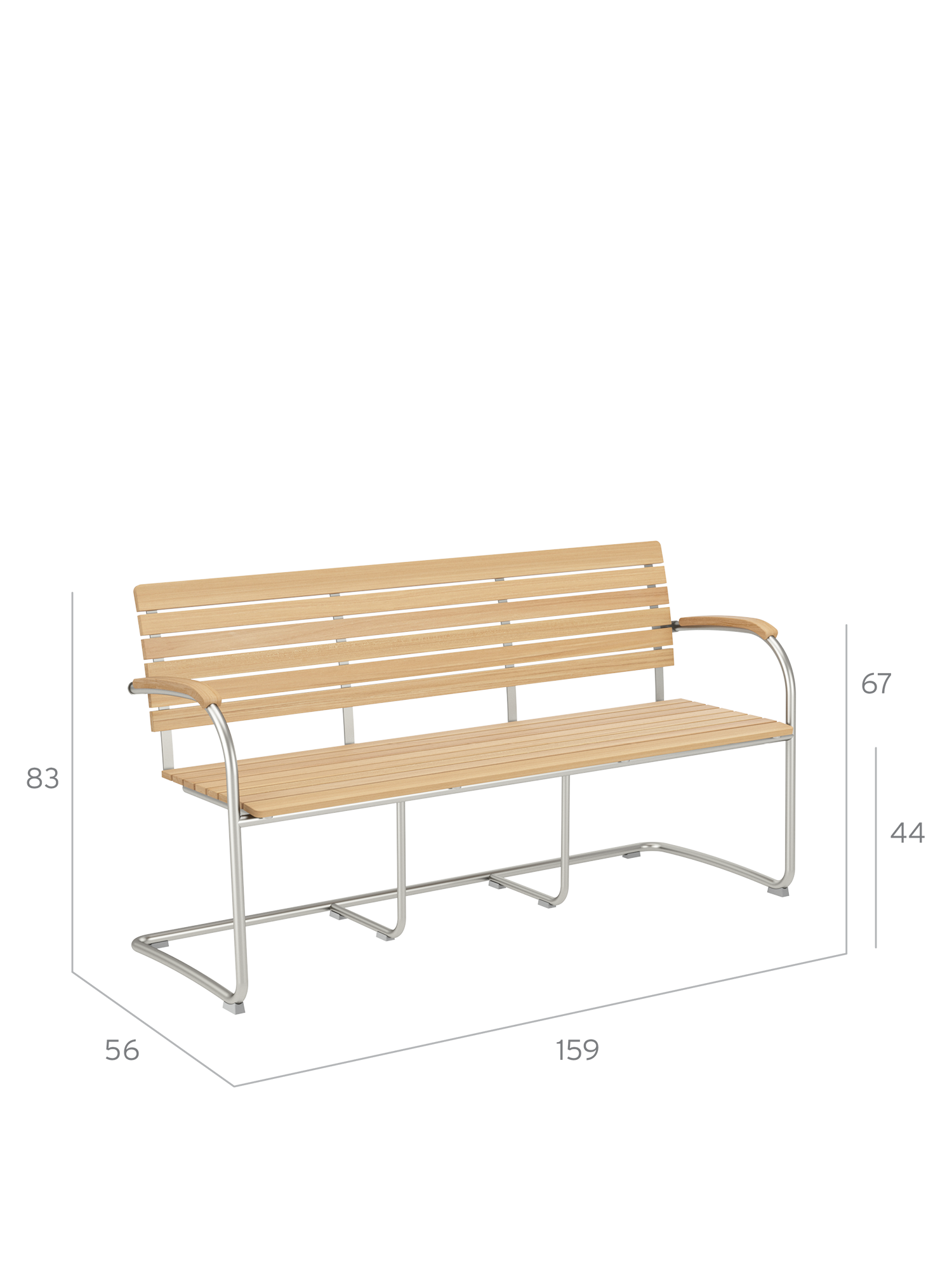 Im markanten Design bietet die Gartenbank bis zu drei Personen Platz. Ihre handwerkliche Verarbeitung gewährleistet enorme Stabilität.