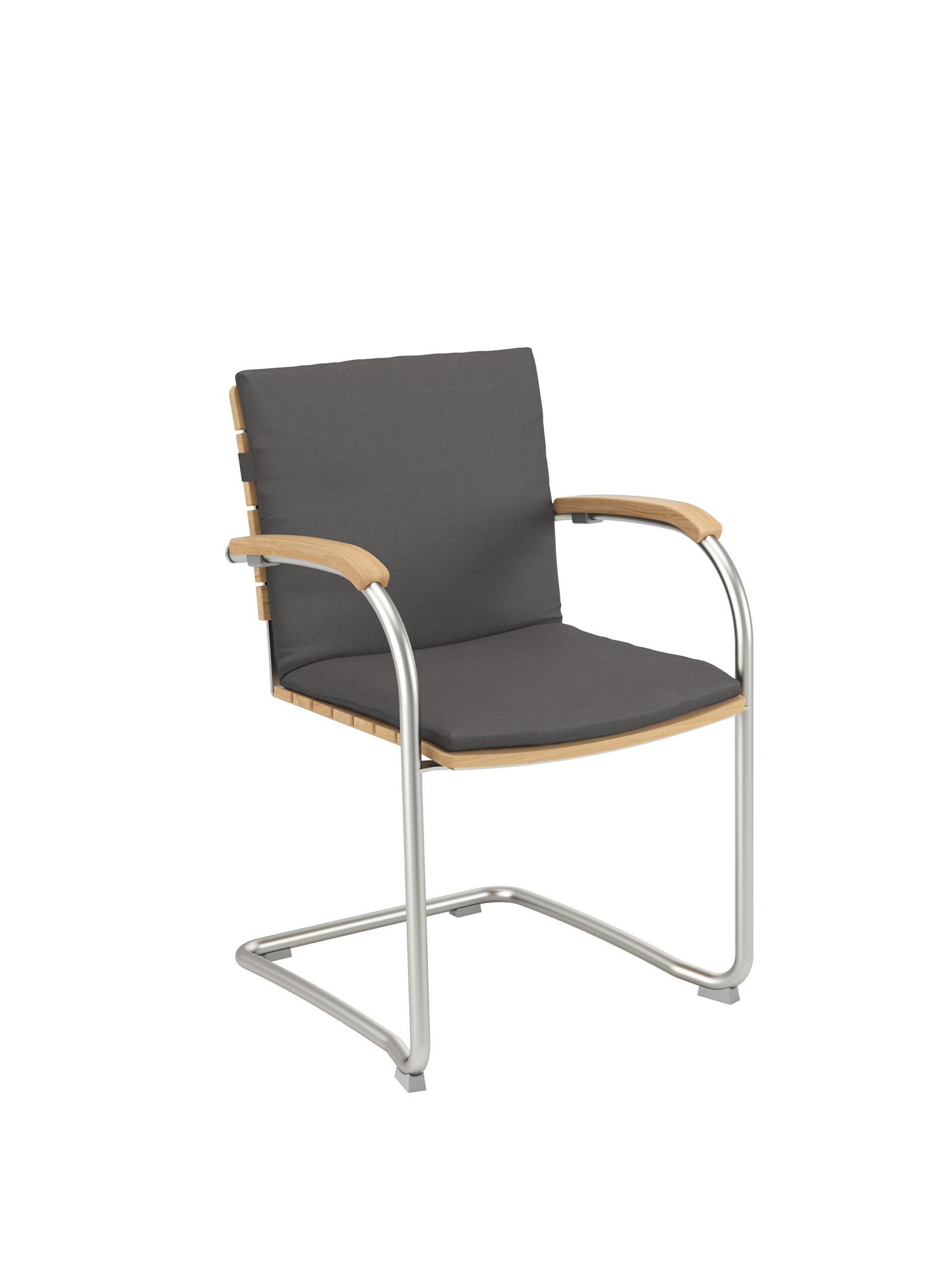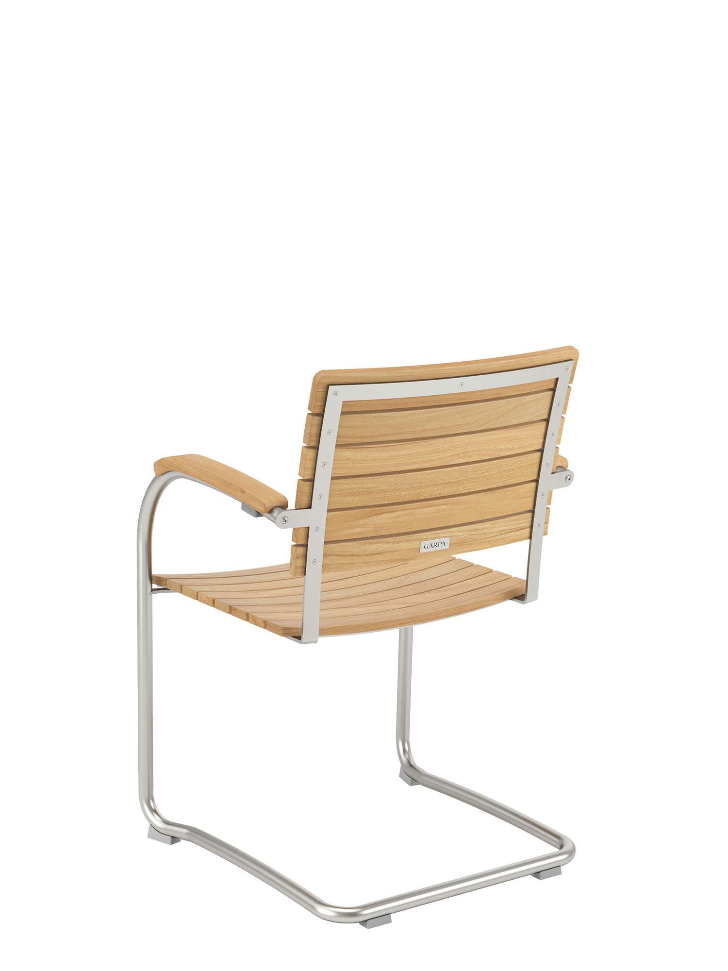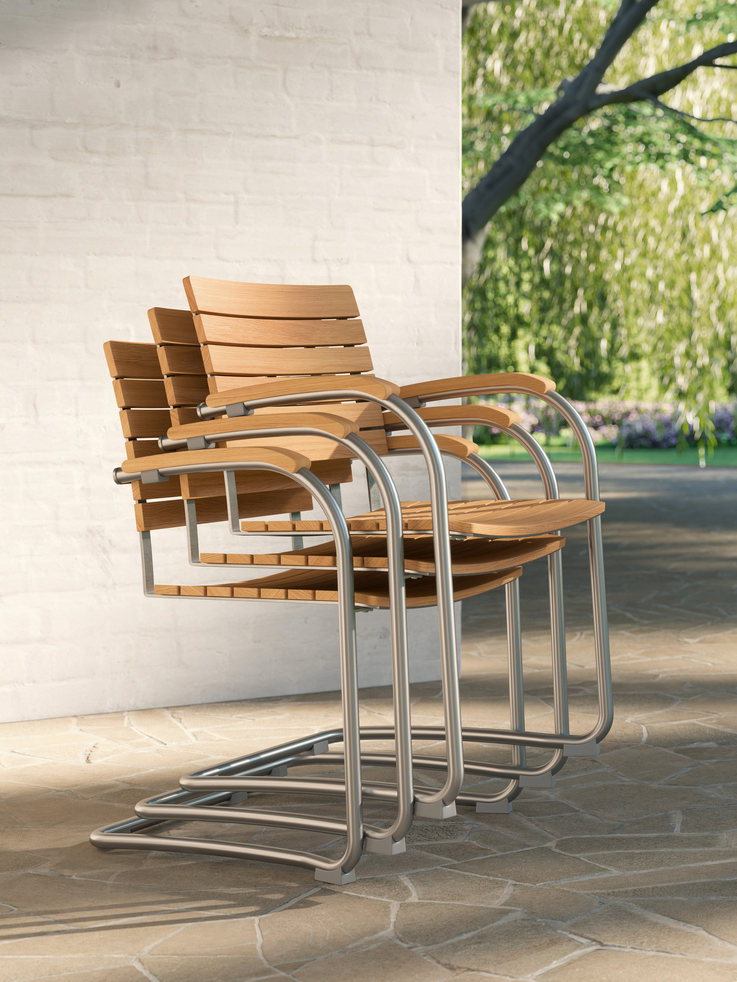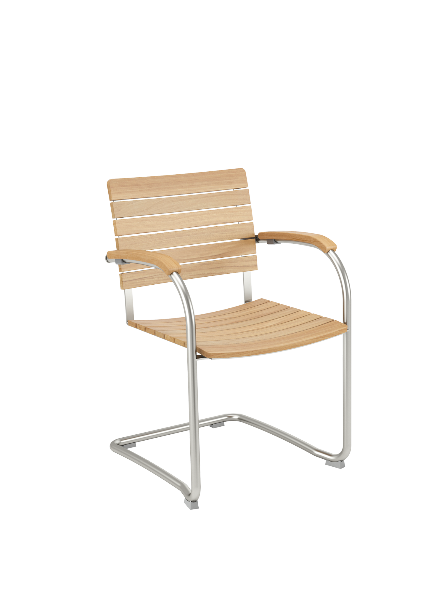 Die Sitz- und Rückenflächen aus Teak sind ergonomisch geformt und sorgen für besonderen Komfort. Das Rohrgestell aus satiniertem Edelstahl trotzt allen Wetterlaunen, die gewölbten Armlehnen aus Teak passen sich seinem Profil an und schmeicheln den Händen.