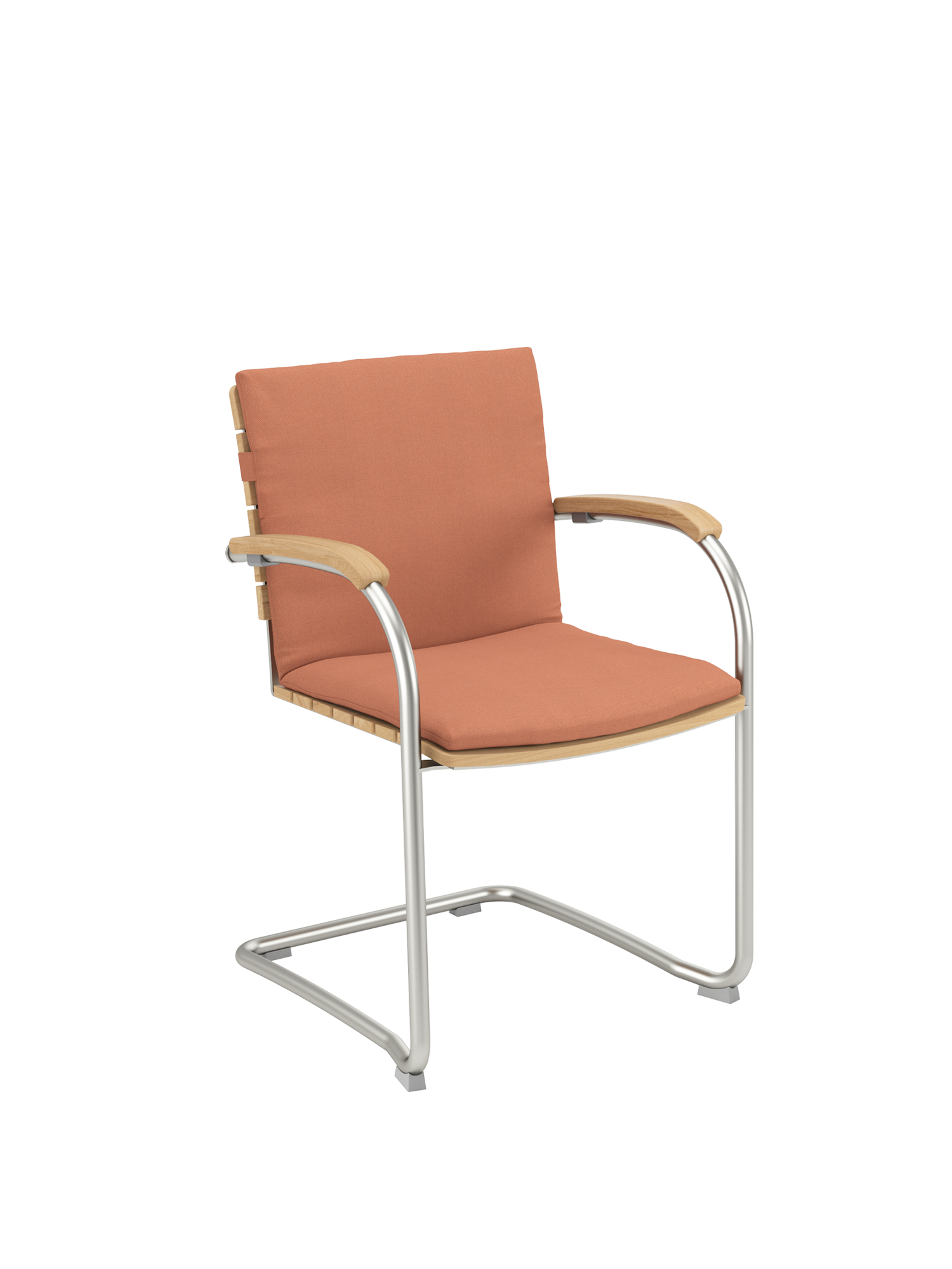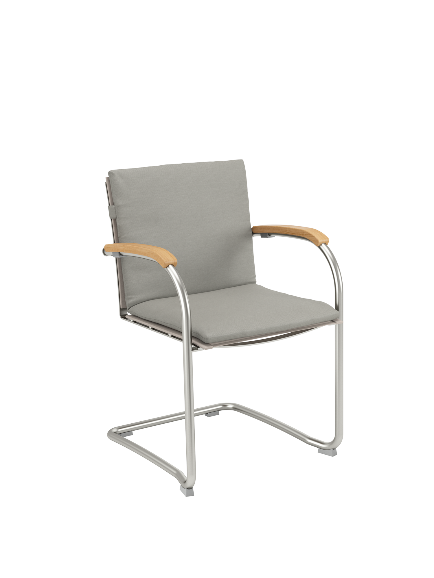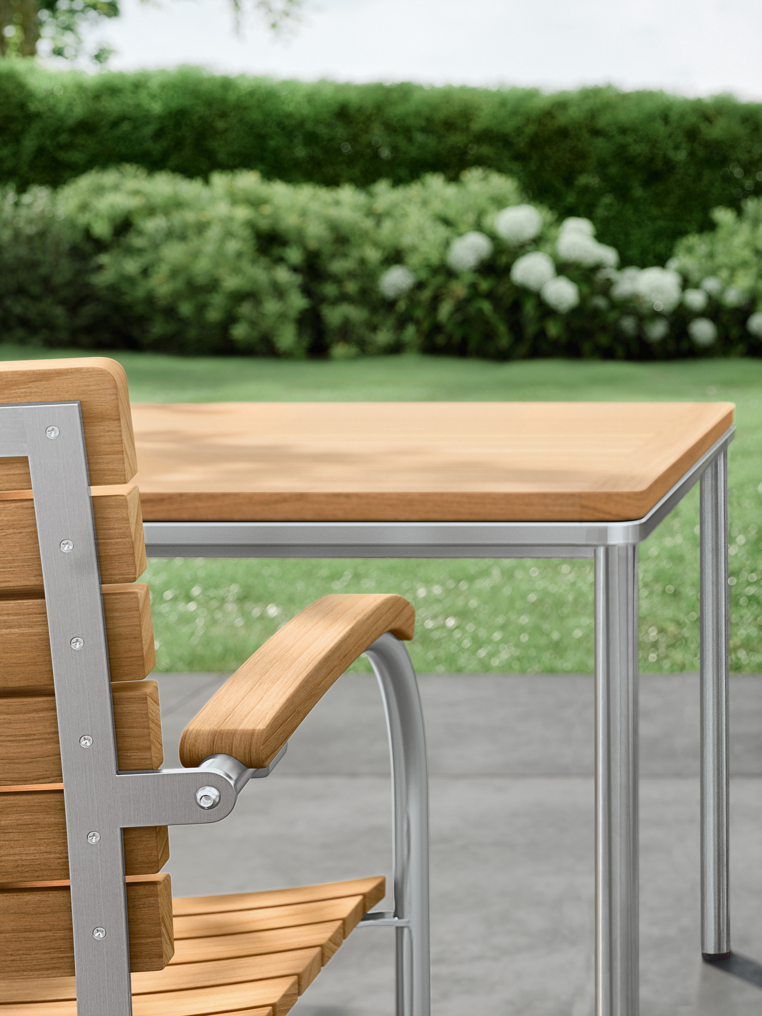 Die Sitz- und Rückenflächen aus Teak sind ergonomisch geformt und sorgen für besonderen Komfort. Das Rohrgestell aus satiniertem Edelstahl trotzt allen Wetterlaunen, die gewölbten Armlehnen aus Teak passen sich seinem Profil an und schmeicheln den Händen.