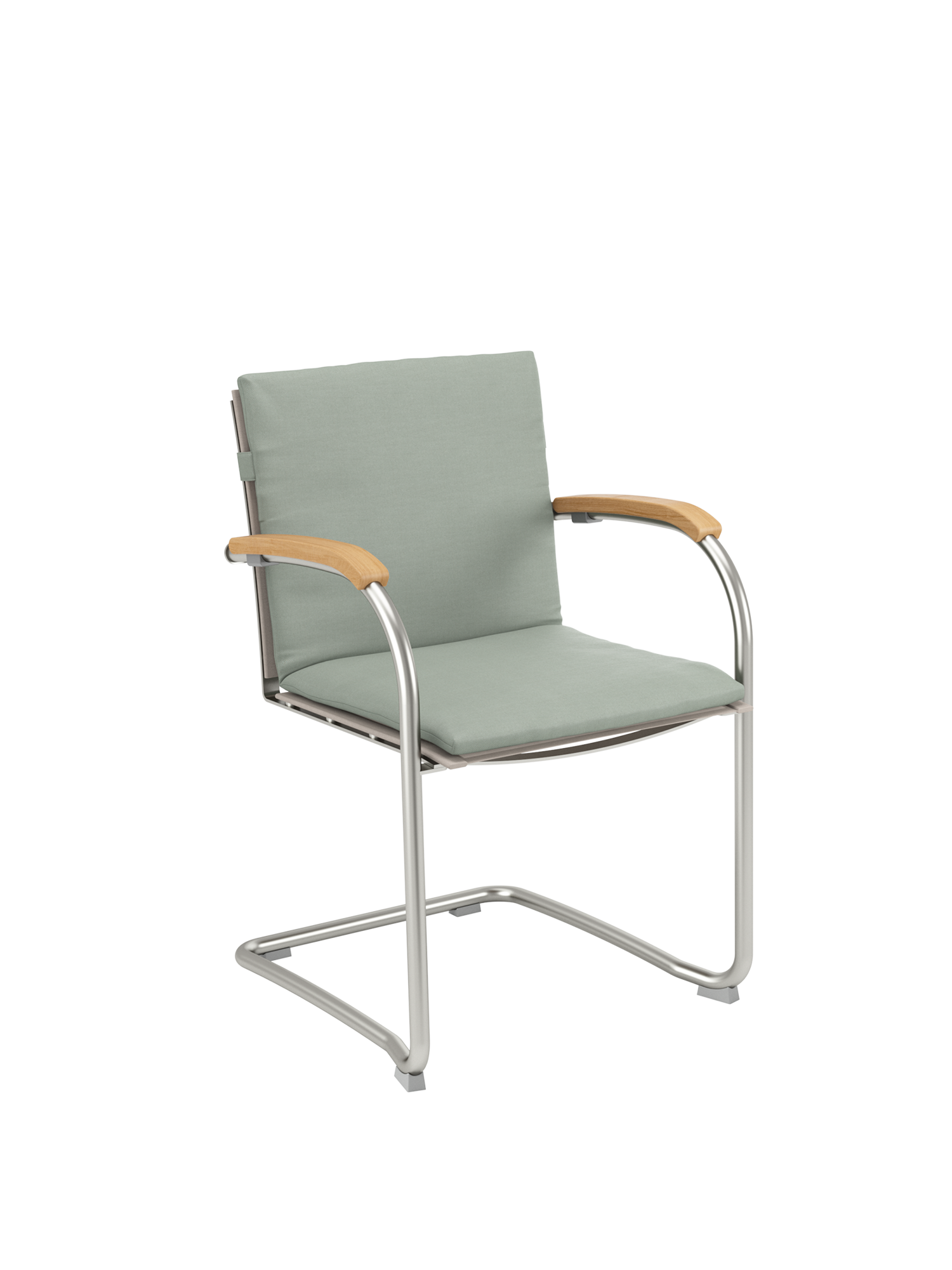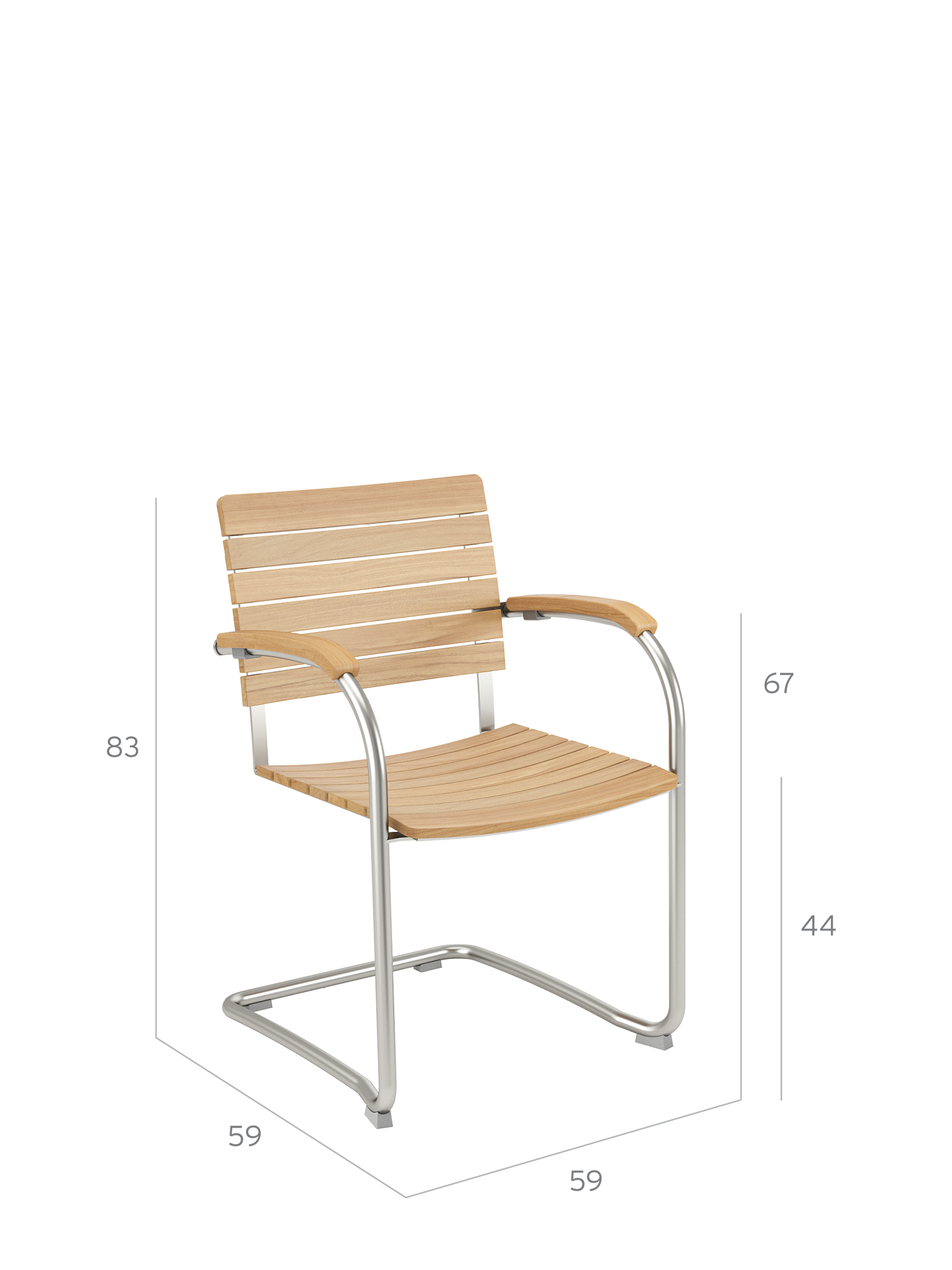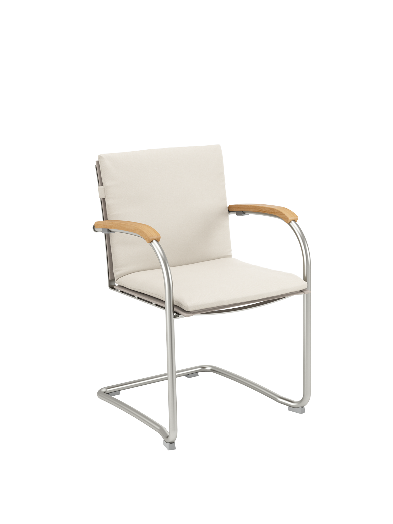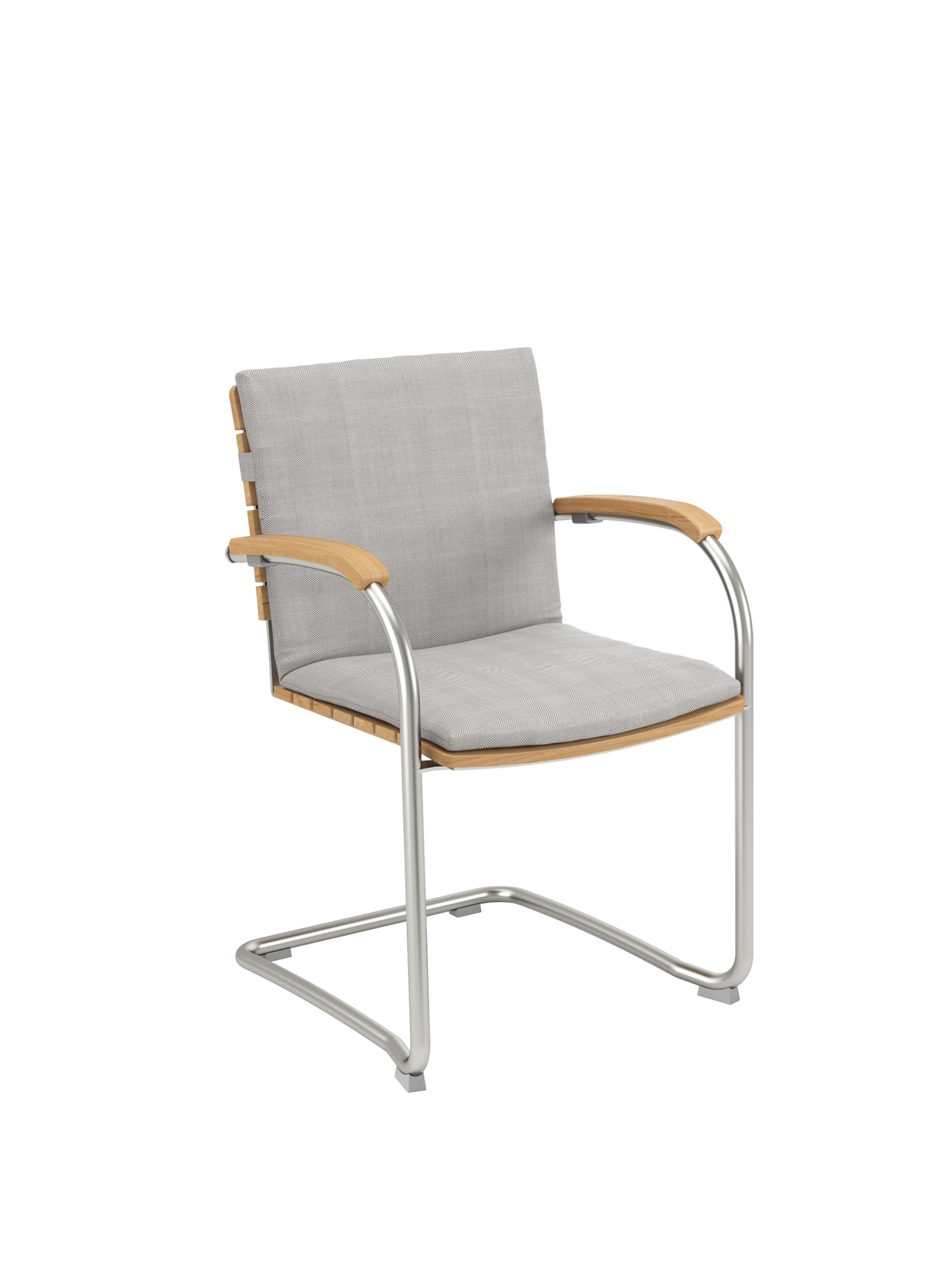 Die Sitz- und Rückenflächen aus Teak sind ergonomisch geformt und sorgen für besonderen Komfort. Das Rohrgestell aus satiniertem Edelstahl trotzt allen Wetterlaunen, die gewölbten Armlehnen aus Teak passen sich seinem Profil an und schmeicheln den Händen.