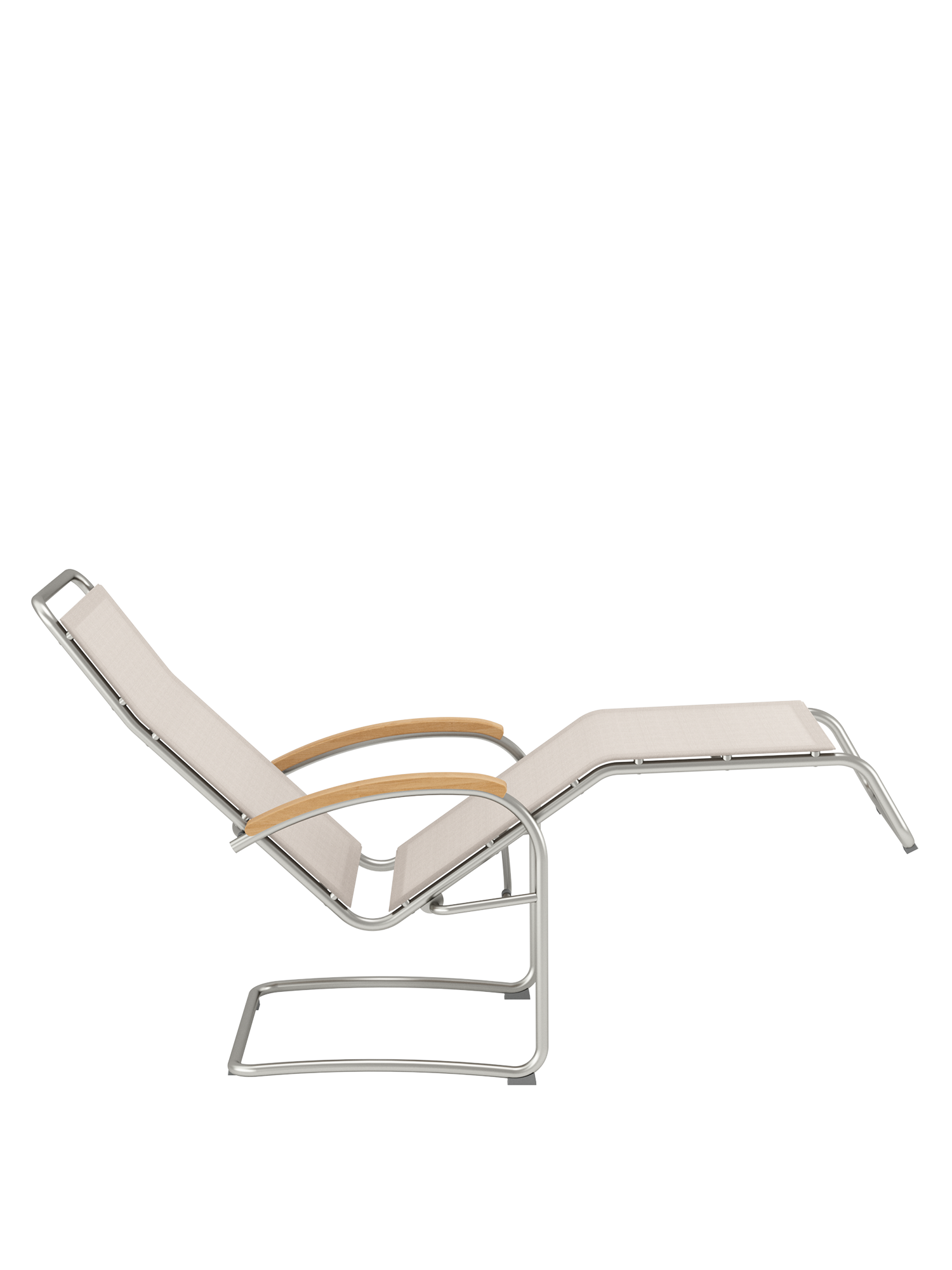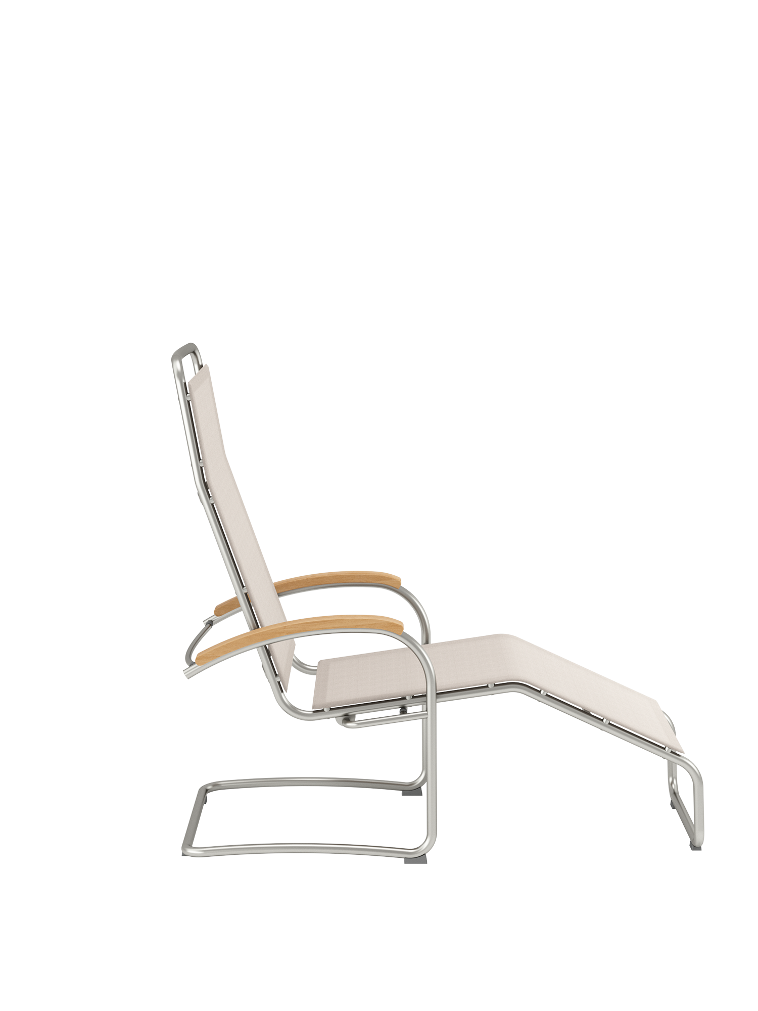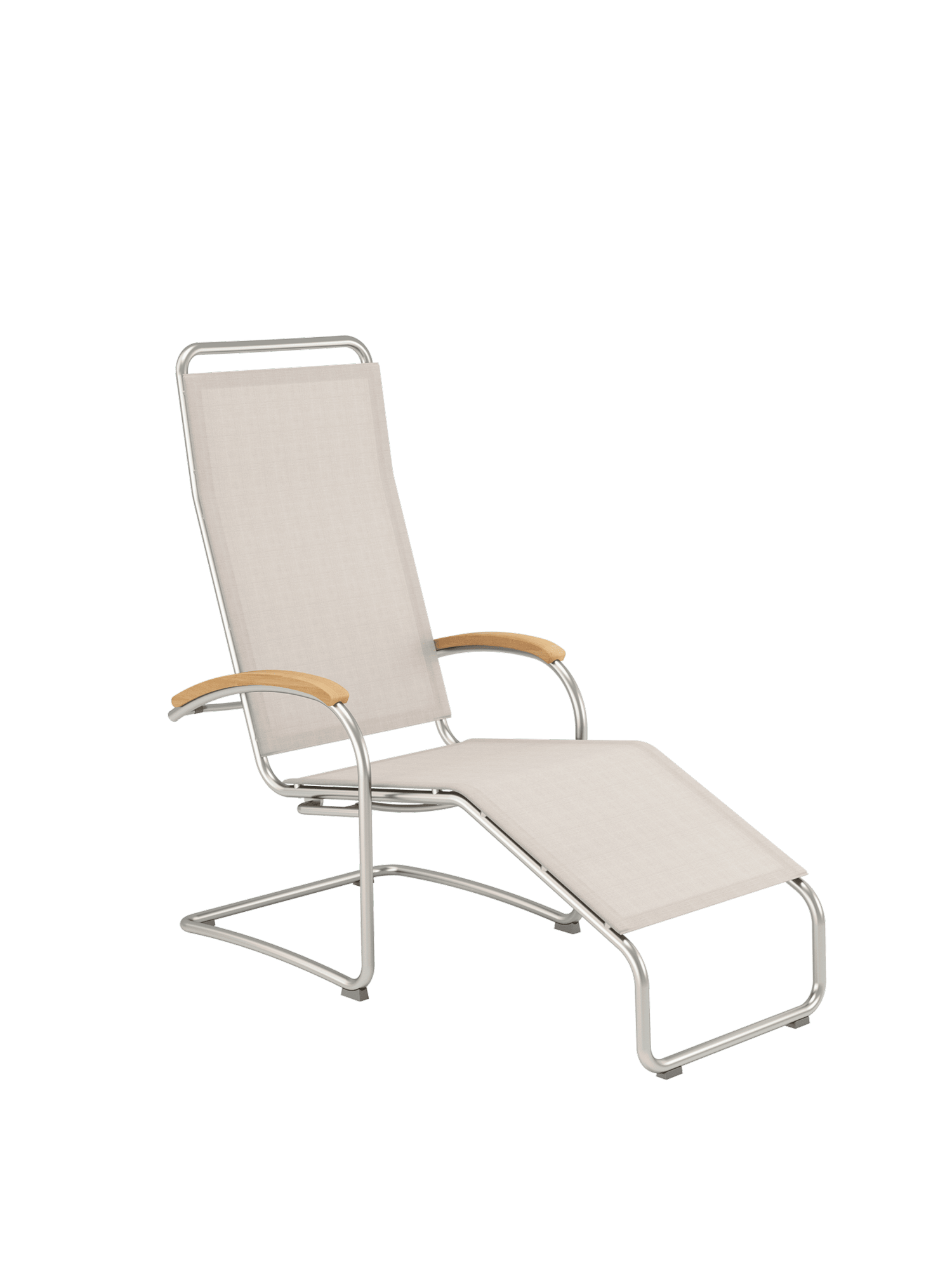 In dem vom Bauhaus inspirierten Liegesessel ergänzen sich edles Metall und ein hochwertiges Polymergewebe in idealer Weise. Das Gewebe zeichnet sich durch eine angenehm natürliche, textile Haptik aus. Anschmiegsam und straff zugleich empfiehlt es sich mit oder ohne Polster für unbeschwertes Sitzen und Liegen. Der natürliche Farbton, eine Melange zwischen zartem Braun und hellem Beige, unterstreicht die Eleganz des Möbels. Das Rohrgestell aus satiniertem Edelstahl trotzt allen Wetterlaunen, die gewölbten Armlehnen aus Teak passen sich seinem Profil an und schmeicheln den Händen. Auflagen in verschiedenen Farbtönen erhöhen noch die Bequemlichkeit der Möbel und setzen feine Akzente.