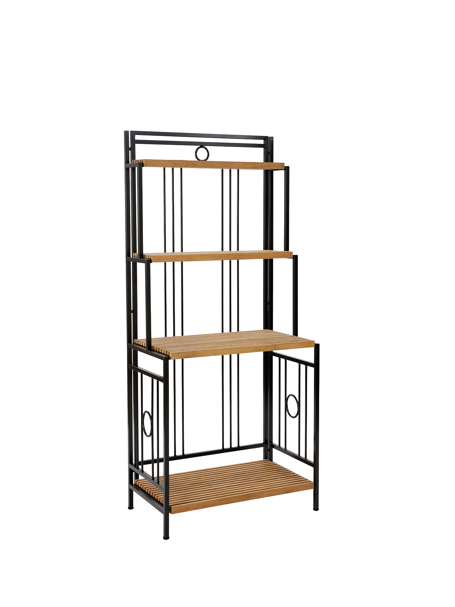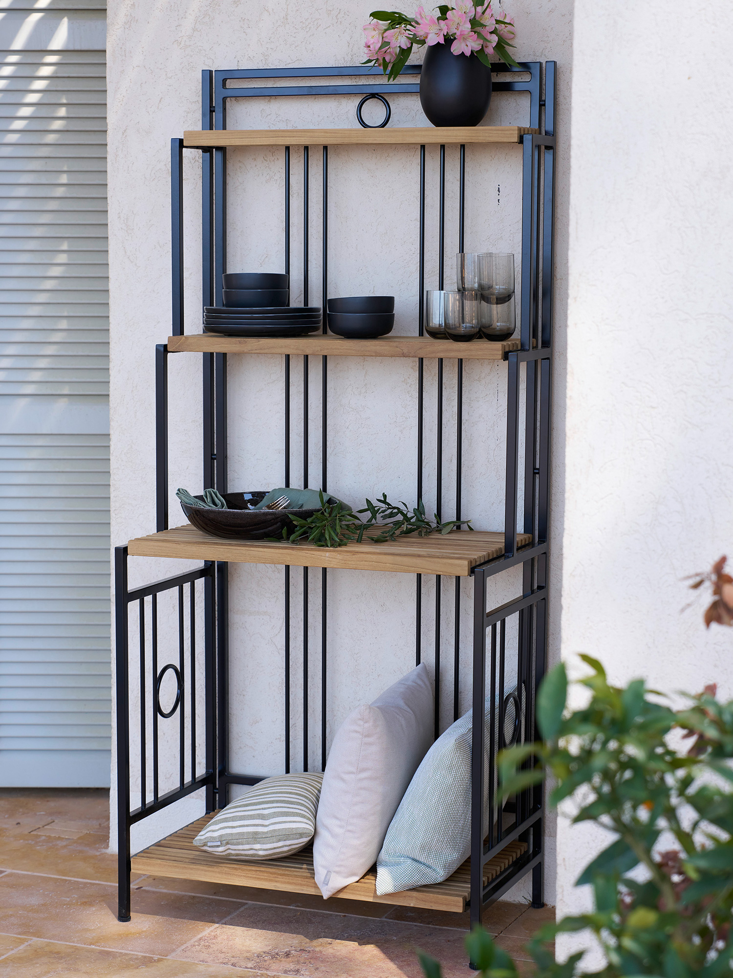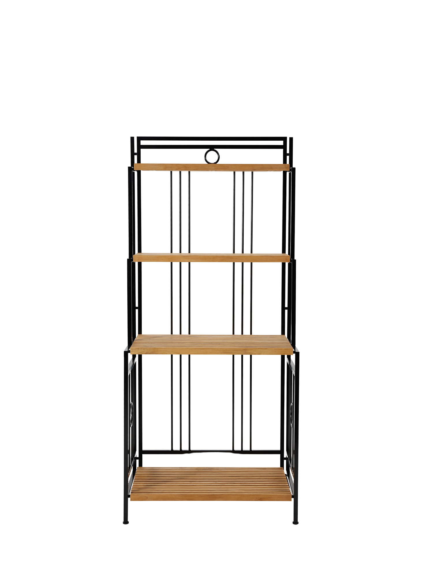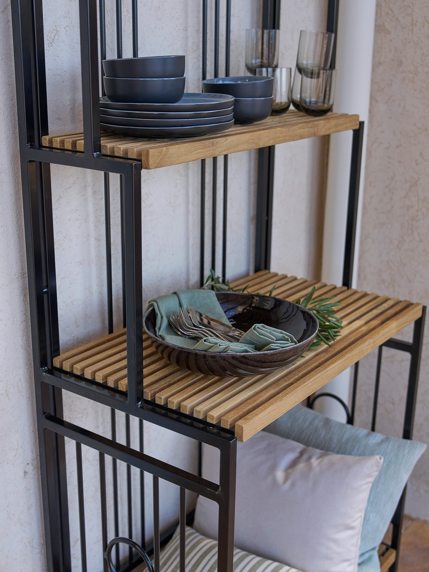 Das filigran anmutende Regal ist bewundernde Blicke gewöhnt. Es macht als Solitär eine charmante Figur, gibt sich dank seiner moderaten Breite aber auch mit weniger Platz zufrieden. Massive Teakleisten und ein Gestell aus schwarz pulverbeschichtetem Aluminium vereinen sich zu einem vielseitig nutzbaren Möbel. Die tiefen Böden in den beiden unteren Etagen bieten besonders viel praktischen Stauraum. Höhenversteller gleichen Unebenheiten im Boden aus.