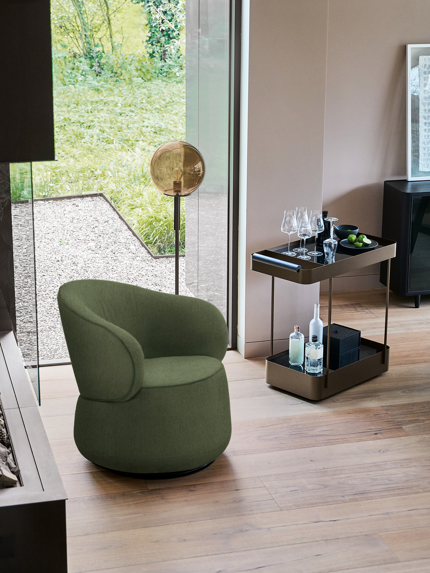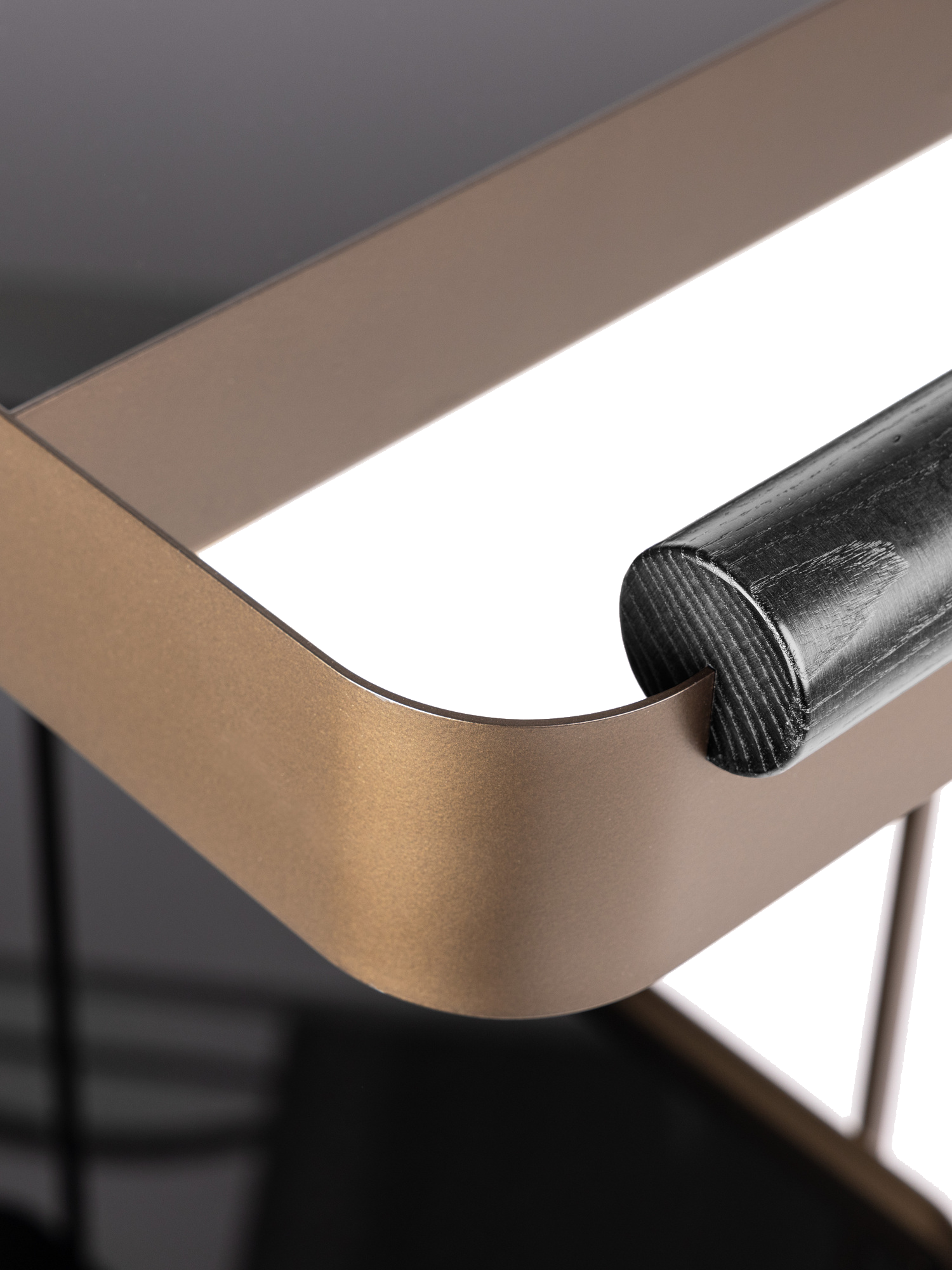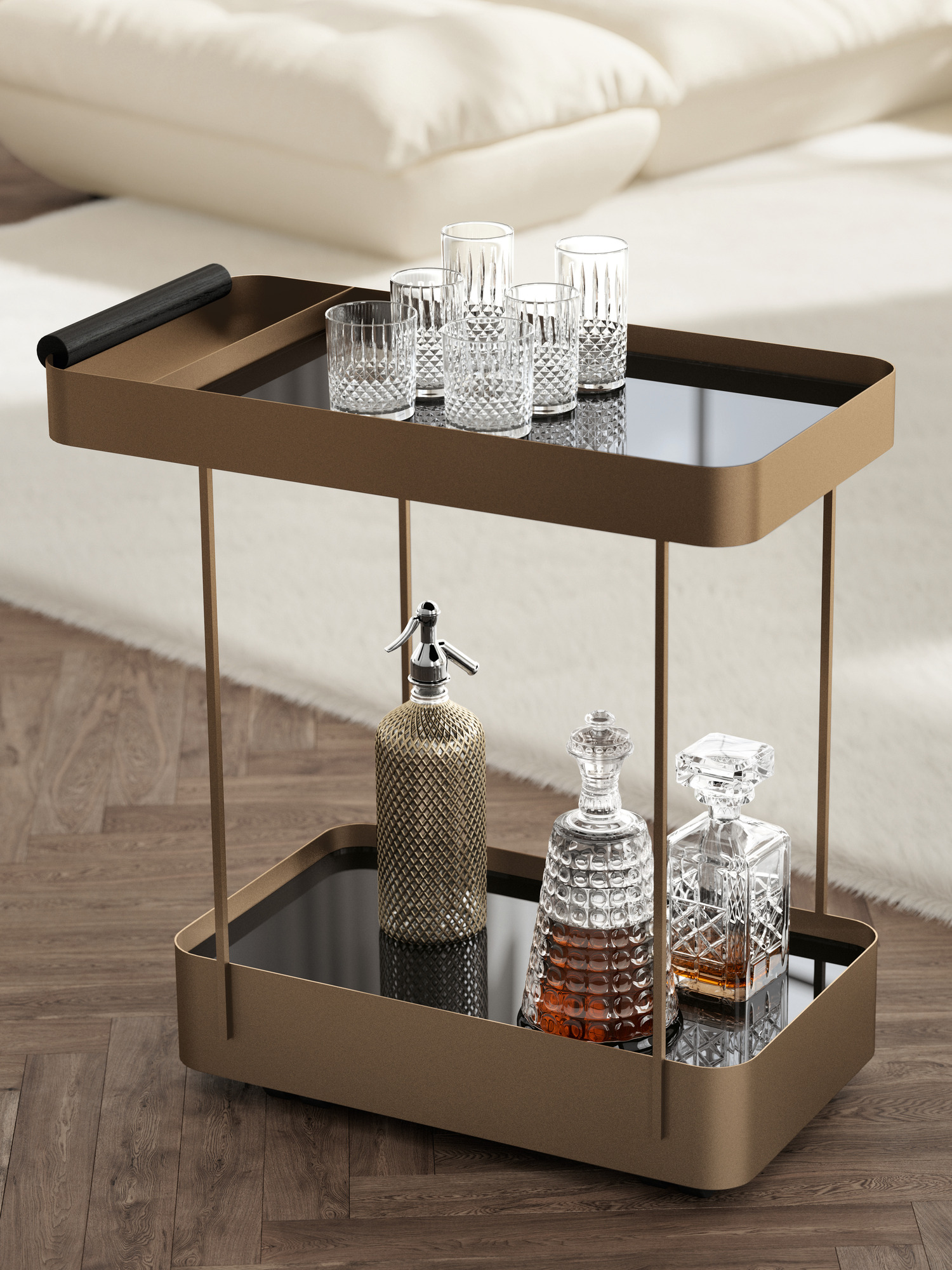 Gerade Flächen, gerundete Kanten und grazile Streben kennzeichnen die stilsichere Formgebung des flexiblen Barwagens, der Gläser, Getränke und Snacks nahe der Sitzgruppe bereithält. Sein filigranes Gestell besteht aus pulverbeschichtetem Stahl in einem Bronzeton, die eingelegten Glasböden der Ablageflächen auf zwei Ebenen sind dunkel verspiegelt. Ein schwarzer Holzgriff, der in den oberen Rahmen eingelassen ist, und dezent verborgene Rollen machen den Barwagen beweglich.