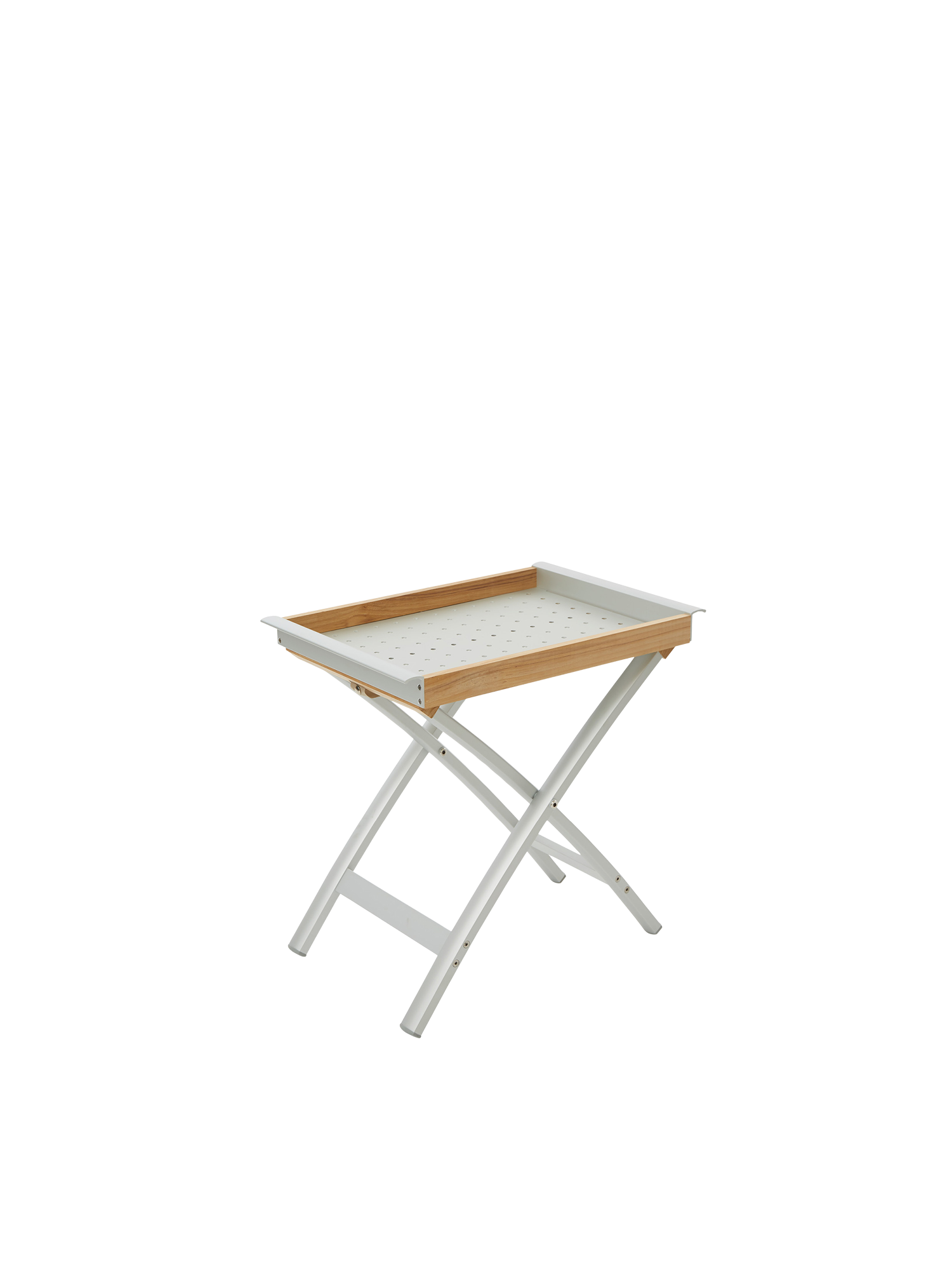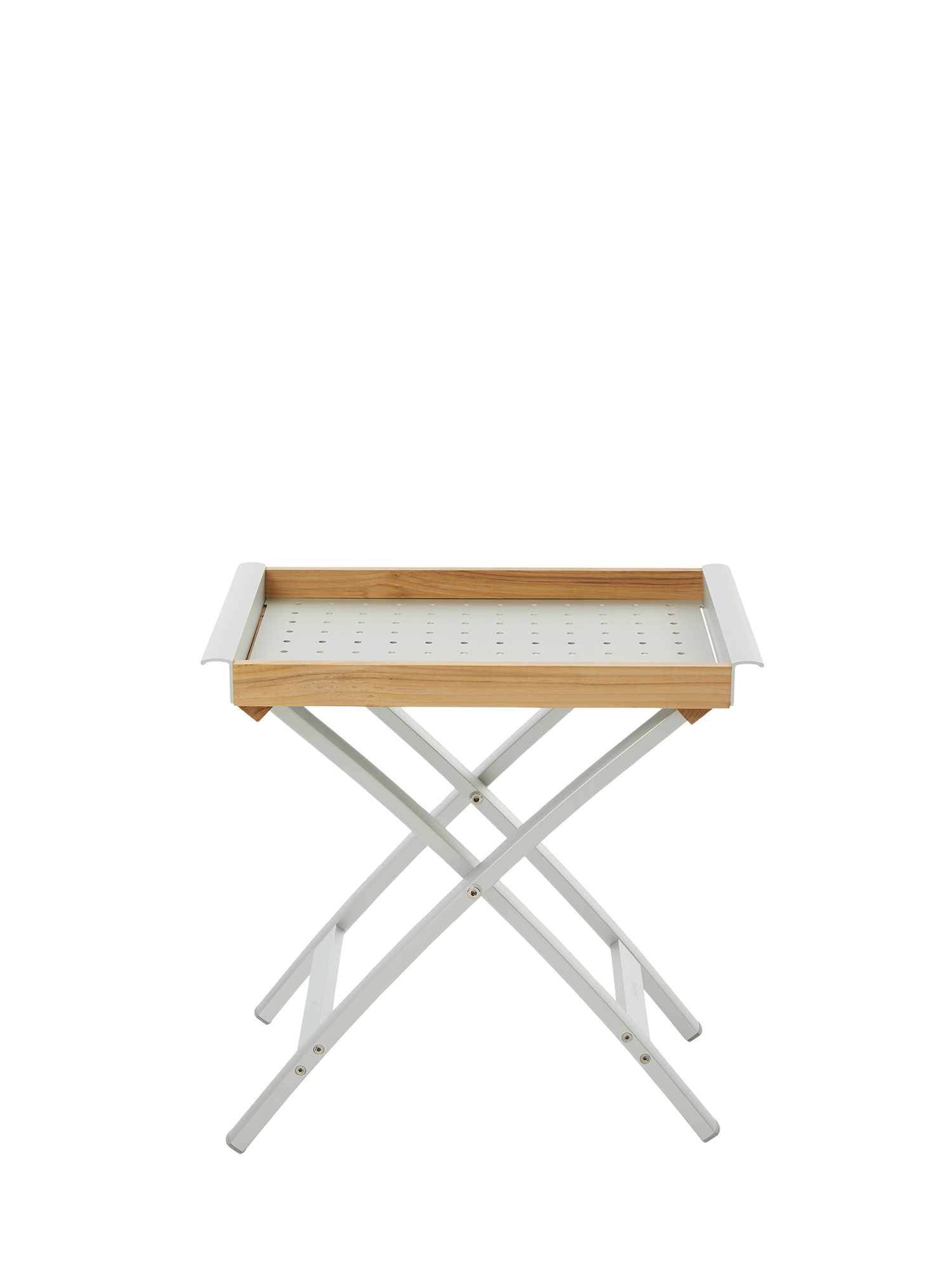 Unkompliziert und leicht: Der klappbare Tabletttisch aus Teak und Aluminium passt perfekt zu unseren Möbelserien aus Aluminium. Schnell dazugestellt, leistet er mit seinem abnehmbaren Tablett flexiblen Tafeldienst.