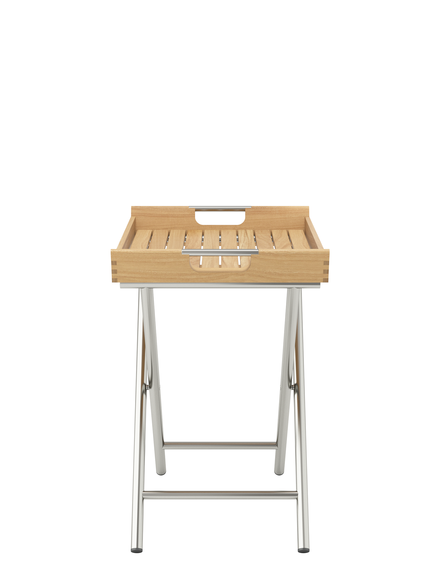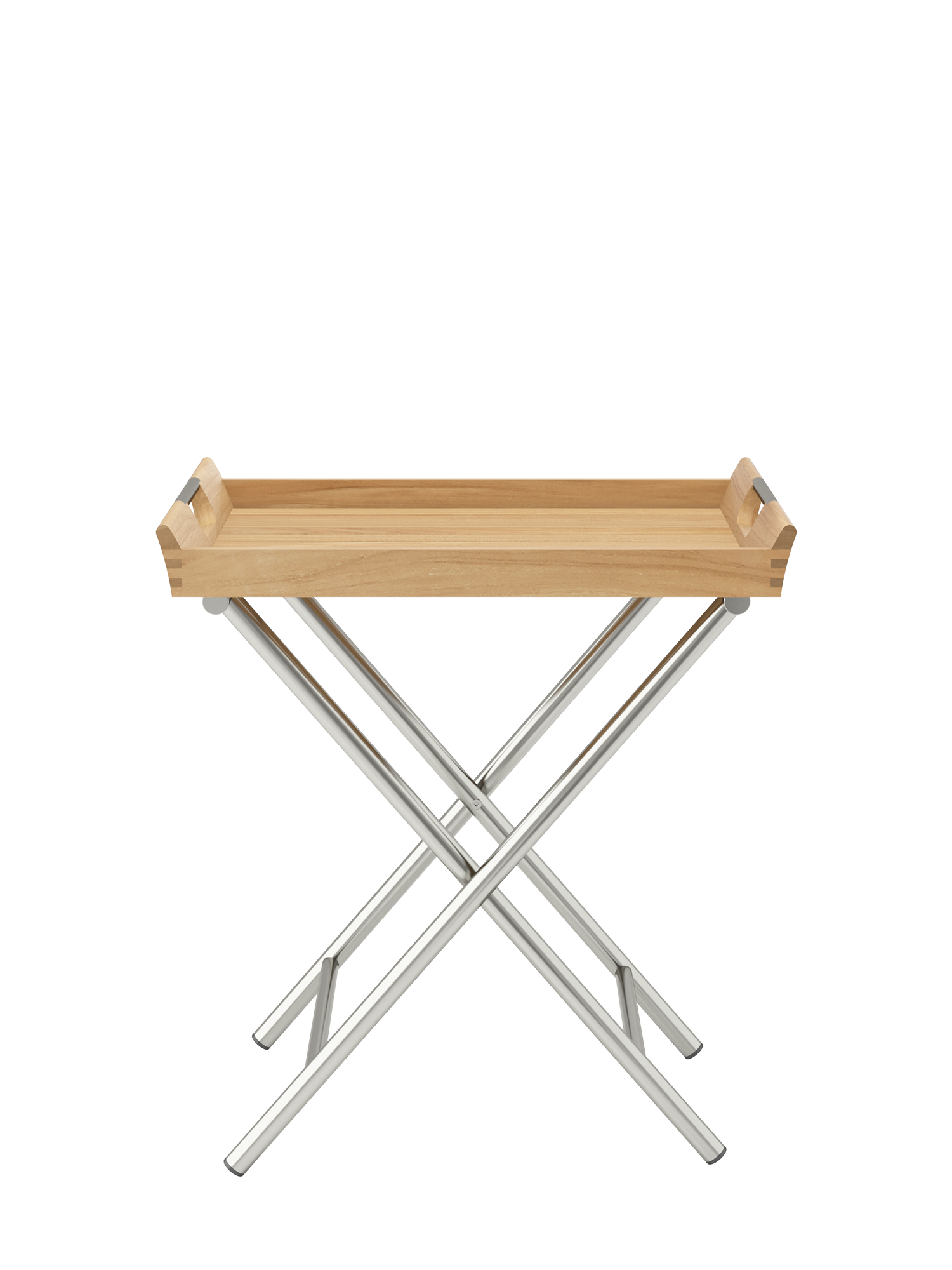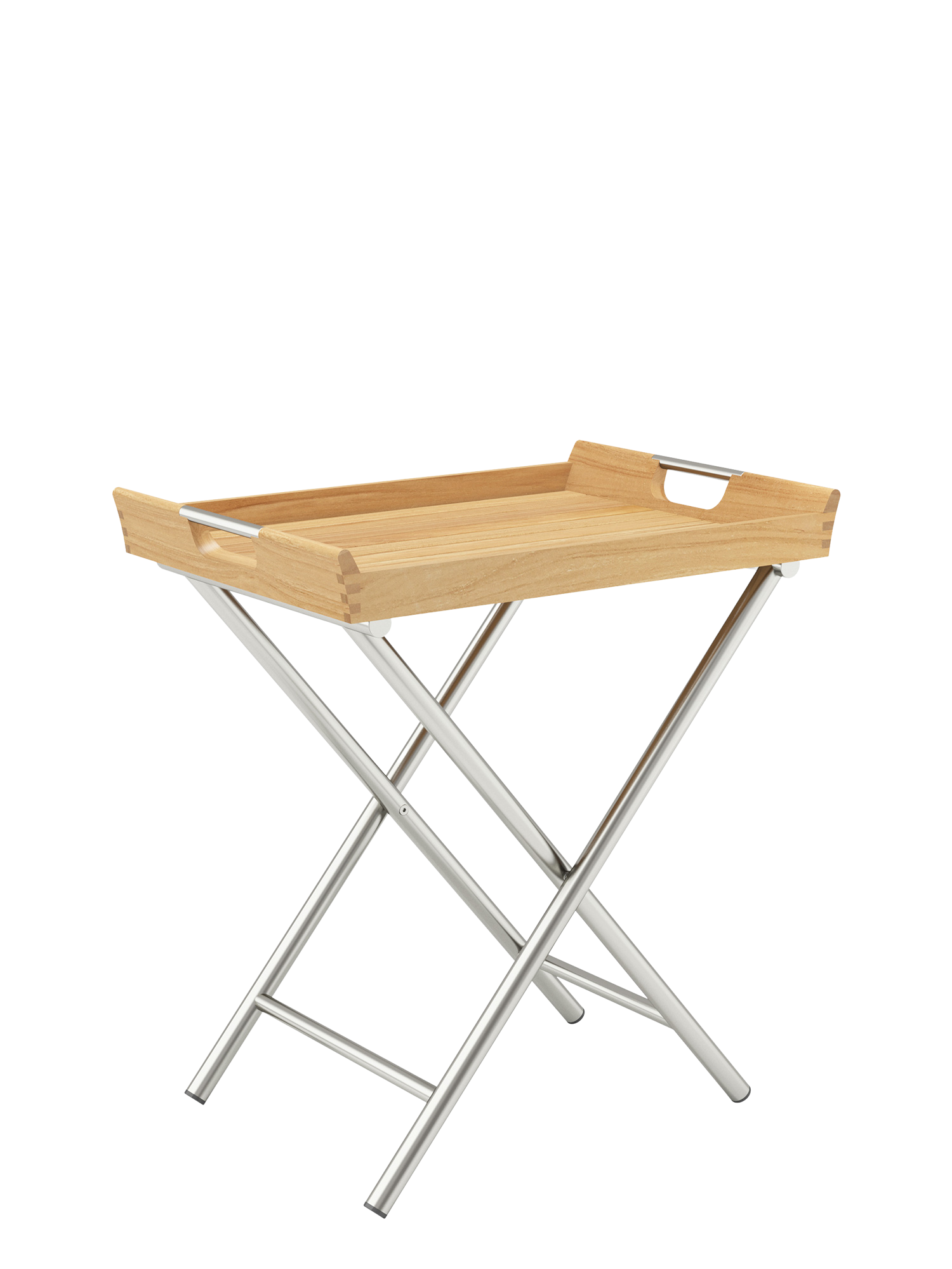 Auf dem klappbaren Gestell aus Edelstahl wartet das abnehmbare Tablett aus Teakholz auf seinen Einsatz.