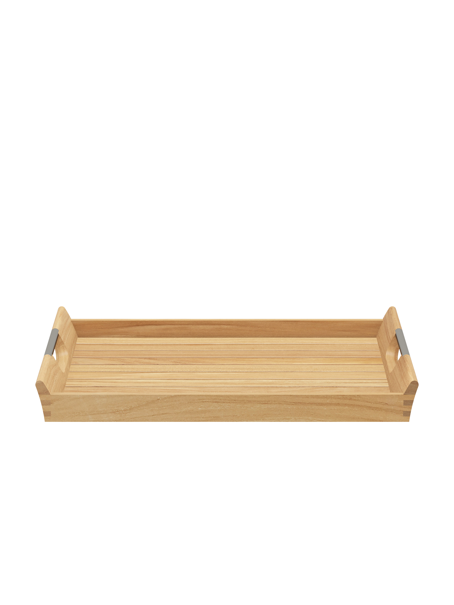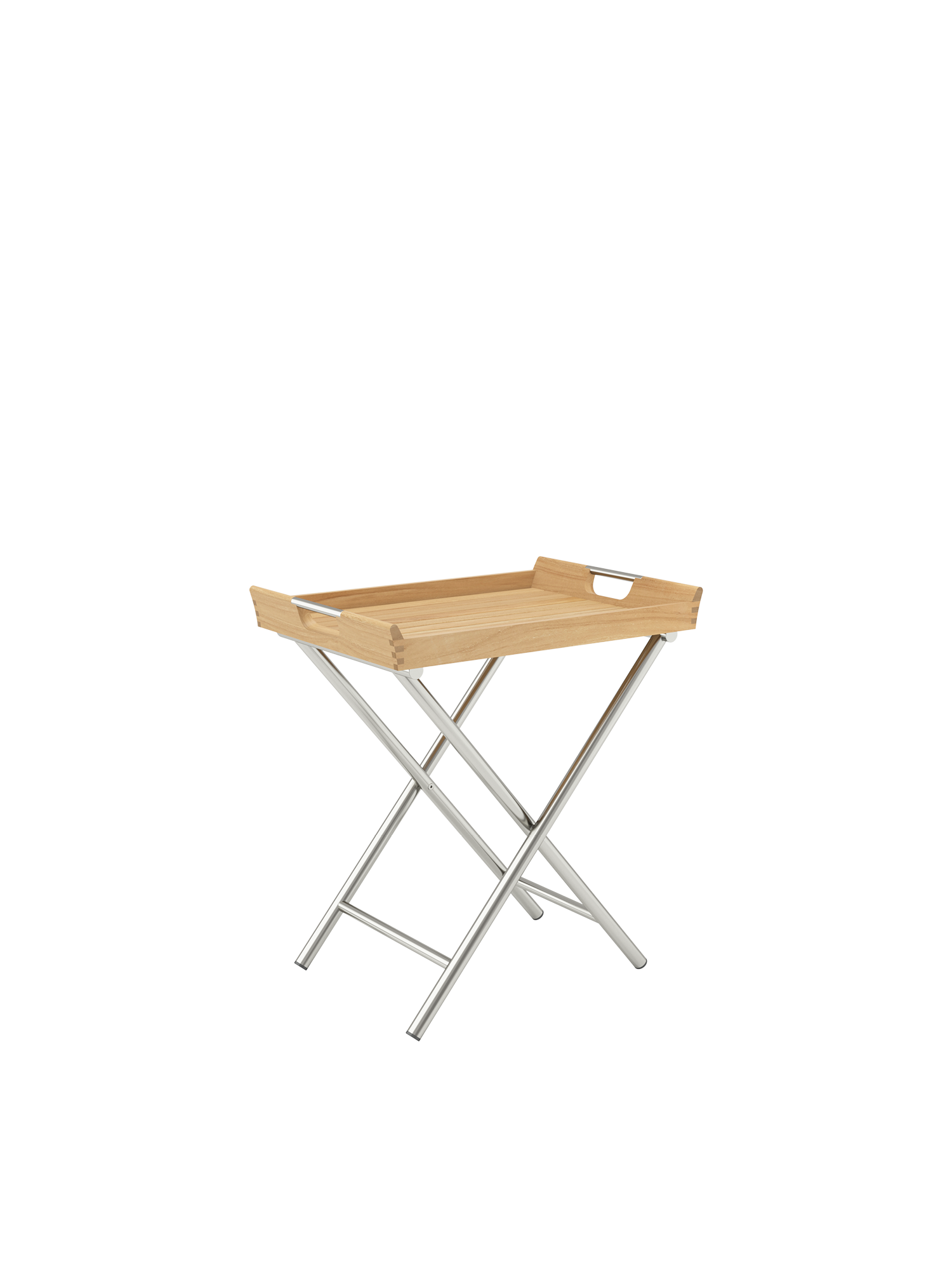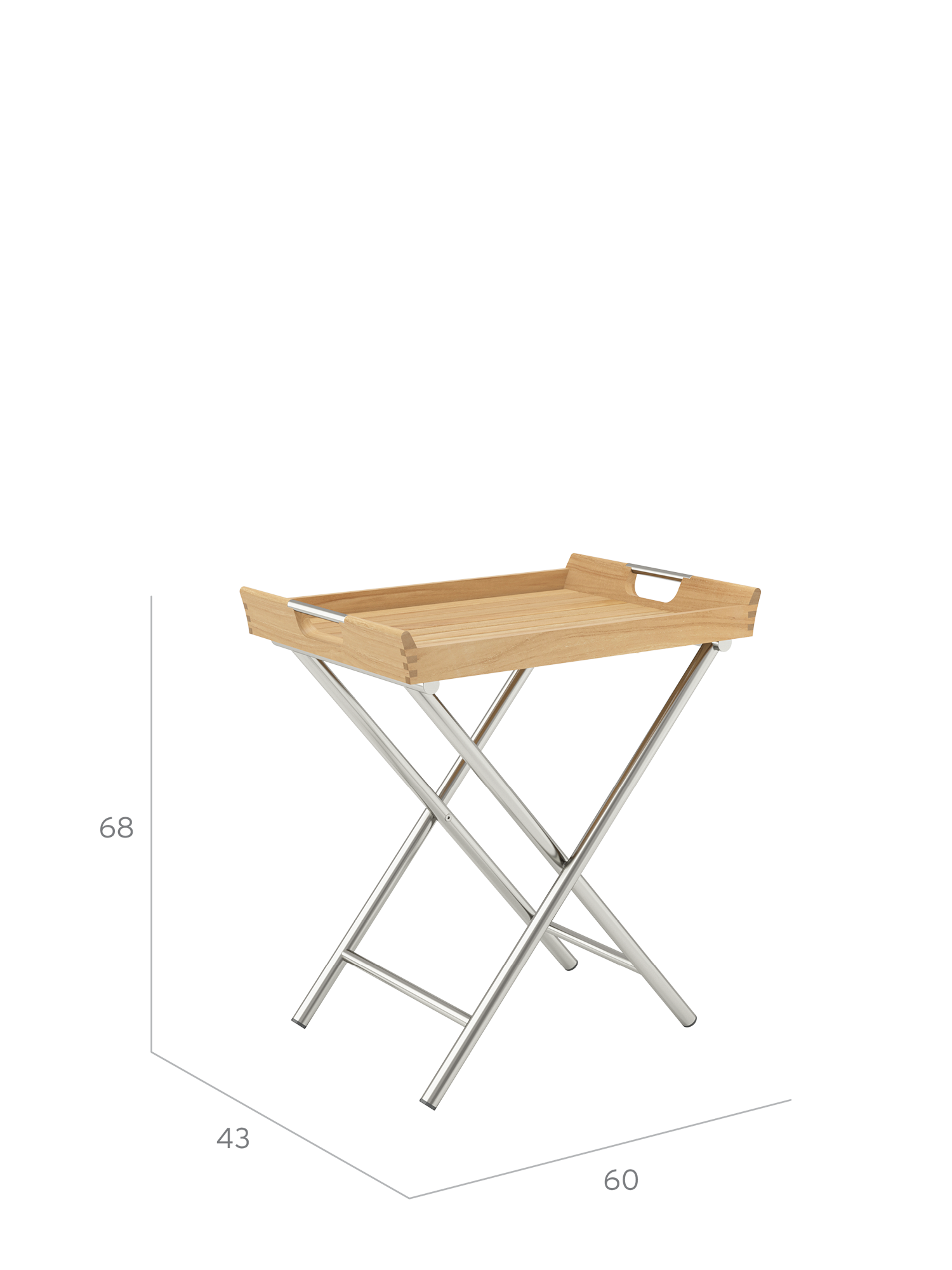 Auf dem klappbaren Gestell aus Edelstahl wartet das abnehmbare Tablett aus Teakholz auf seinen Einsatz.