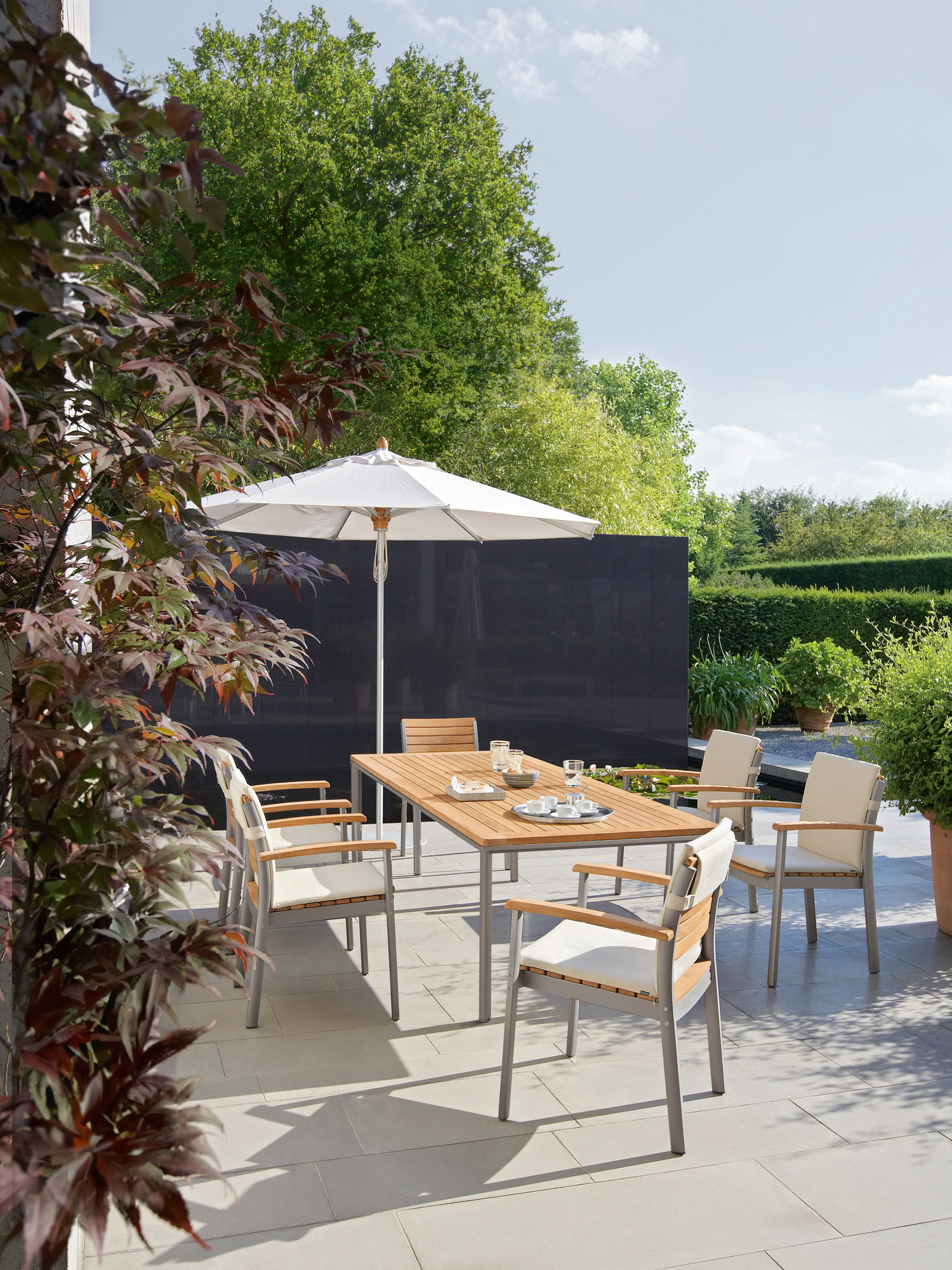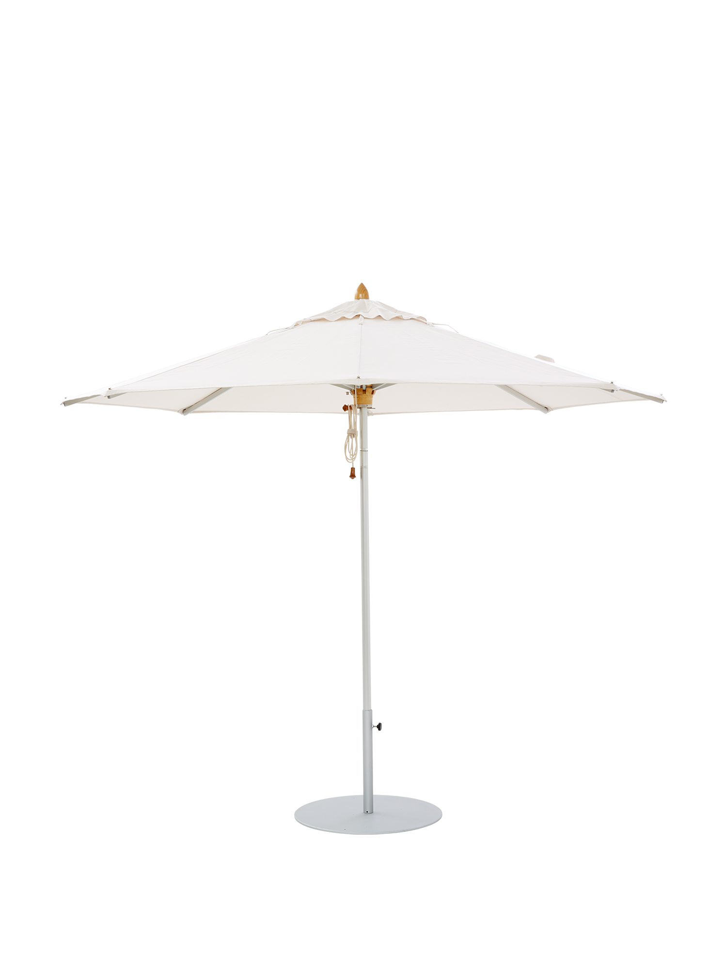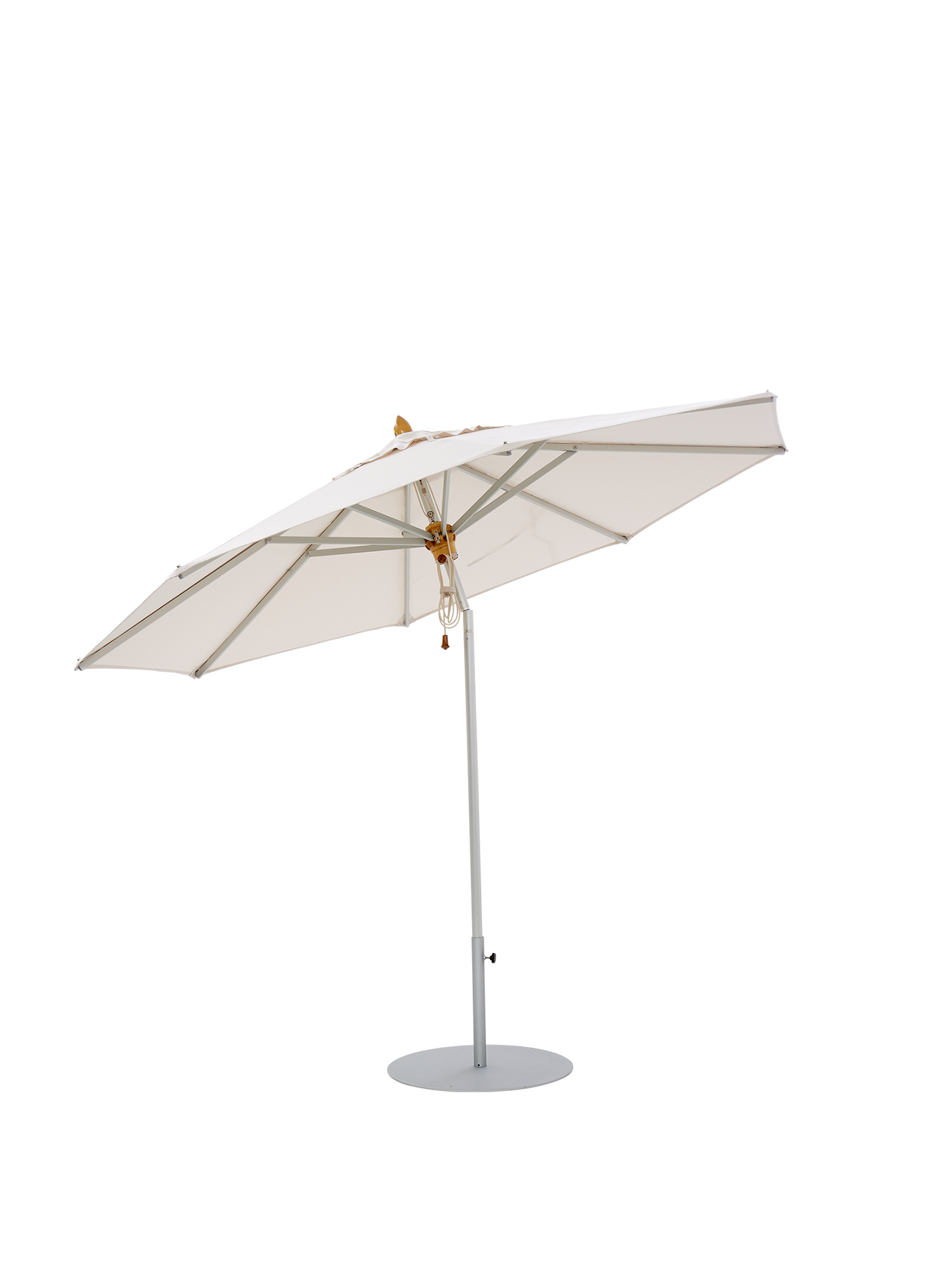 Mast und Streben bestehen aus eloxierten Aluminiumprofilen, Schieber und Mastspitze aus Holz, so dass der Schirm sowohl zu Teakmöbeln als auch modernen Aluminiummöbeln passt.