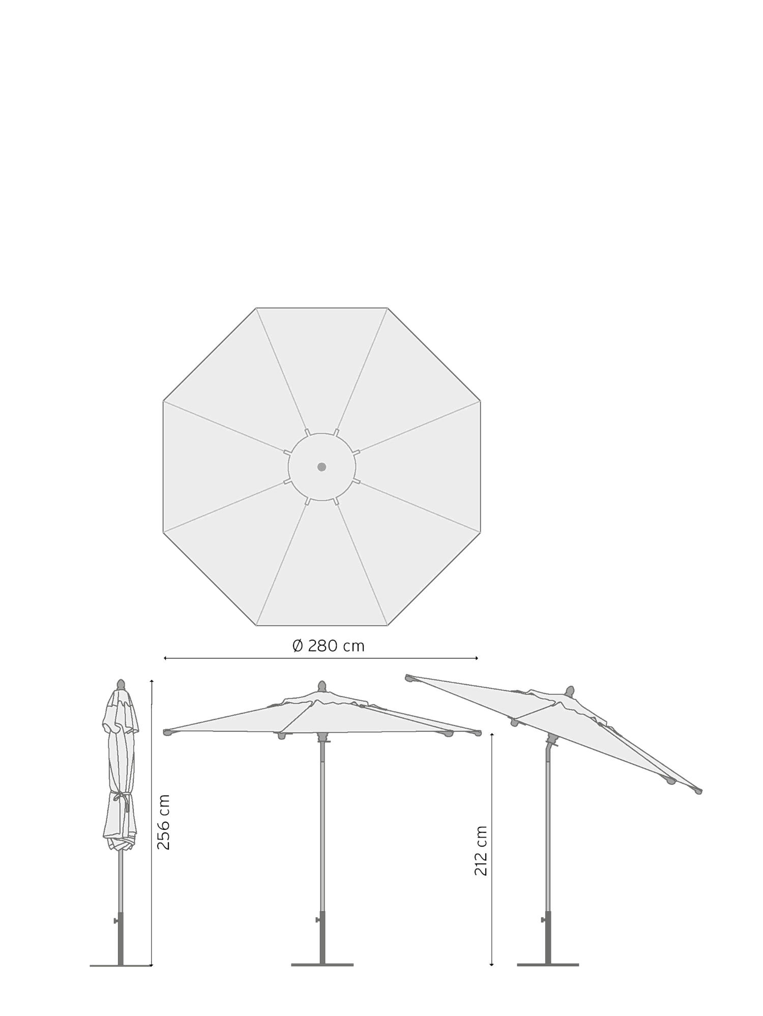 Der runde Schirm hat einen Durchmesser von 2,80 m und eignet sich besonders für kleine Sitzgruppen.