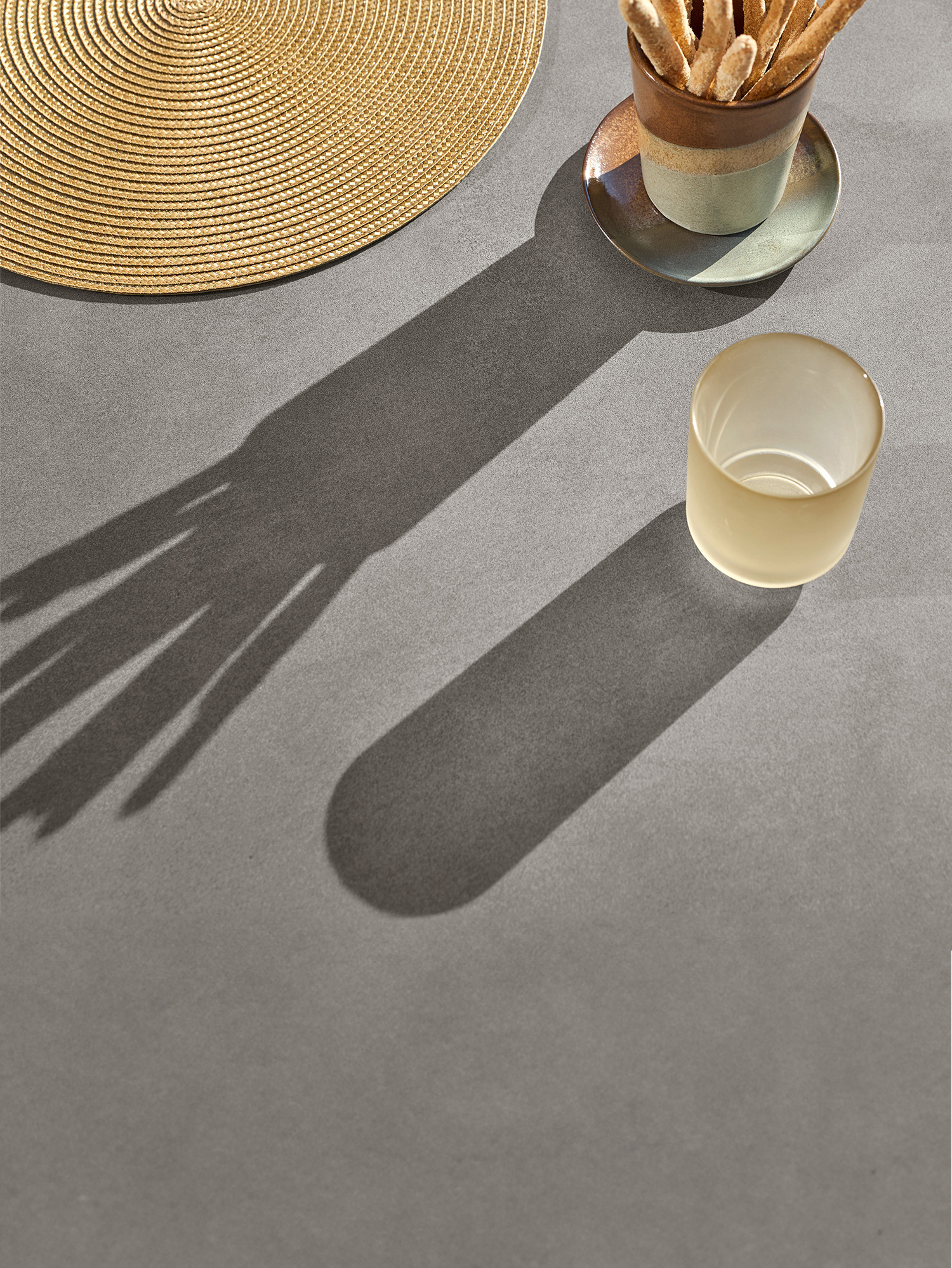 Der Tisch korrespondiert aufgrund seiner niedrigen Höhe perfekt mit den unkonventionellen Möbeln der Casablanca Serie. Sein Gestell besteht aus pulverbeschichtetem, satiniertem Aluminium, die Tischplatte aus wetterbeständigem Kunstharz in einem edlen Grau.