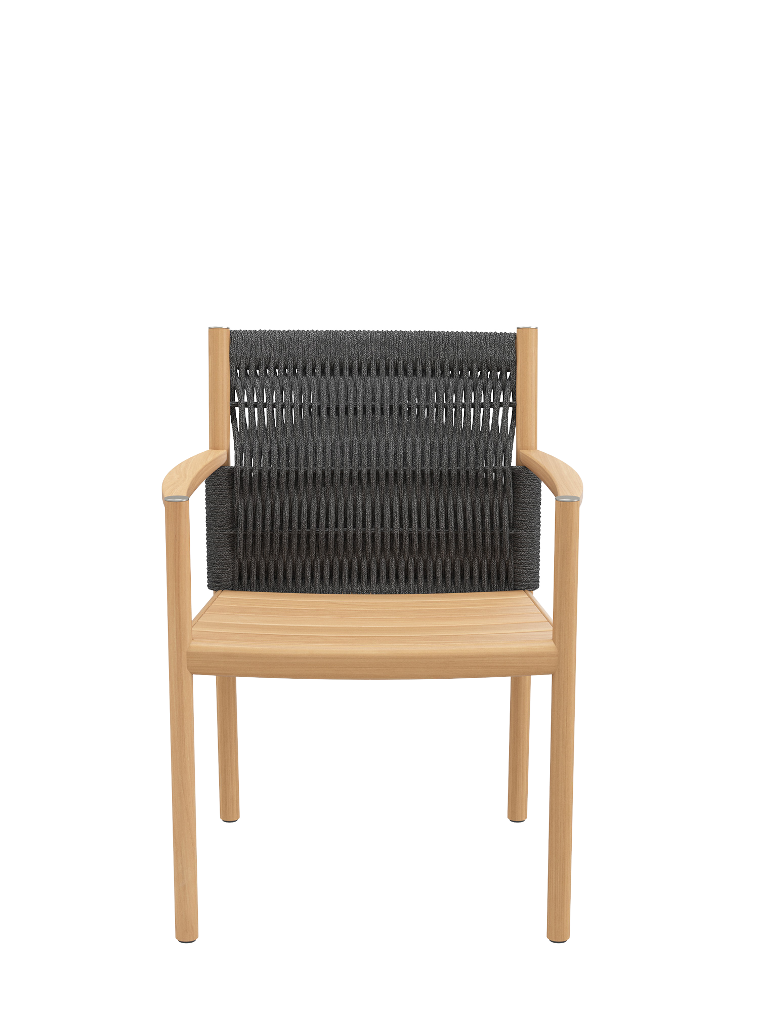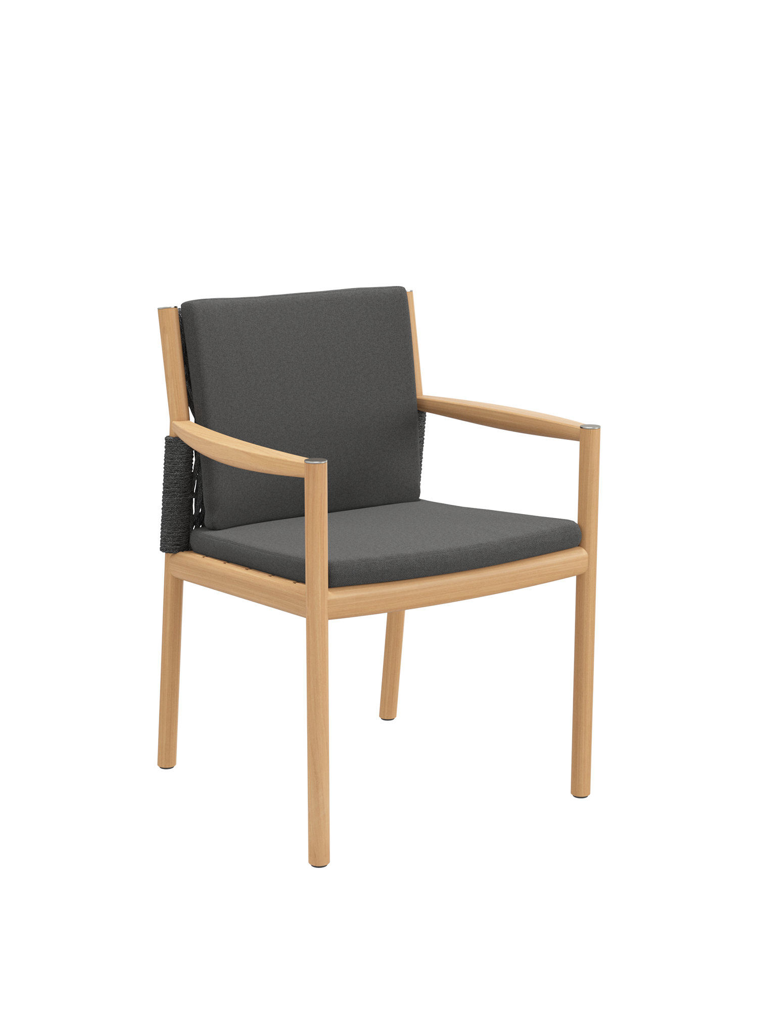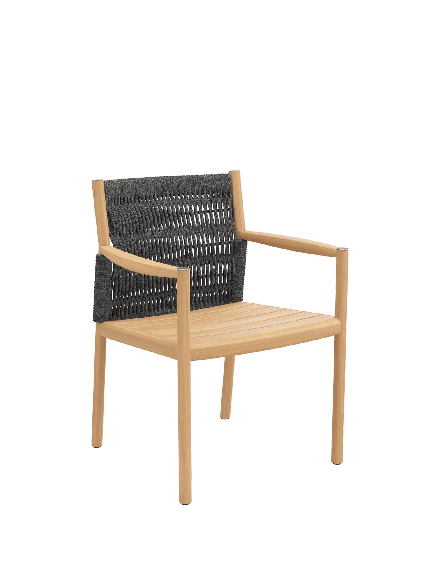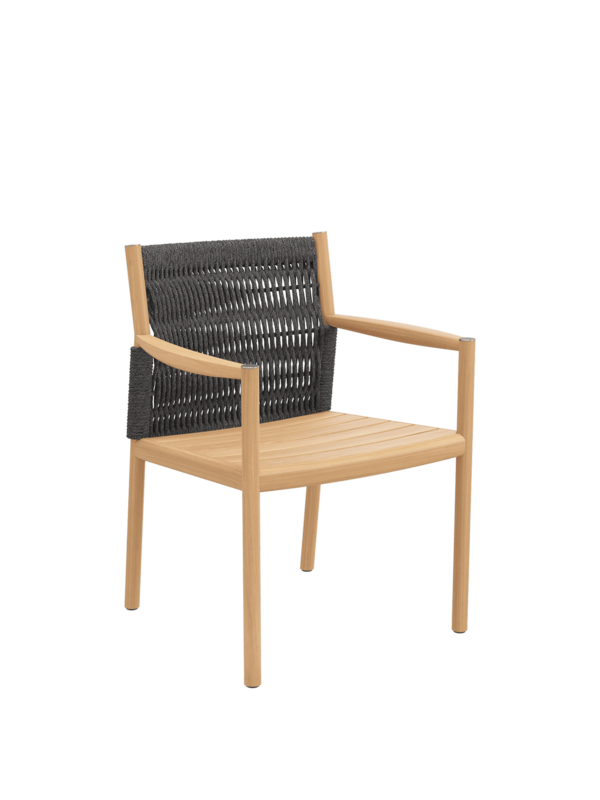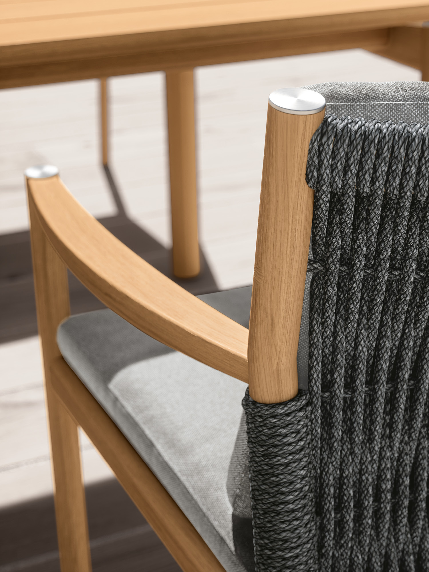 Im unverwechselbaren Design der behaglichen Cavo Kollektion laden die komfortablen Armlehnstühle zu Tisch. Gedrechseltes Plantagenteak bildet die elegante Basis für eine ergonomisch geformte Sitzfläche und sanft gerundete Armlehnen. Die hohe Rückenlehne der Dining Stühle aus anschmiegsamem Kordelgeflecht im Farbton Anthrazit bietet Geborgenheit an langer Tafel oder in kleiner Runde. Feine Edelstahldetails setzen einen vertrauten Akzent. Optional erhältliche Auflagen in verschiedenen Dessins sorgen zusätzlich für Entspannung.