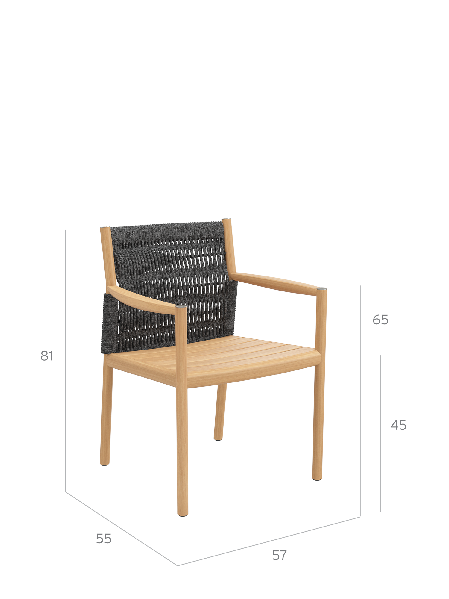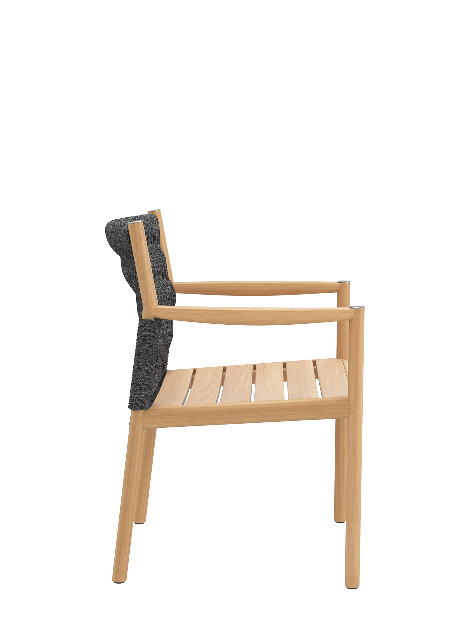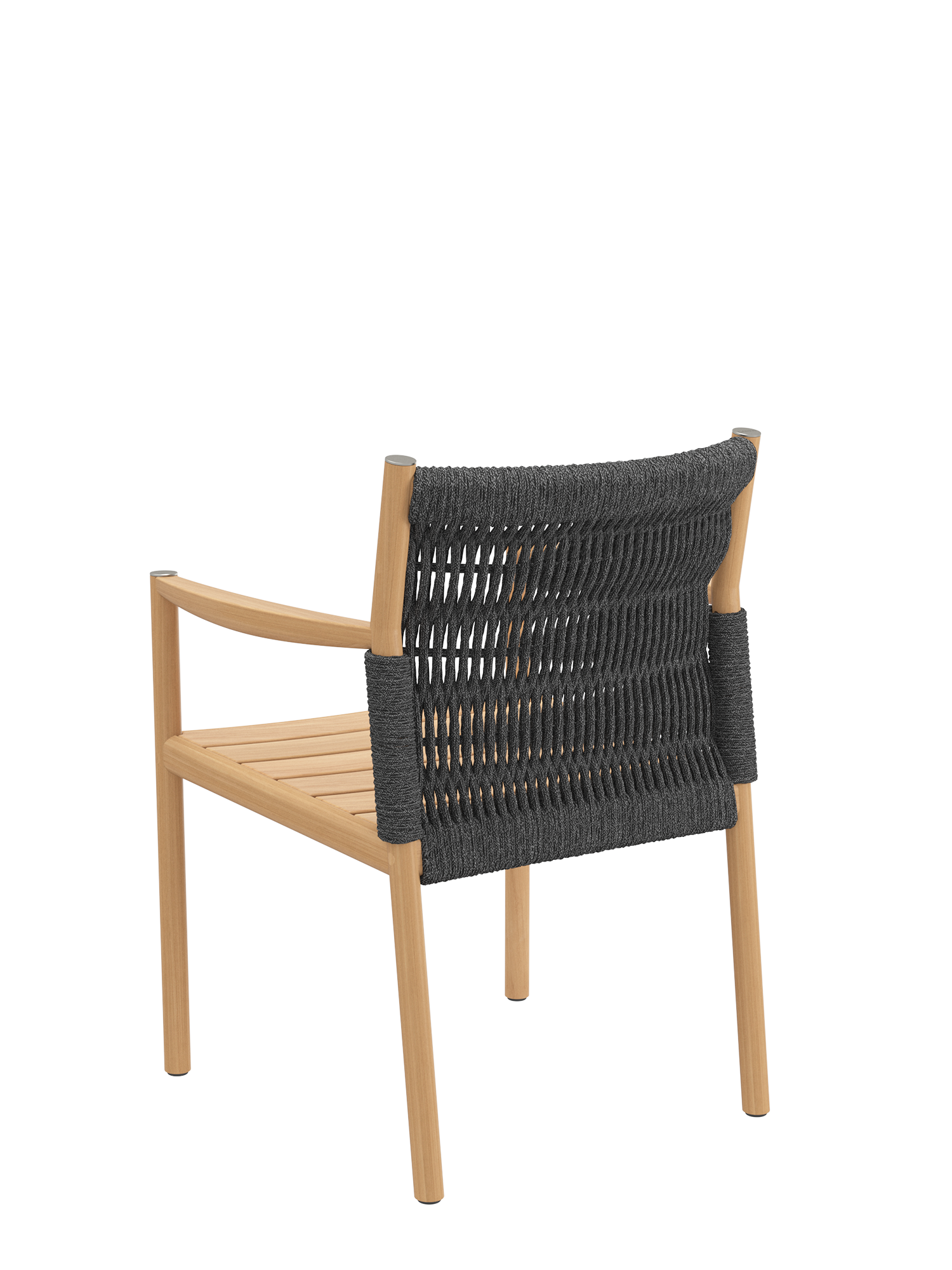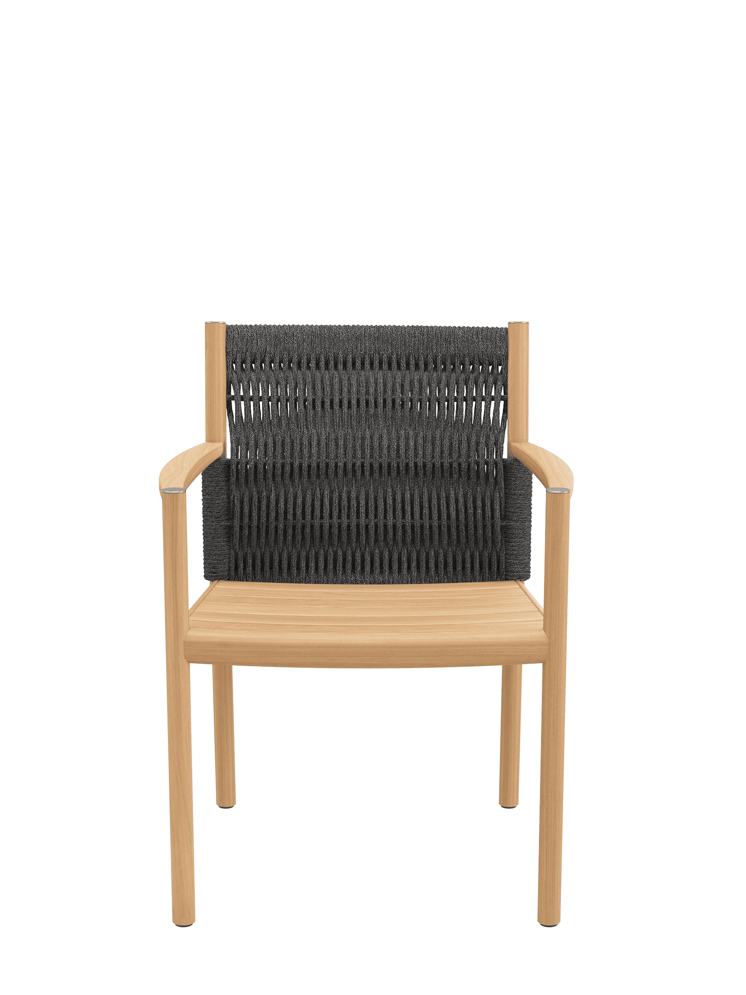 Im unverwechselbaren Design der behaglichen Cavo Kollektion laden die komfortablen Armlehnstühle zu Tisch. Gedrechseltes Plantagenteak bildet die elegante Basis für eine ergonomisch geformte Sitzfläche und sanft gerundete Armlehnen. Die hohe Rückenlehne der Dining Stühle aus anschmiegsamem Kordelgeflecht im Farbton Anthrazit bietet Geborgenheit an langer Tafel oder in kleiner Runde. Feine Edelstahldetails setzen einen vertrauten Akzent. Optional erhältliche Auflagen in verschiedenen Dessins sorgen zusätzlich für Entspannung.