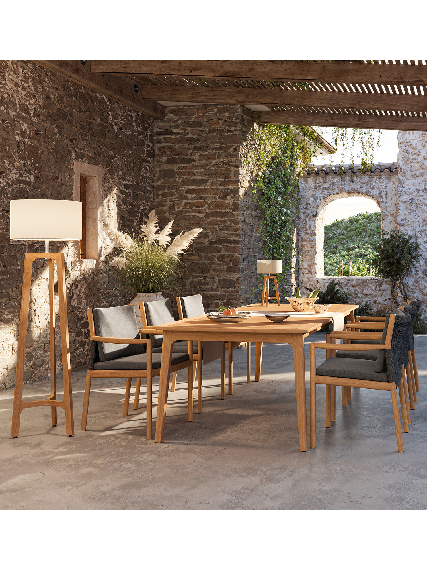 In der Kombination der Cavo Armlehnstühle mit den zeitlosen Preston Tischen der Garpa Kollektion setzt sich das Spiel mit spannenden Kontrasten fort. Die graue Keramikplatte der Tische hat eine fein marmorierte Maserung und wird in einen Rahmen aus Teakholz eingelegt. Nach dem Essen lassen sich die Cavo Armlehnstühle einfach unter die Tischplatte schieben. Die Tische sind in zwei Größen erhältlich und bieten im größeren Format bis zu 8 Personen Platz.