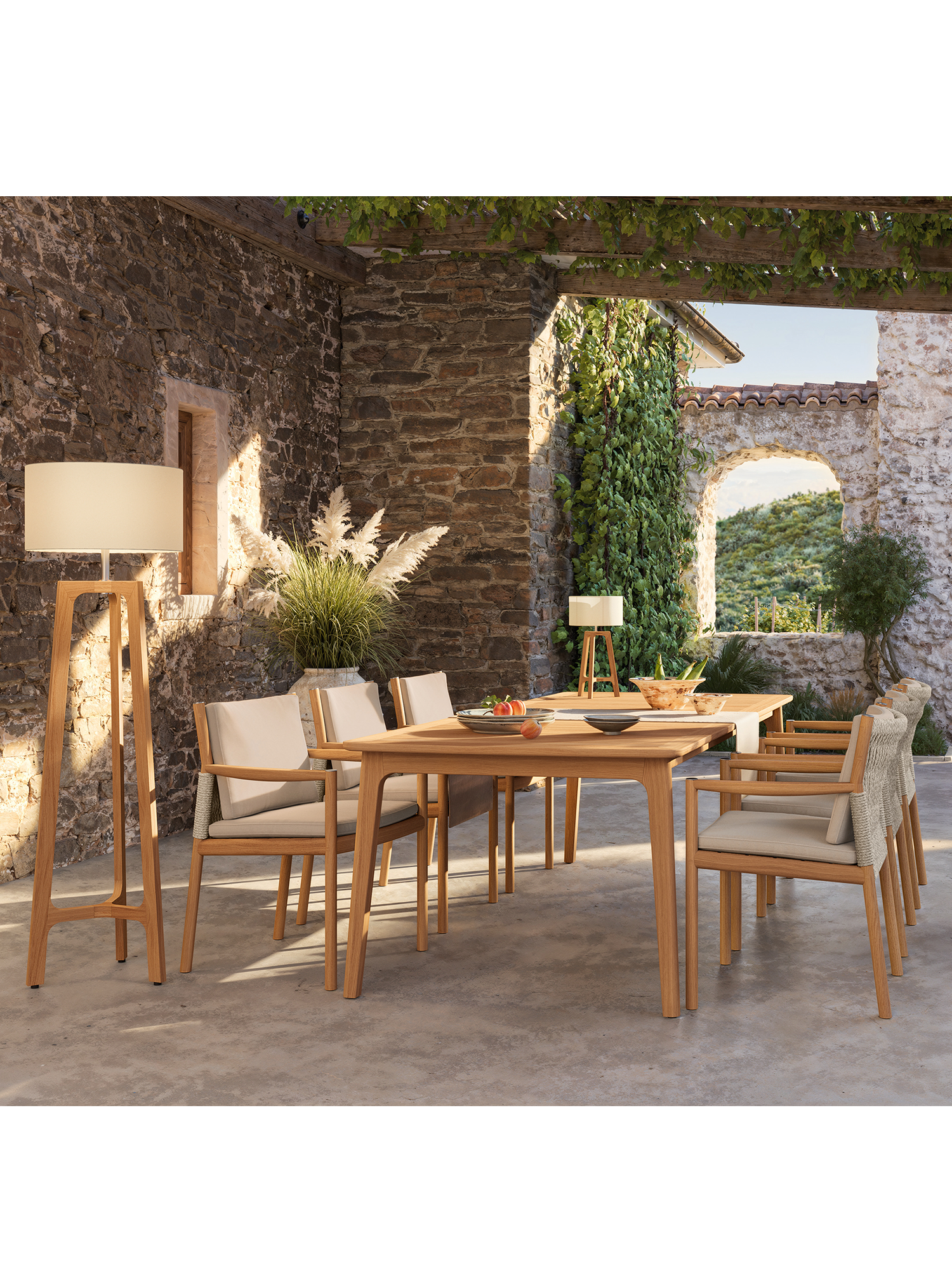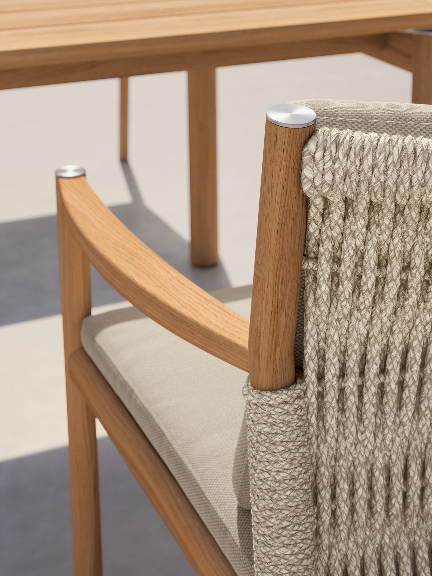 In der Kombination der Cavo Armlehnstühle mit den zeitlosen Preston Tischen der Garpa Kollektion setzt sich das Spiel mit spannenden Kontrasten fort. Die graue Keramikplatte der Tische hat eine fein marmorierte Maserung und wird in einen Rahmen aus Teakholz eingelegt. Nach dem Essen lassen sich die Cavo Armlehnstühle einfach unter die Tischplatte schieben. Die Tische sind in zwei Größen erhältlich und bieten im größeren Format bis zu 8 Personen Platz.
