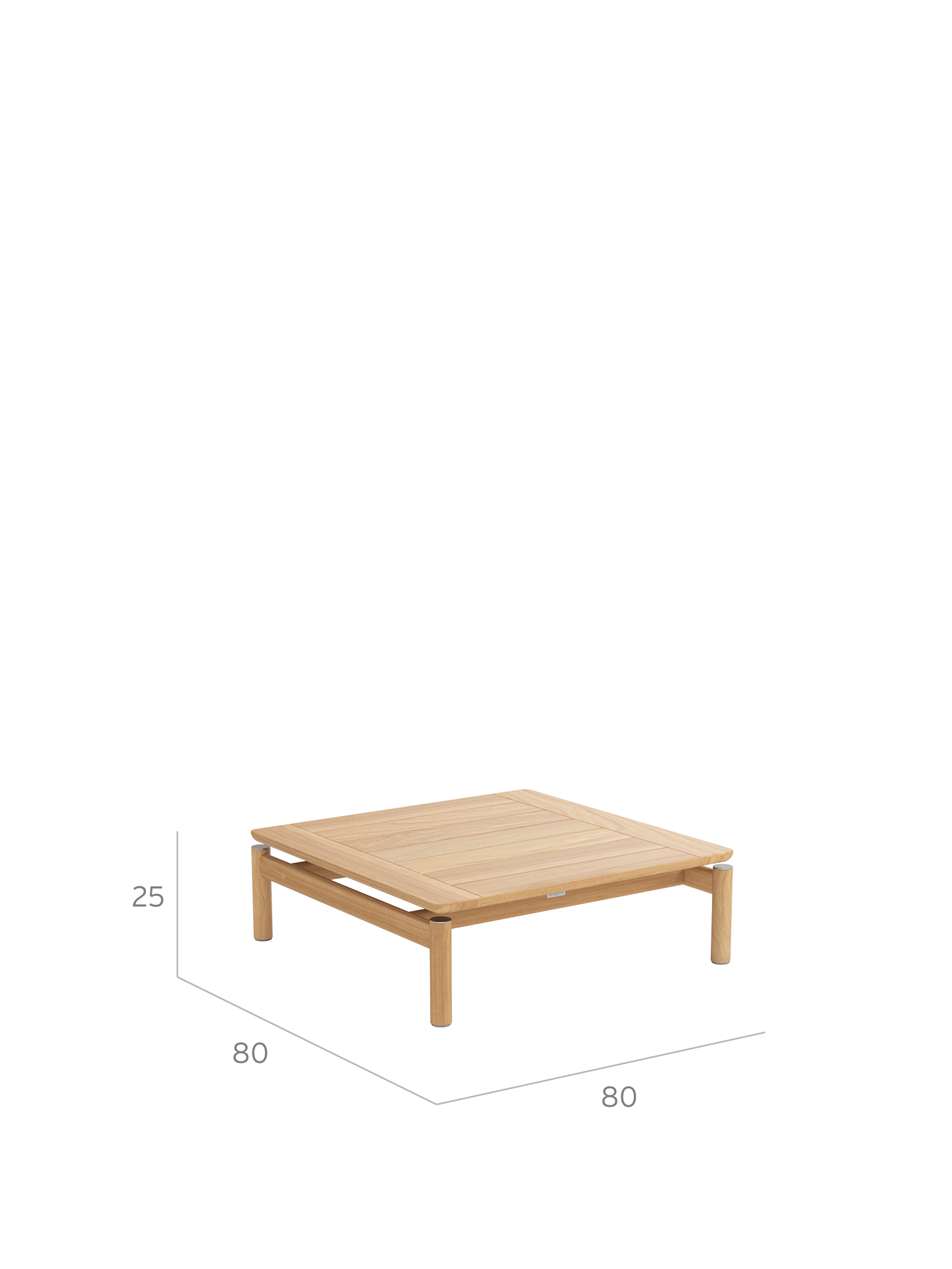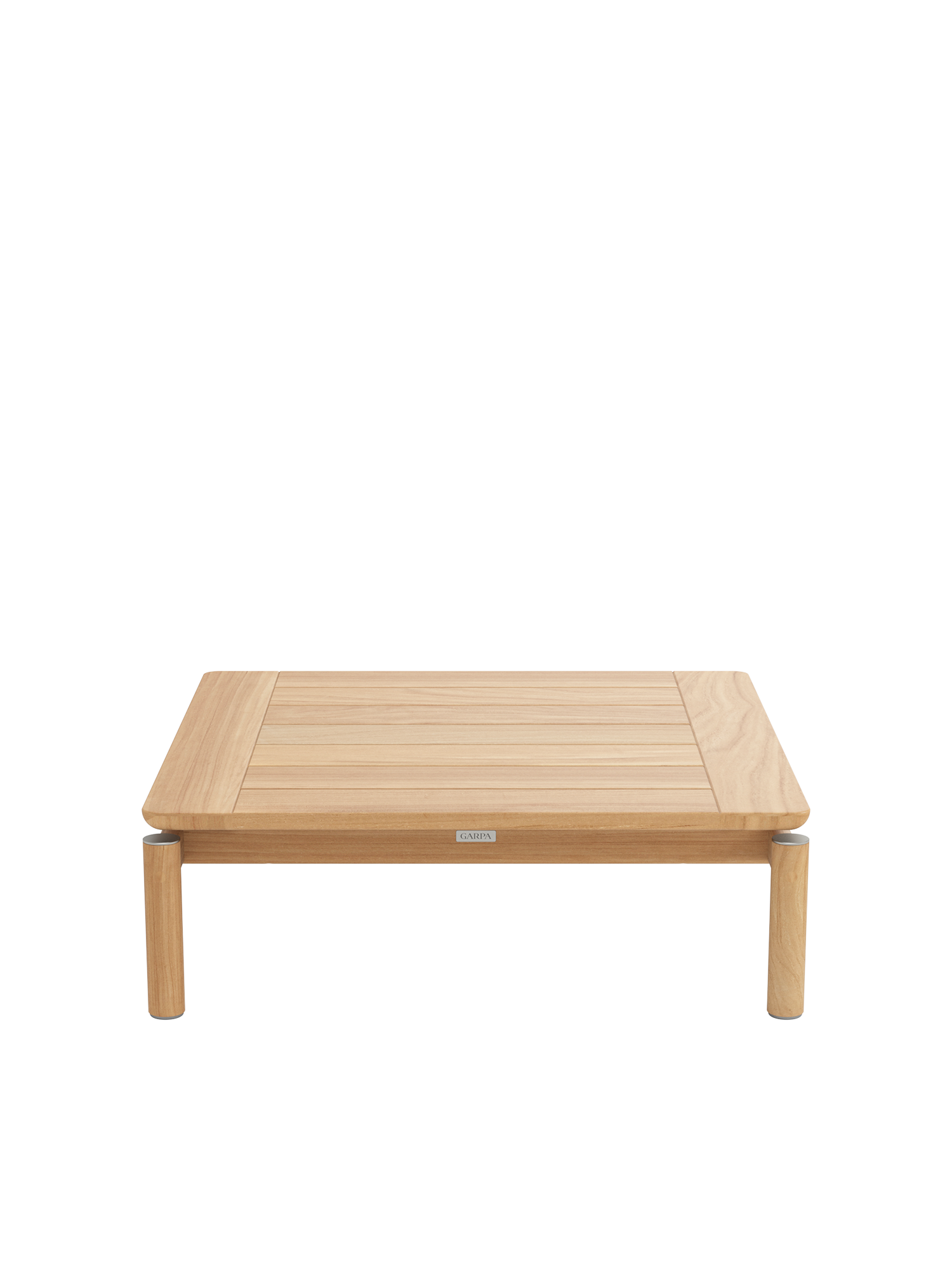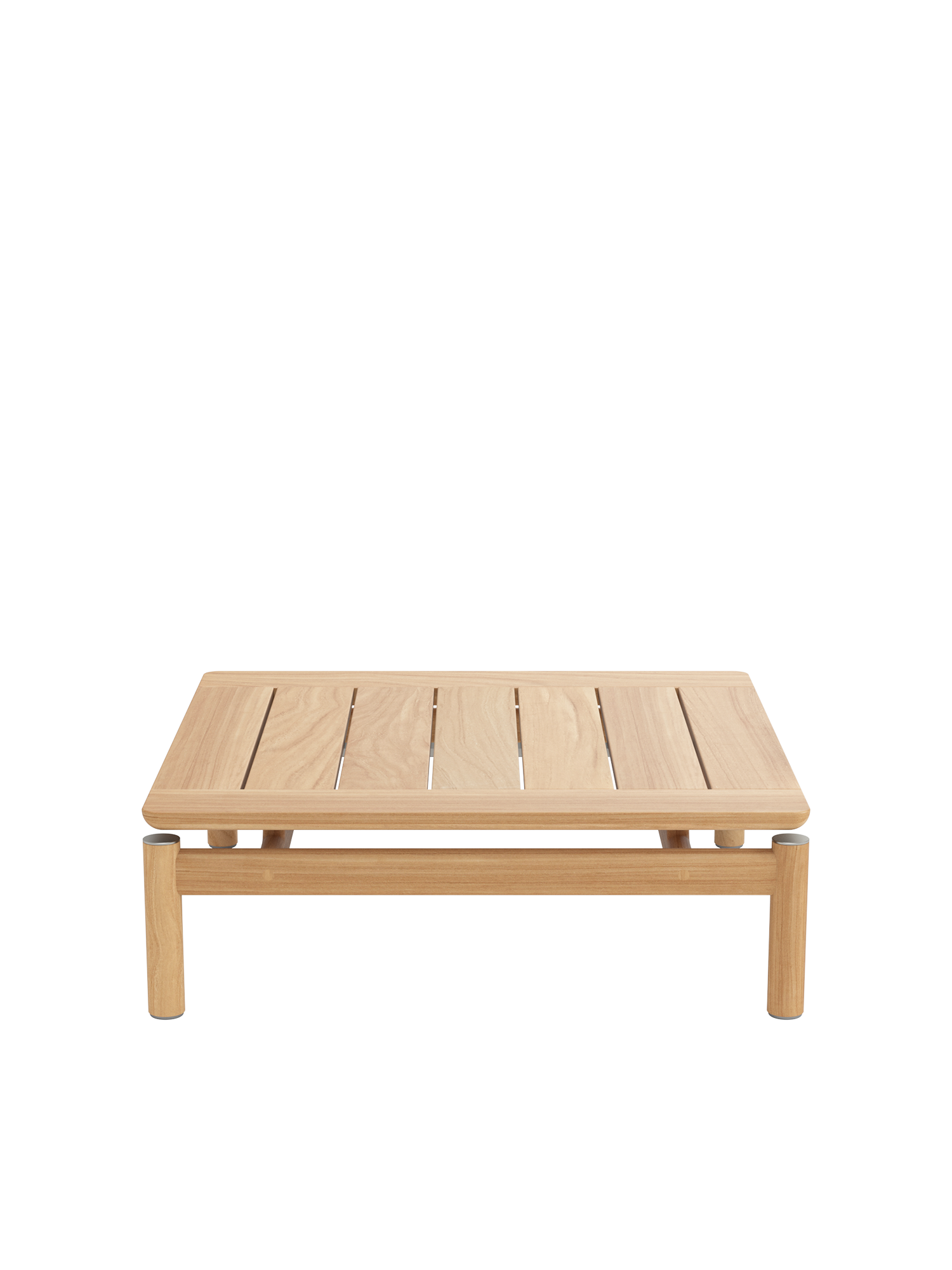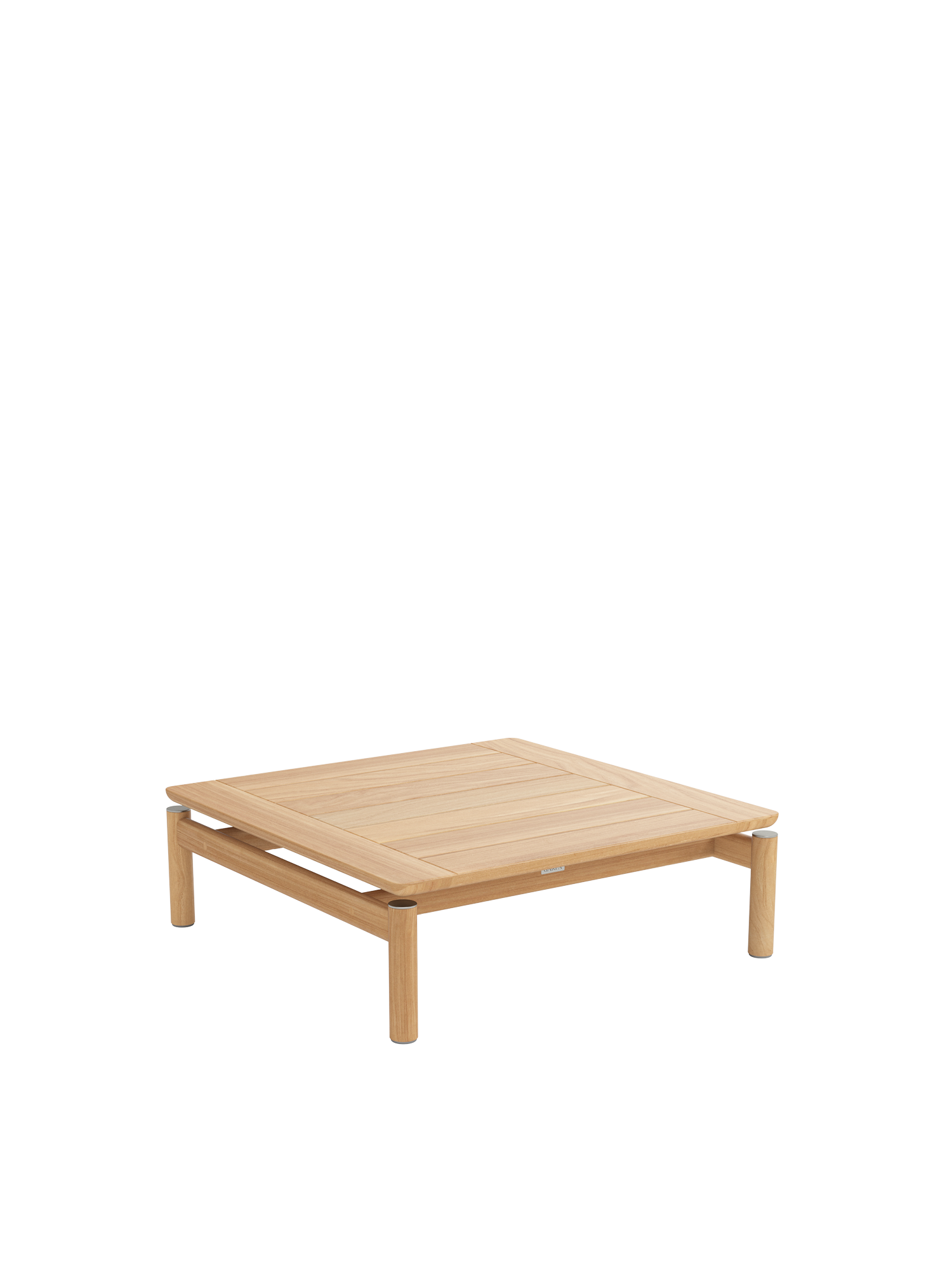 Die passenden niedrigen Tische der Cavo Serie setzen eigene Akzente. Durch ihre individuelle Formgebung scheinen die Platten aus wetterfestem Plantagenteak über den Tischbeinen zu schweben. Abschlusselemente aus gebürstetem Edelstahl unterstreichen das schlichte Design.