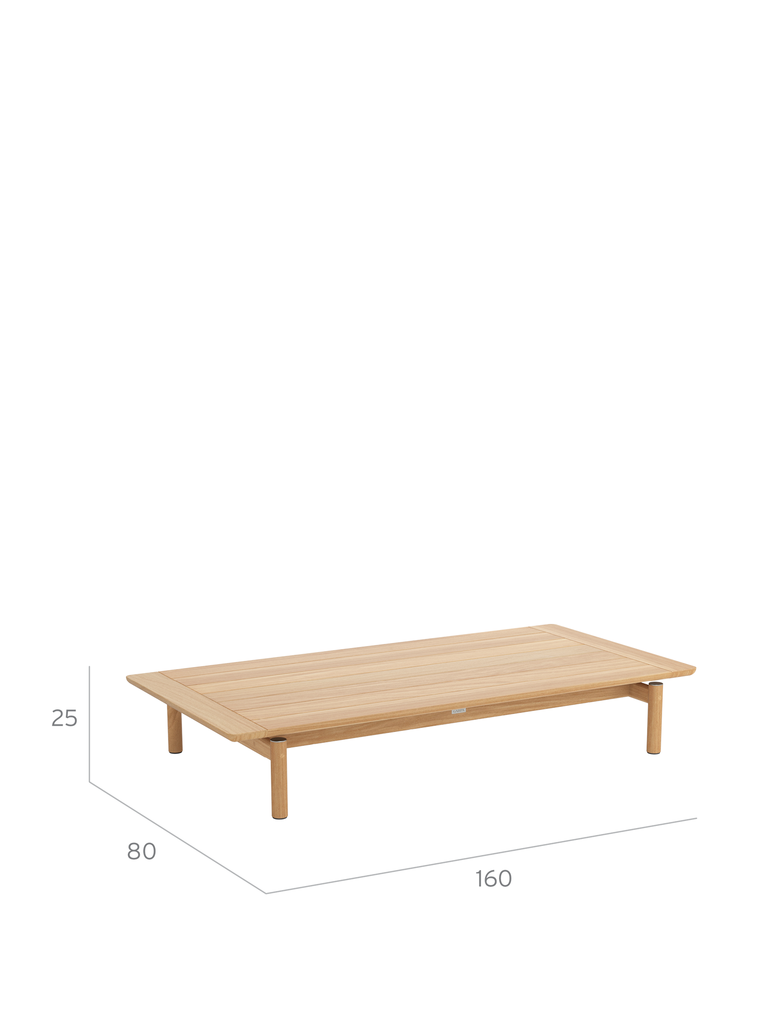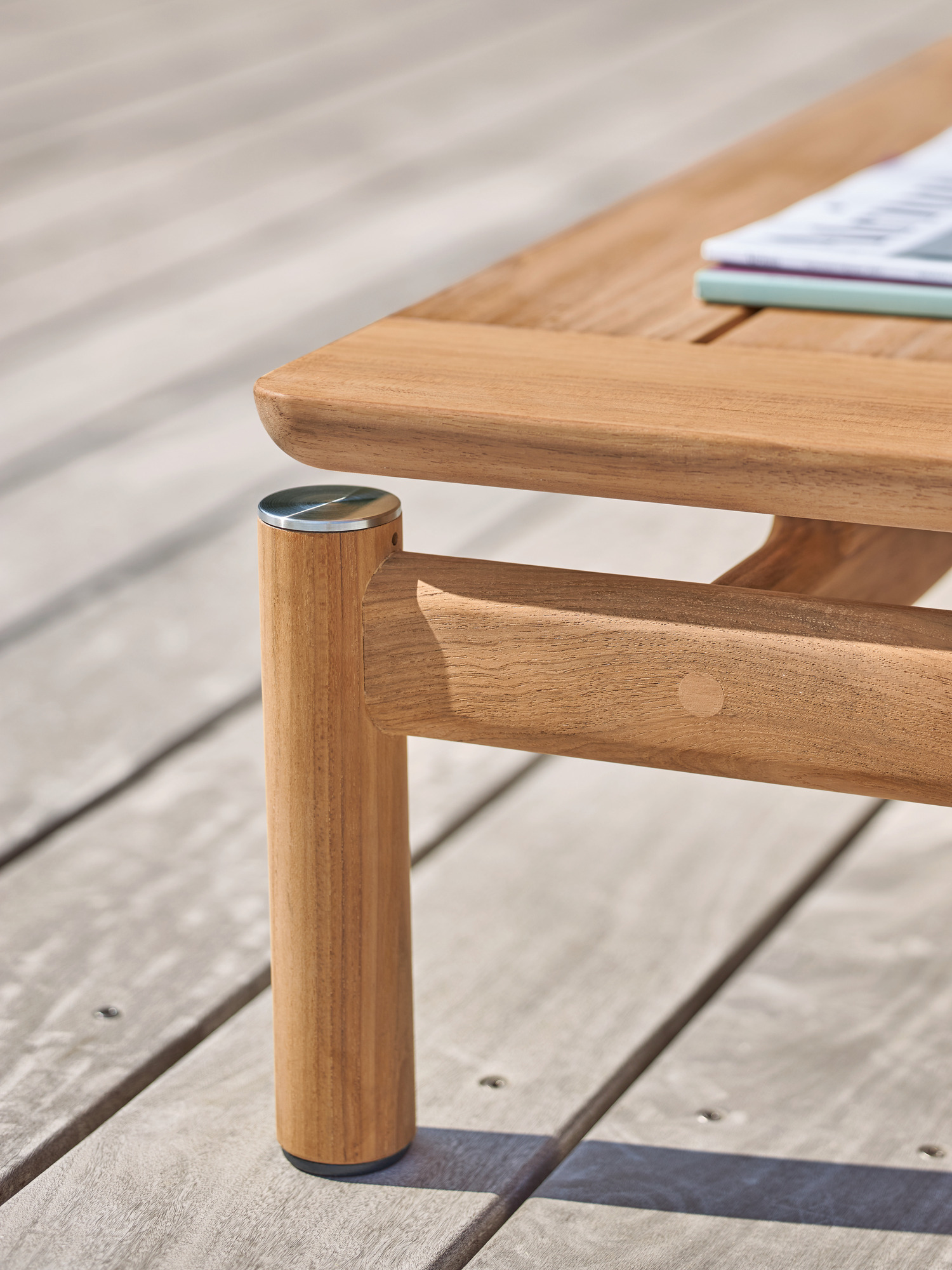 Die passenden niedrigen Tische der Cavo Serie setzen eigene Akzente. Durch ihre individuelle Formgebung scheinen die Platten aus wetterfestem Plantagenteak über den Tischbeinen zu schweben. Abschlusselemente aus gebürstetem Edelstahl unterstreichen das schlichte Design.