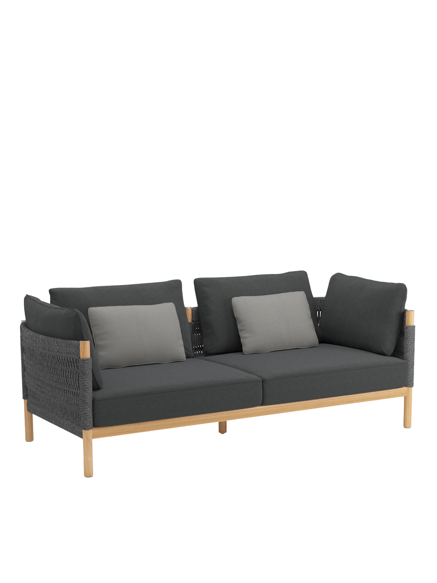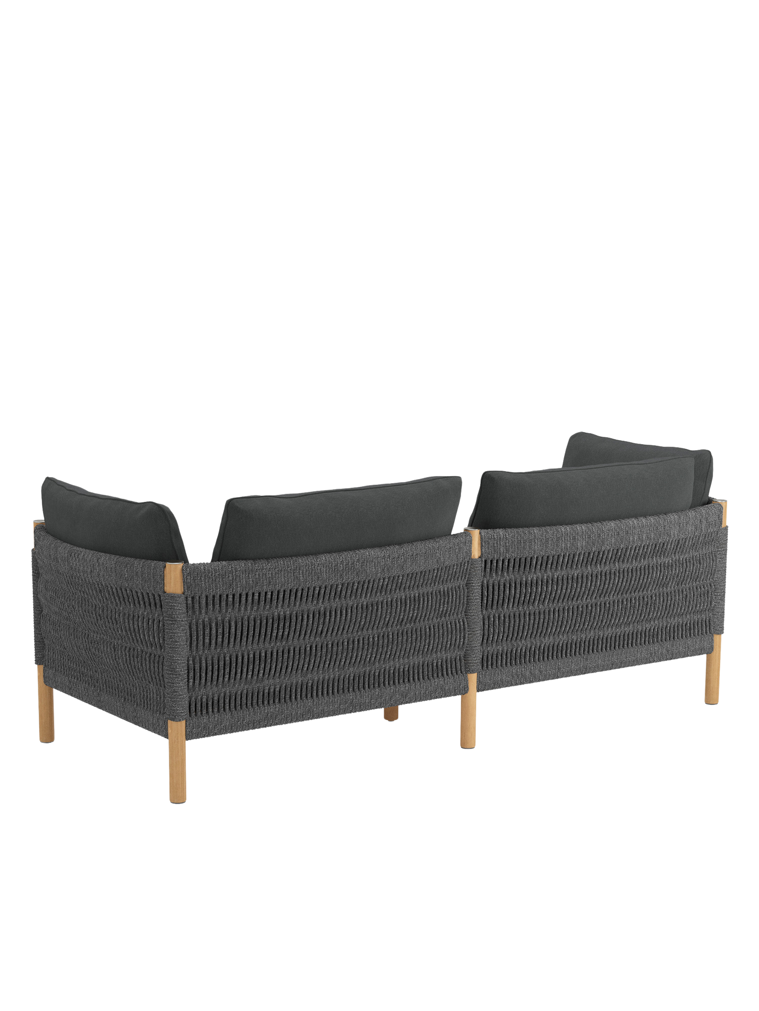 Teakholz übernimmt den klassischen Part in fein gedrechselter Gestalt. Matt gebürstete Edelstahlkappen setzen dazu schlichte Akzente. Eine wetterfeste Kordel in edlem Anthrazit, die von Hand zu einem so markanten wie anschmiegsamen Geflecht verarbeitet wird, schafft innovative Eleganz. Das hochwertige Material besteht aus Polypropylen mit einem Polyesterkern.