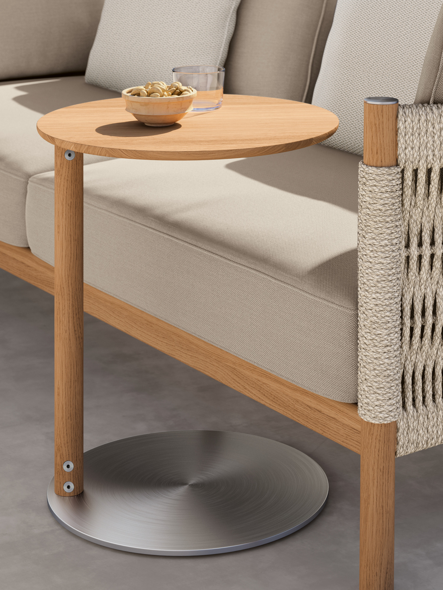 Teakholz übernimmt den klassischen Part in fein gedrechselter Gestalt. Matt gebürstete Edelstahlkappen setzen dazu schlichte Akzente. Eine wetterfeste Kordel in edlem Beige, die von Hand zu einem so markanten wie anschmiegsamen Geflecht verarbeitet wird, schafft innovative Eleganz. Das hochwertige Material besteht aus Polypropylen mit einem Polyesterkern.