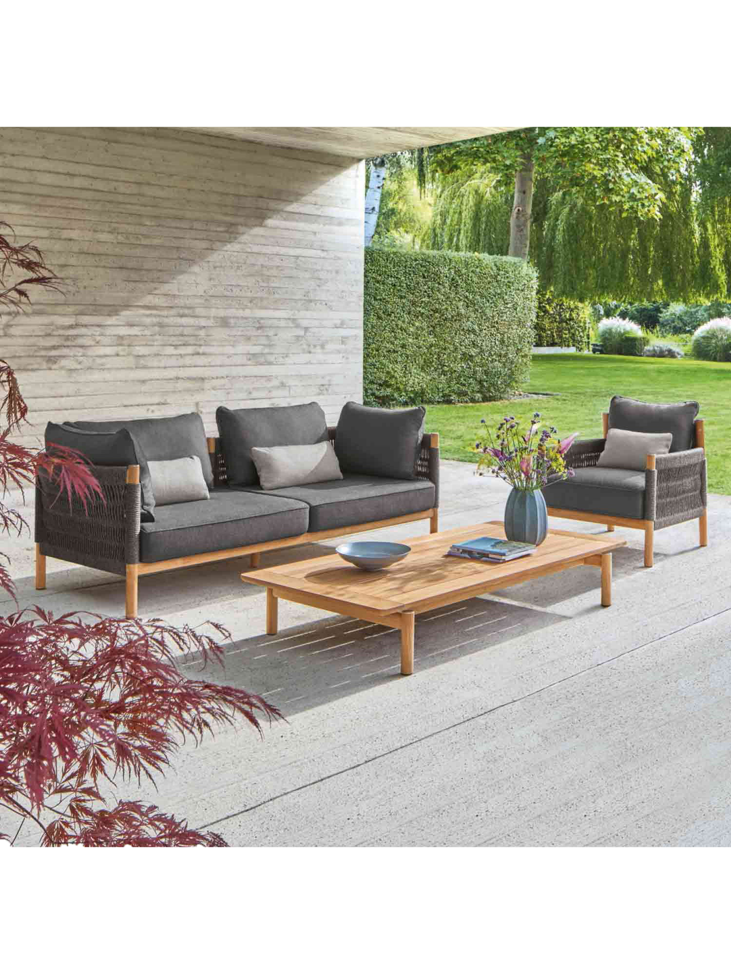Das Cavo Lounge Set hat ein markantes Merkmal – die wetterfeste und von Hand aufgeflochtene Kordel der Polstermöbel, die mit hochwertigem, von Edelstahl akzentuiertem Teakholz harmoniert. Gemeinsam mit dem Couchtisch werden Sessel und Sofa zum individuellen Rückzugsort, der maximalen Komfort im Garten oder auf der Terrasse verspricht.