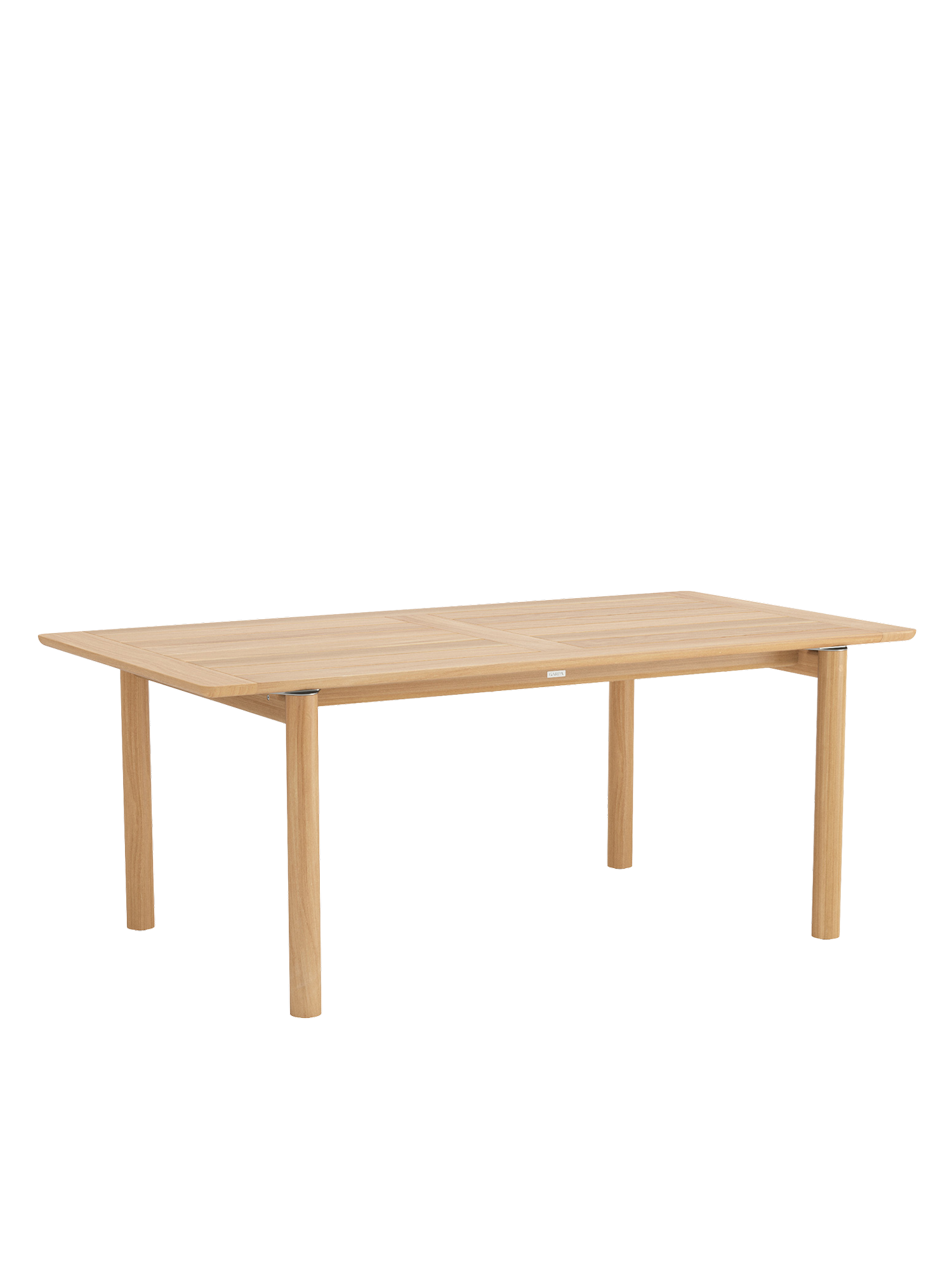 Gedrechselte Beine mit eleganten Edelstahlkappen sorgen für die fast schwebende Anmutung des massiven Tisches, der mit seiner schlichten Formgebung den stattlichen Mittelpunkt jeder Tafelgesellschaft bildet. Das prägnante Design mit breiten Teakleisten und sanft abgerundeten Konturen vermittelt Leichtigkeit und Stabilität zugleich. Höhenversteller an den Beinen gleichen Unebenheiten im Boden aus.