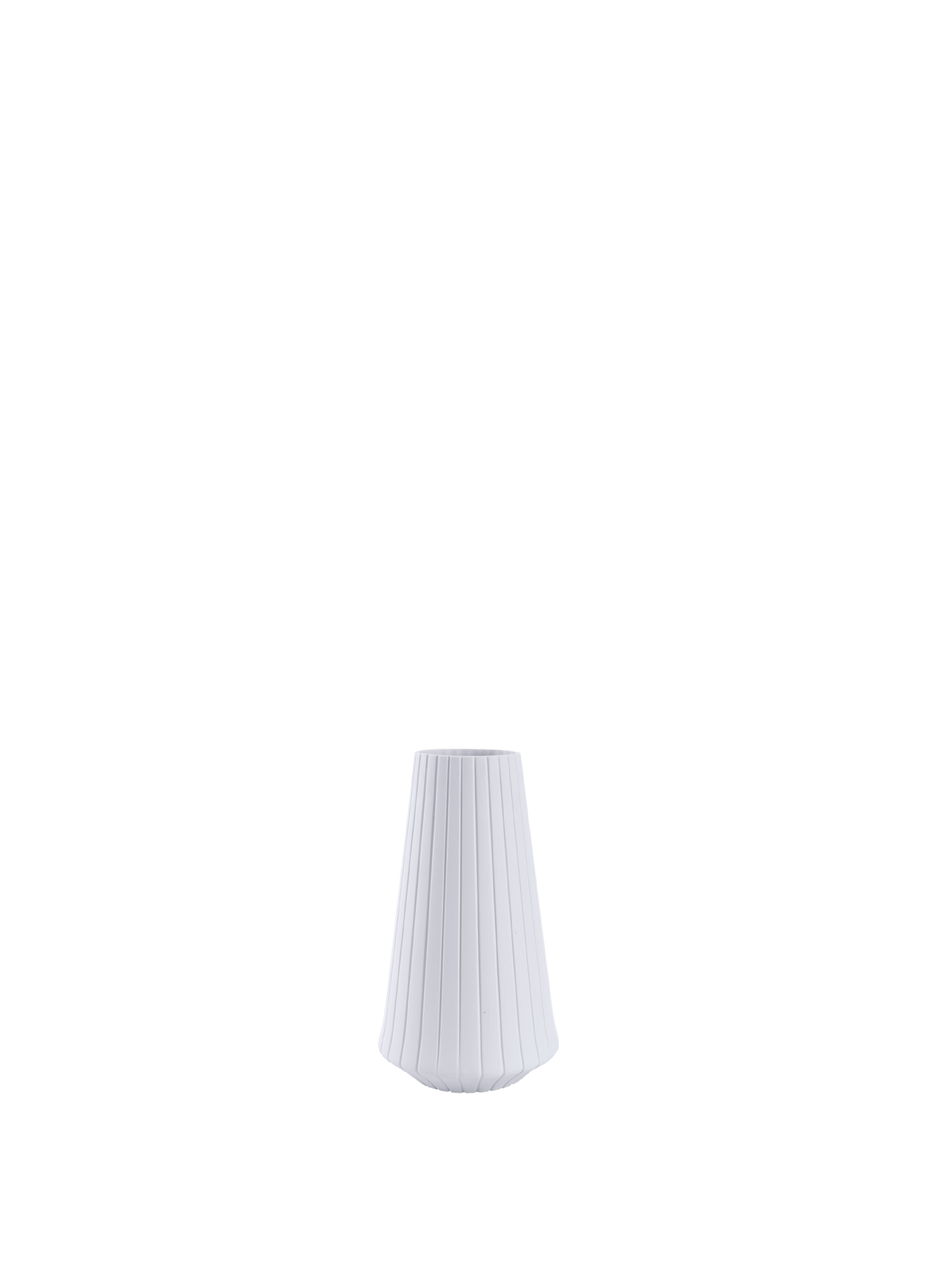 Aus derselben Manufaktur stammen die runden Exemplare, die insbesondere als Bodenvase stilsicher im Raum stehen - sowohl innen, als auch außen. Die Oberflächen aller Vasen ziert ein feines Streifenrelief.