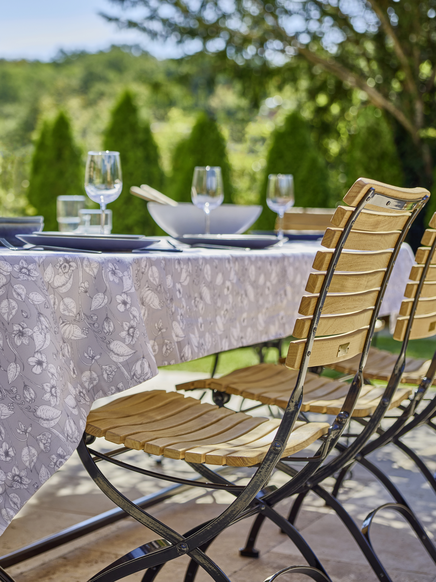 Auf der Colmar Tischdecke breiten sich Blumen und Blätter aus. Die Farbnuancen reichen von lichtem Grau bis Anthrazit und ergeben ein stimmiges Gesamtbild, das Tische in der entsprechenden Größe aufwertet.