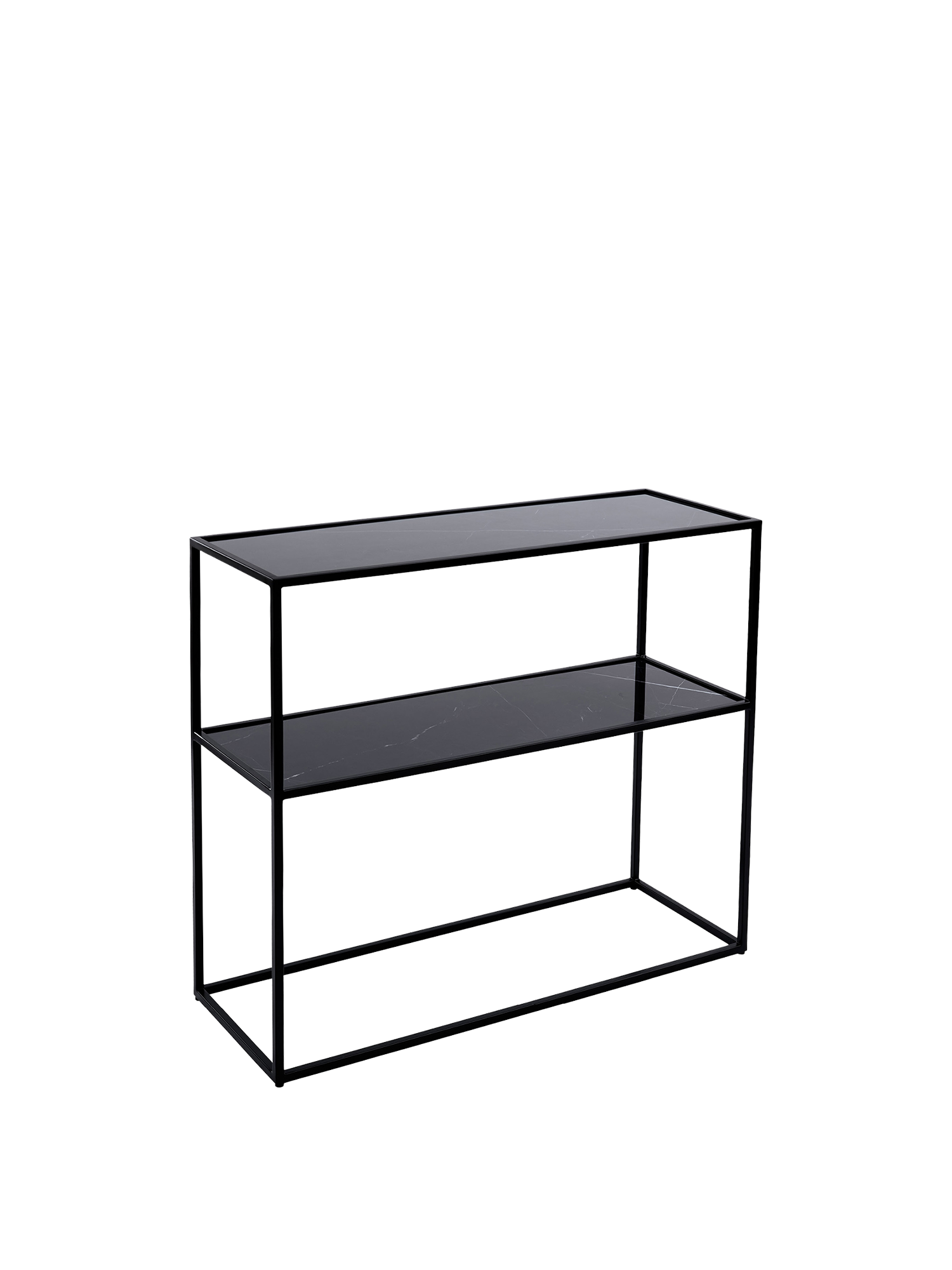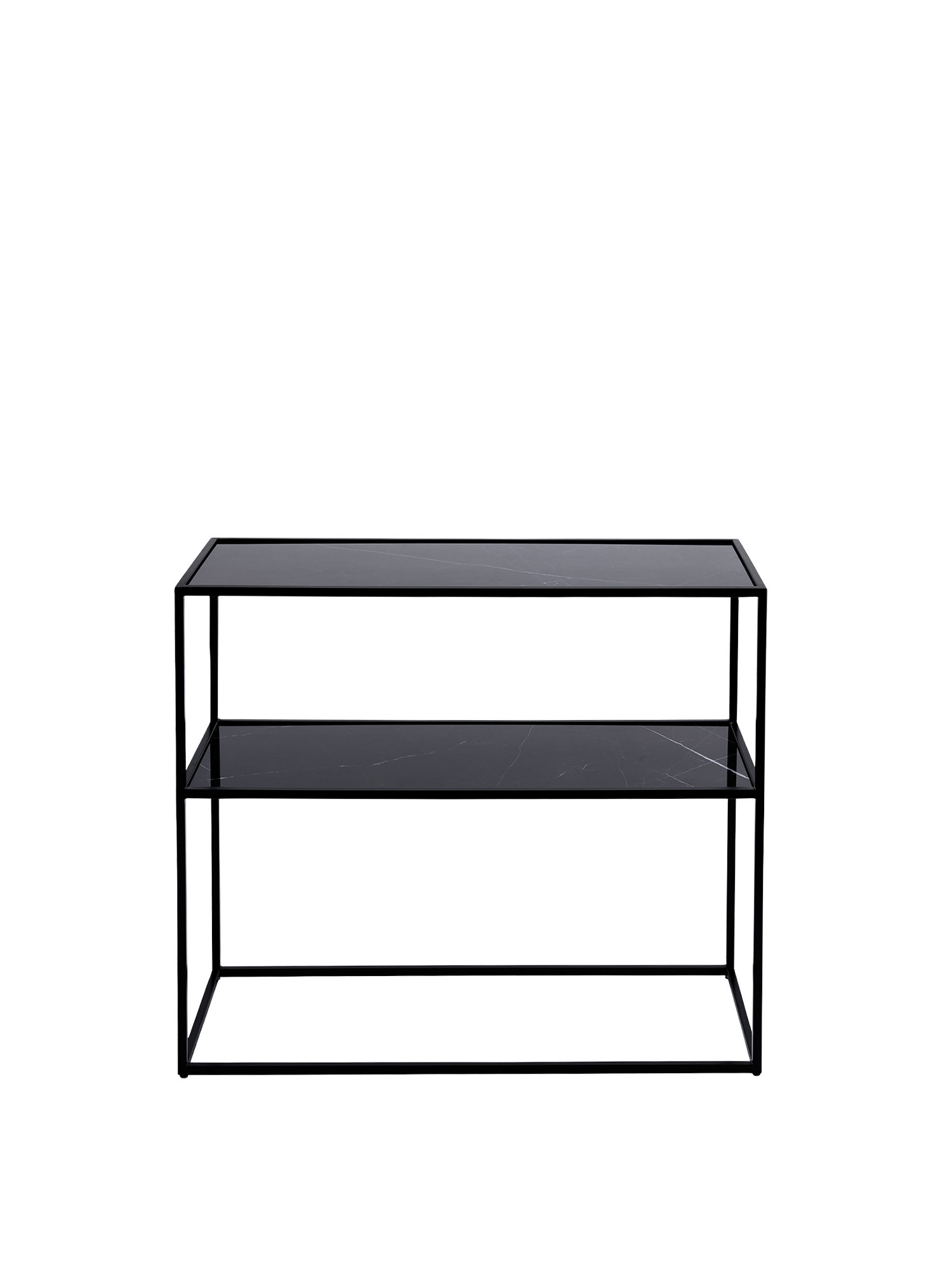 Die feingliedrigen Gestelle der Cube Konsole und des Cube Beistelltischs bestehen aus schwarz pulverbeschichtetem Aluminium. Die Ablageflächen aus glänzend polierter Keramik haben die Anmutung von dekorativ geädertem Marmor.