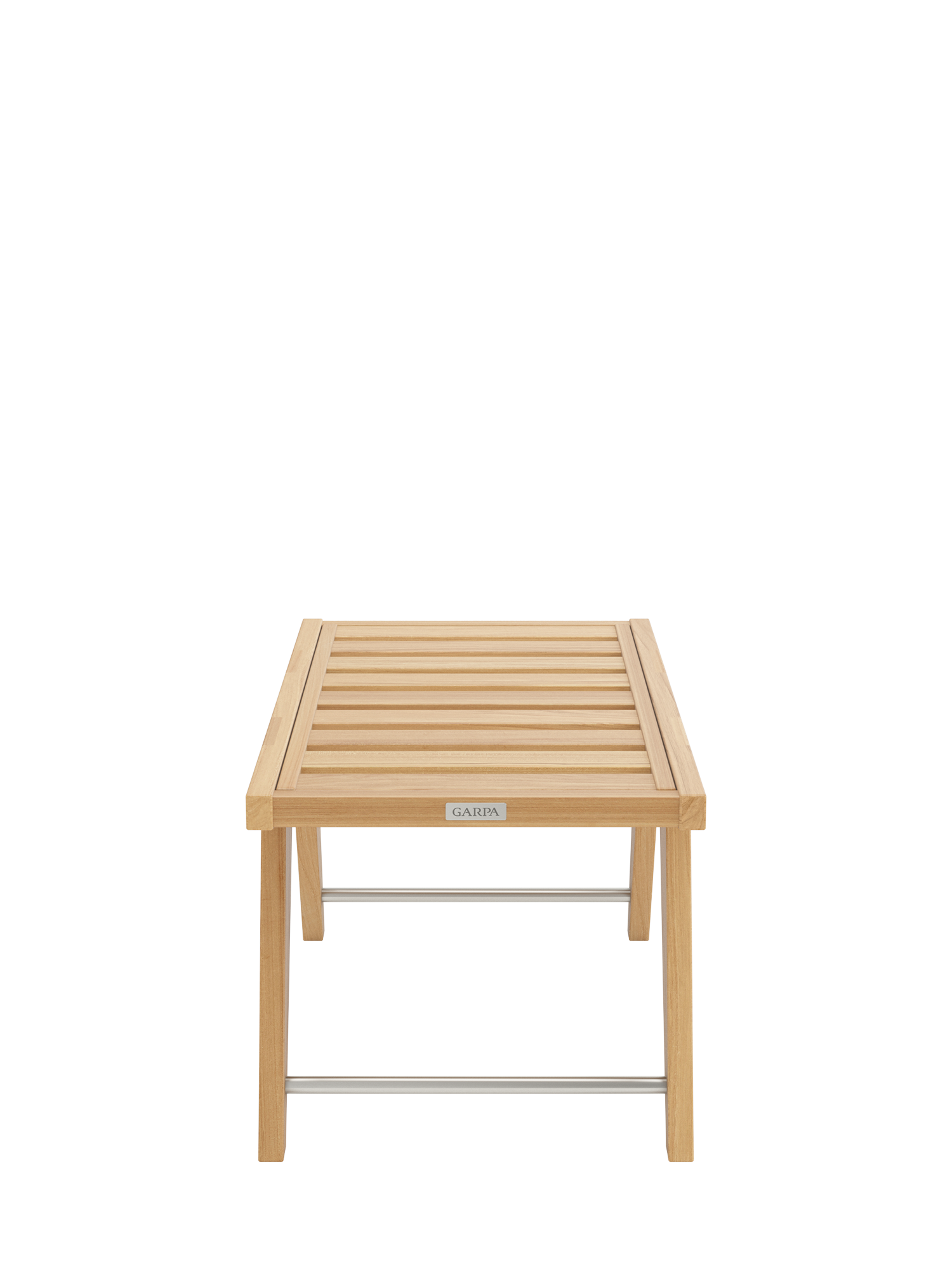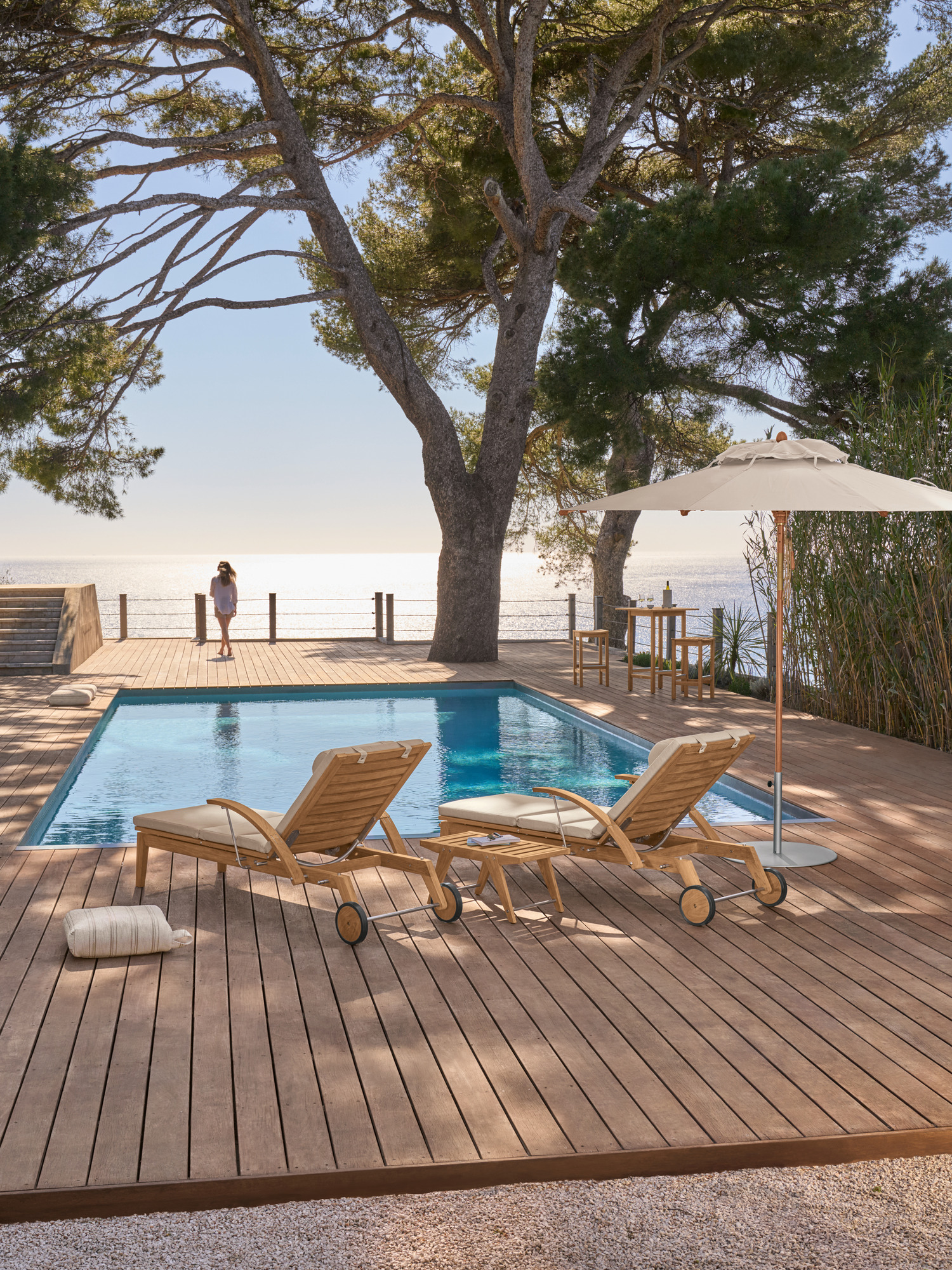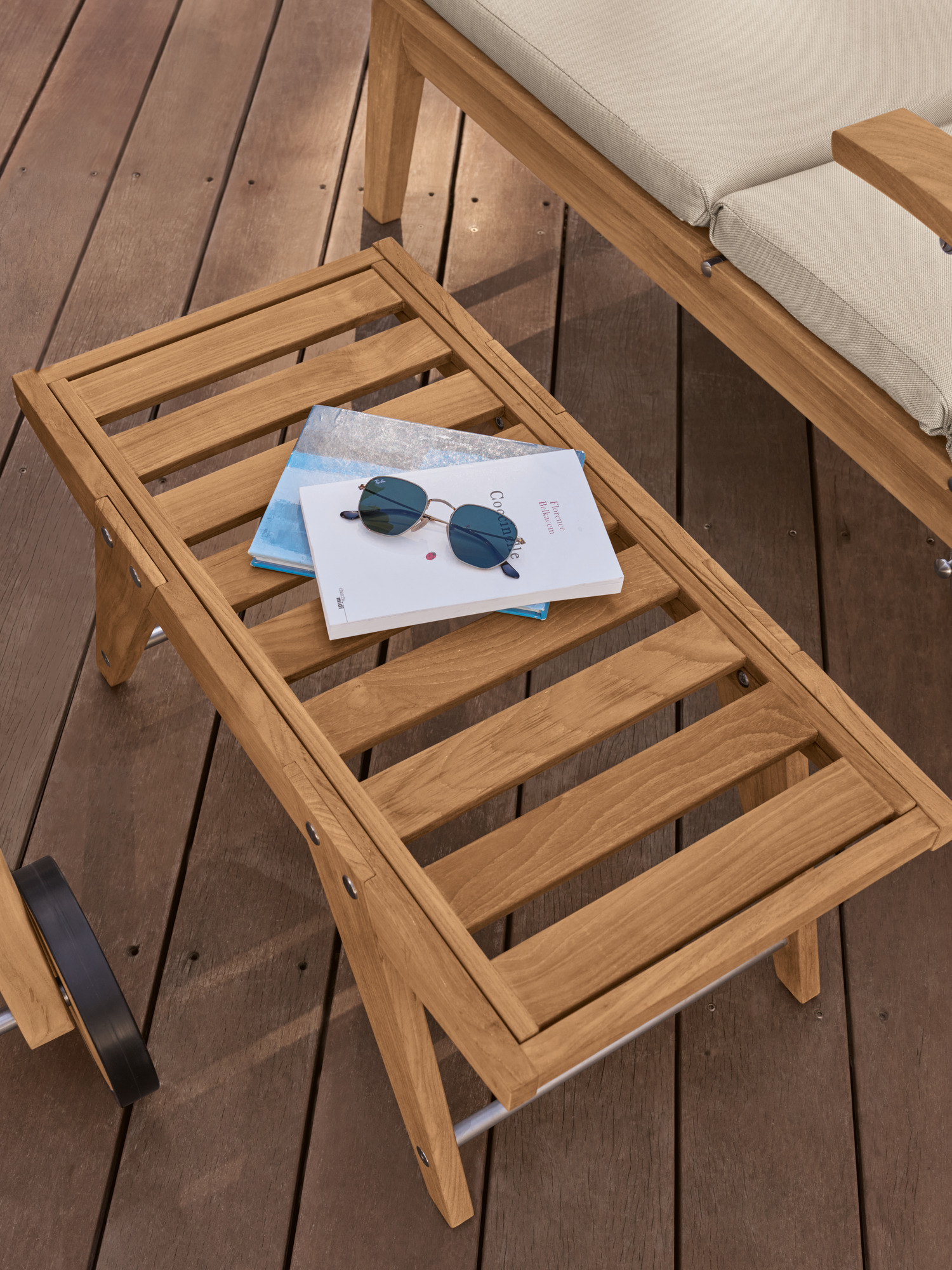 Die Doppia Beistelltische aus Teak sind in drei Varianten und mit Oberflächen aus Teak oder Kunstharz erhältlich. Sie halten direkt neben der Liege Lektüre, Snacks oder Getränke in angenehmer Reichweite.