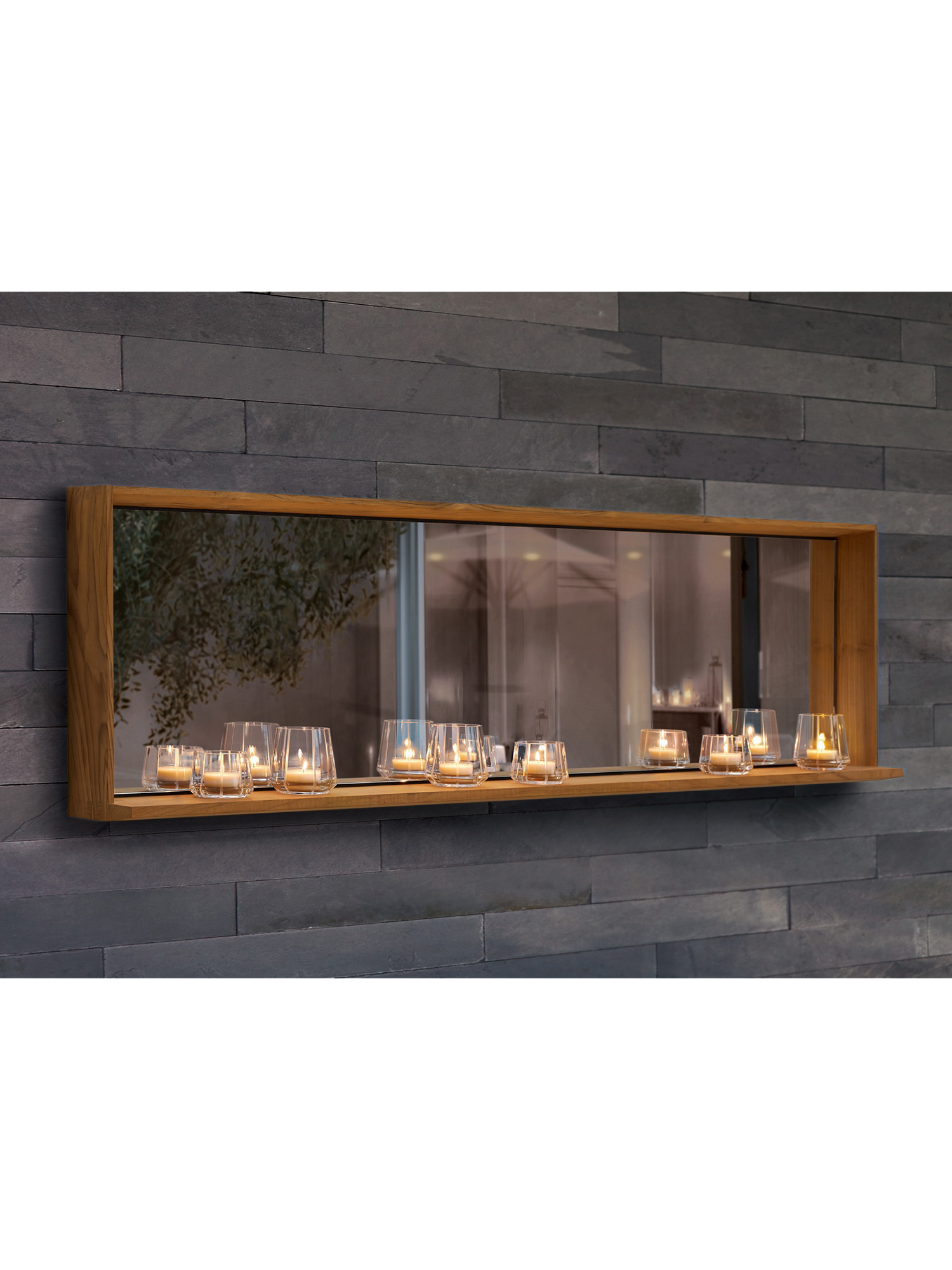 Hoch und schmal, hoch und breit, schmal und waagerecht: Die großen Fascino Spiegel in verschiedenen Größen und Formaten können ganz nach Wunsch im Haus oder im Freien aufgehängt werden. Auf ihren eleganten Borden lassen sich Vasen und Accessoires besonders wirkungsvoll dekorieren. Die hochwertigen, wetterfesten Teakrahmen sind mit Abtropfkanten versehen. Dennoch empfiehlt sich für draußen ein trockener, geschützter Platz an der Hauswand oder unter einem Dachvorsprung.