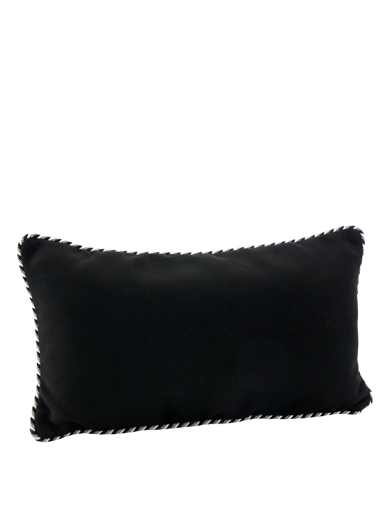 Das längliche Kissen mit einem schwarz-weißen Keder ist mit Naturfedern gefüllt.