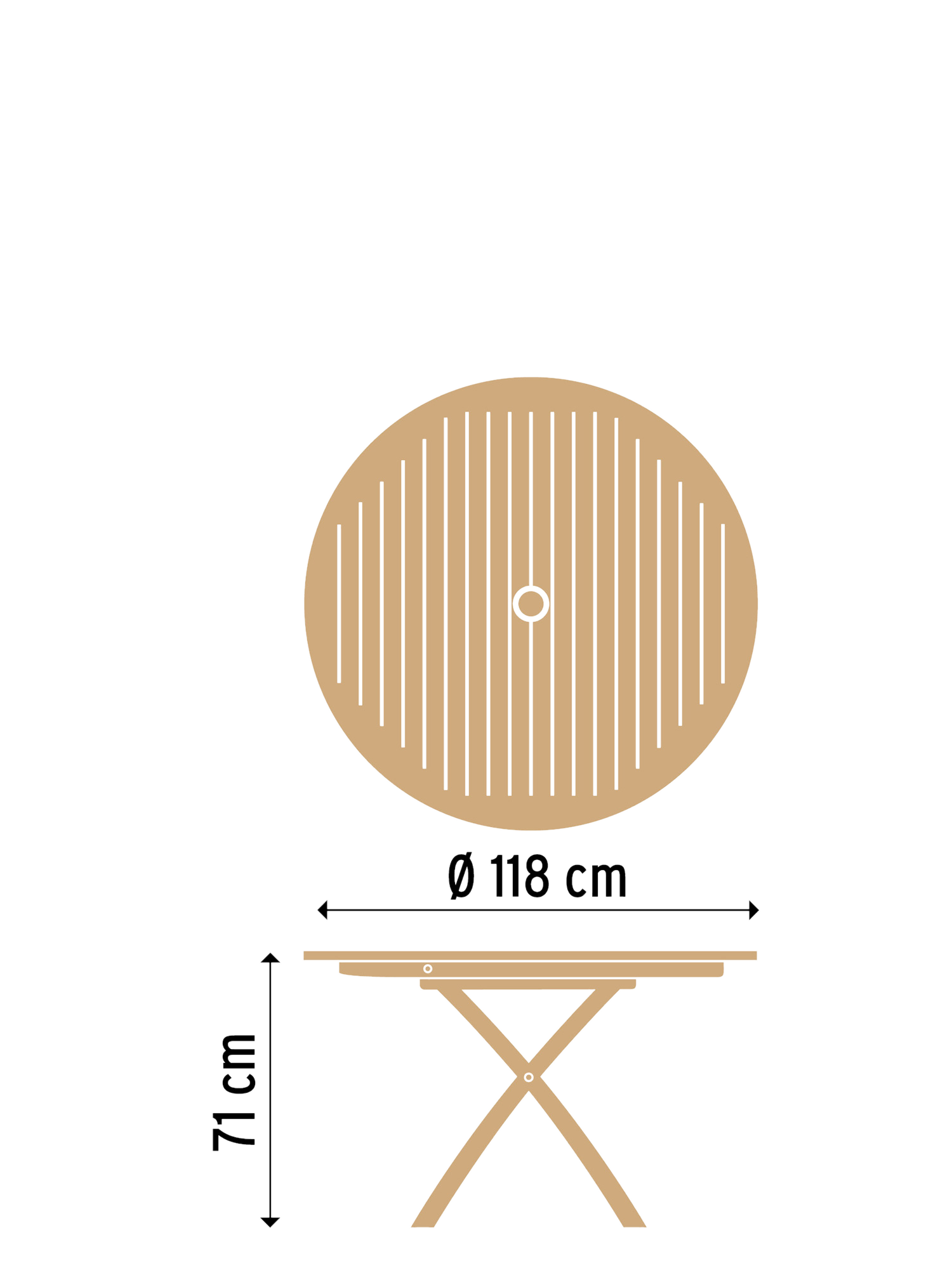 Aufgrund des simplen Klappmechanismus lässt sich der Tisch komfortabel transportieren und platzsparend verstauen. Das Schirmloch in der Mitte der Platte kann an sonnenärmeren Tagen mit einem Teakstopfen verschlossen werden.