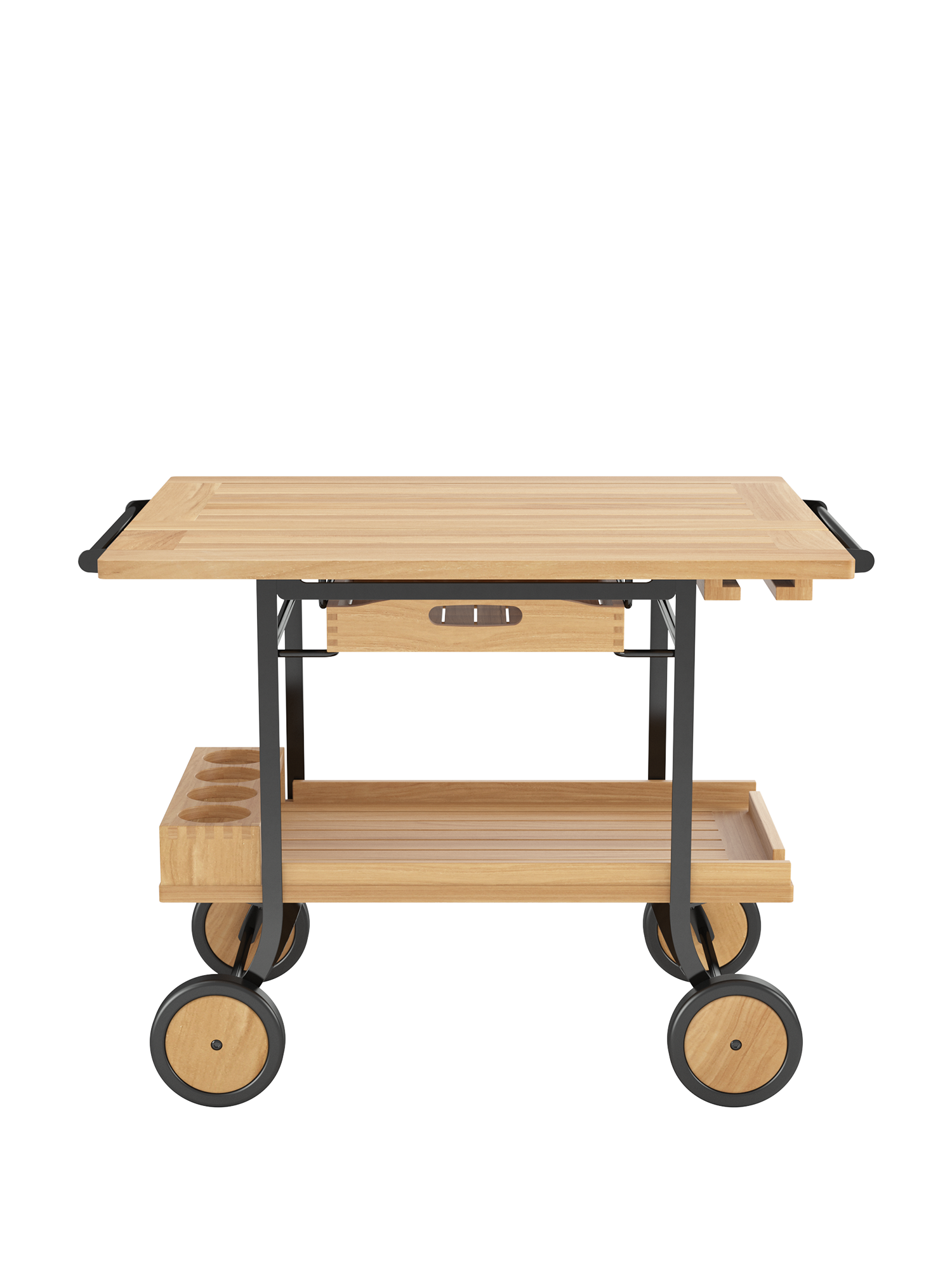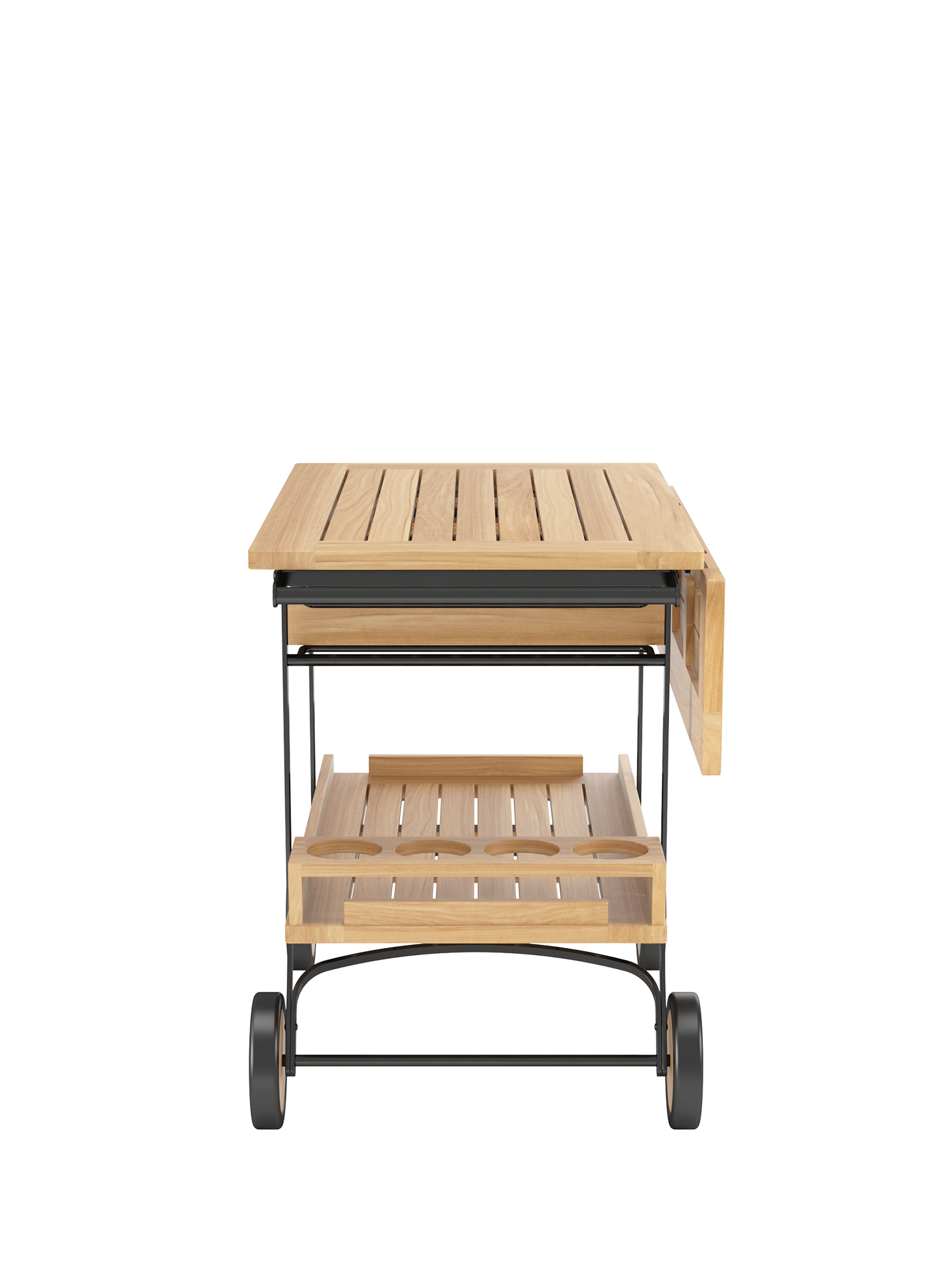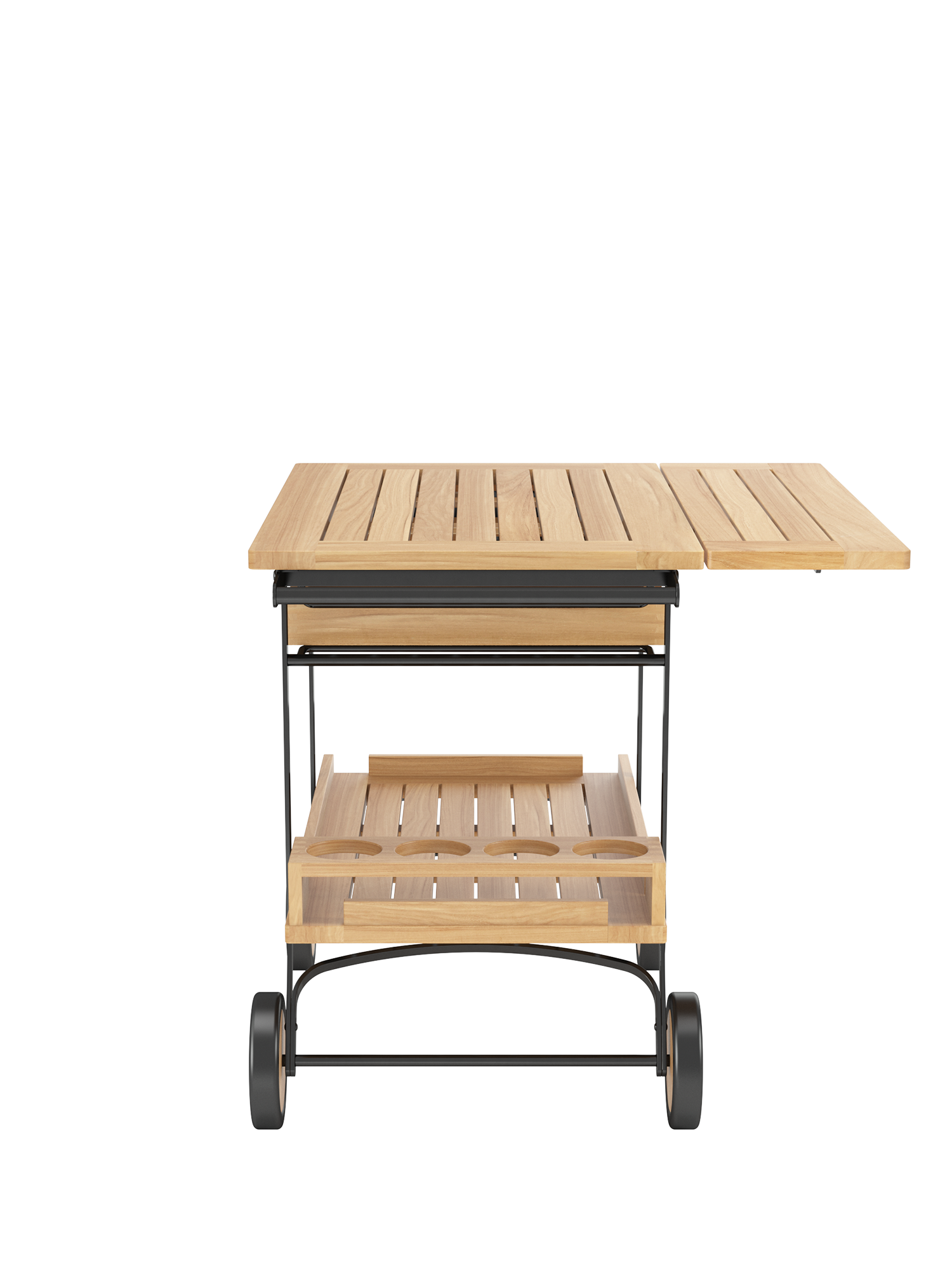 Flexibel bewirtet er große Gesellschaften und kleine Tafelrunden und sorgt angemessen für Nachschub: Der elegante Barwagen aus wetterfesten Materialien hält Getränke, Gläser und Geschirr stets griffbereit. Seine große Arbeitsfläche lässt sich mit einem abklappbaren Element noch erweitern. Eine Schublade für Servietten, Besteck und flache Utensilien lässt sich vollständig herausziehen und fungiert gleichzeitig als Tablett, das auch einzeln erhältlich ist. Flaschenhalterung, untere Ablagefläche und eine Leiste für den sicheren Transport von Gläsern bestehen ebenfalls aus Teak. Mit stabilen Griffen und vier Teakrädern mit Gummibereifung lässt sich der Barwagen sicher bewegen.