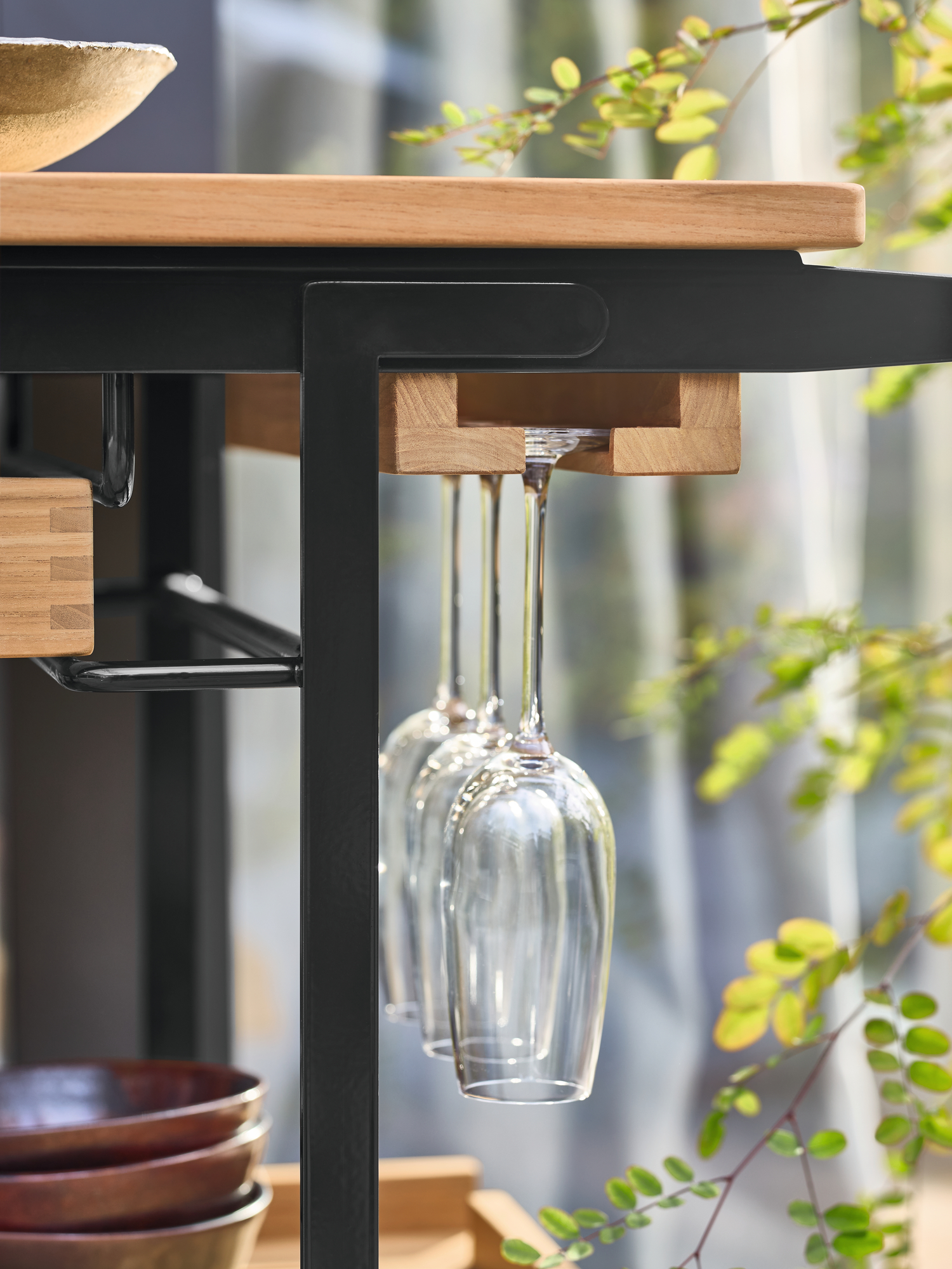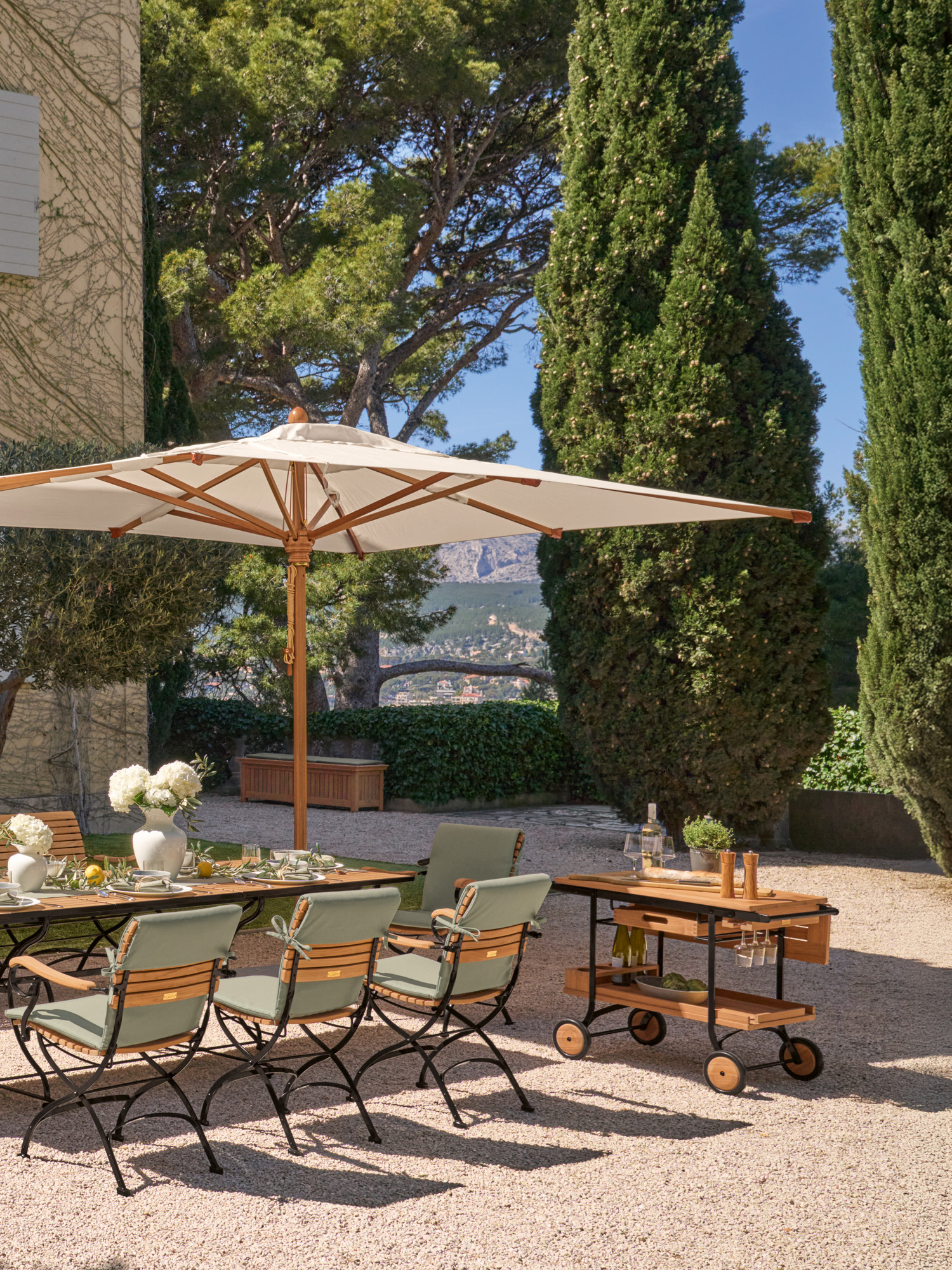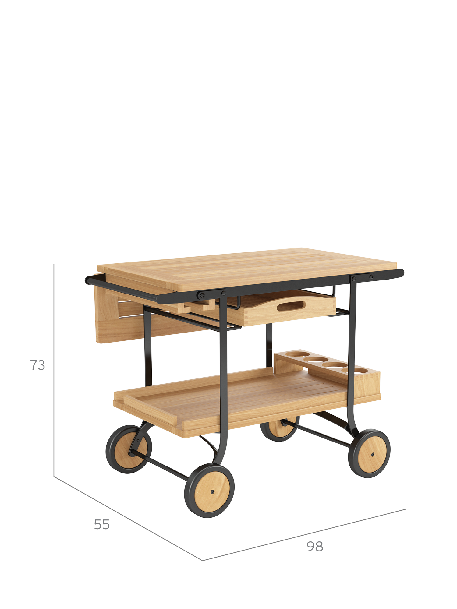 Flexibel bewirtet er große Gesellschaften und kleine Tafelrunden und sorgt angemessen für Nachschub: Der elegante Barwagen aus wetterfesten Materialien hält Getränke, Gläser und Geschirr stets griffbereit. Seine große Arbeitsfläche lässt sich mit einem abklappbaren Element noch erweitern. Eine Schublade für Servietten, Besteck und flache Utensilien lässt sich vollständig herausziehen und fungiert gleichzeitig als Tablett, das auch einzeln erhältlich ist. Flaschenhalterung, untere Ablagefläche und eine Leiste für den sicheren Transport von Gläsern bestehen ebenfalls aus Teak. Mit stabilen Griffen und vier Teakrädern mit Gummibereifung lässt sich der Barwagen sicher bewegen.