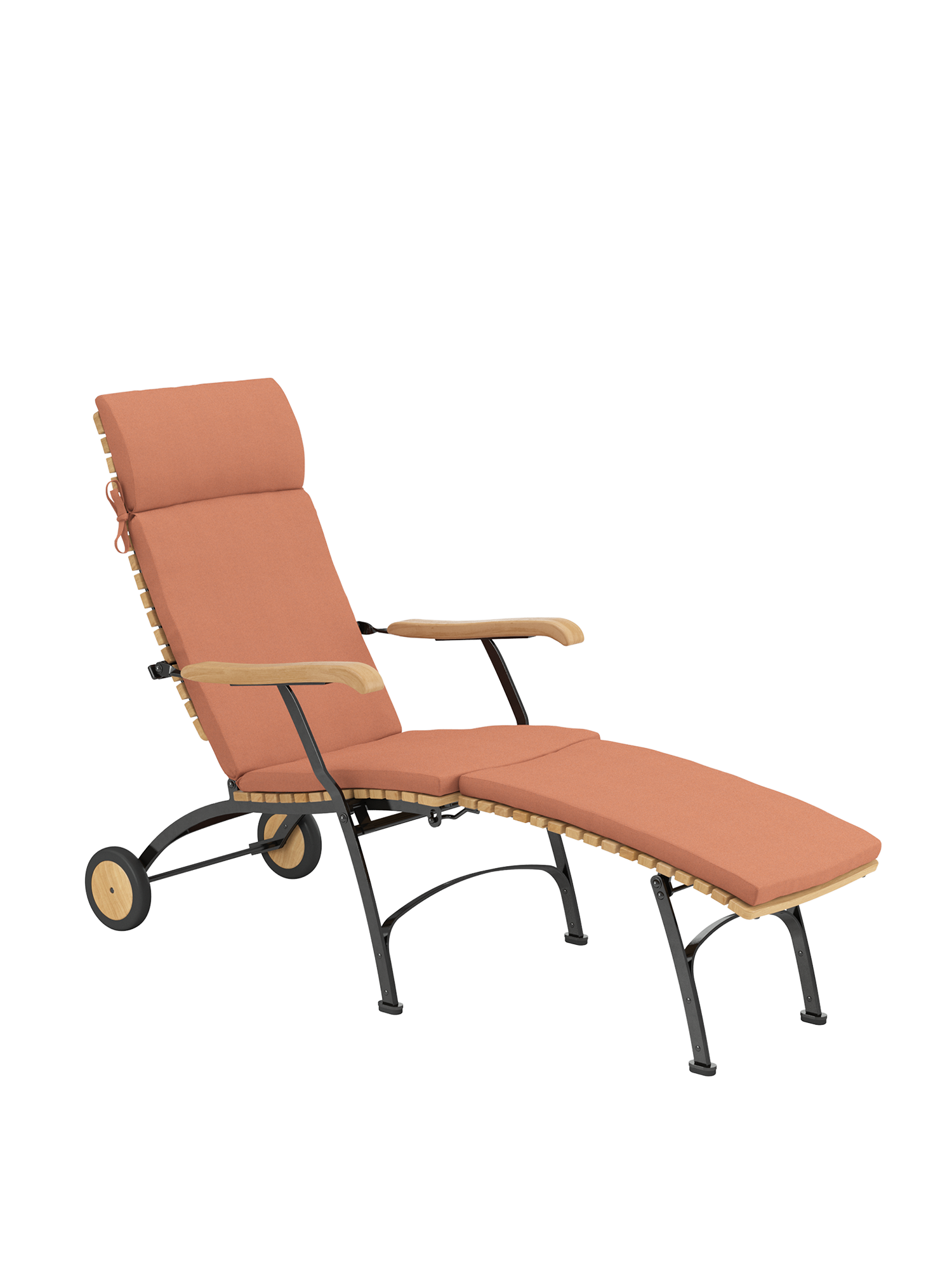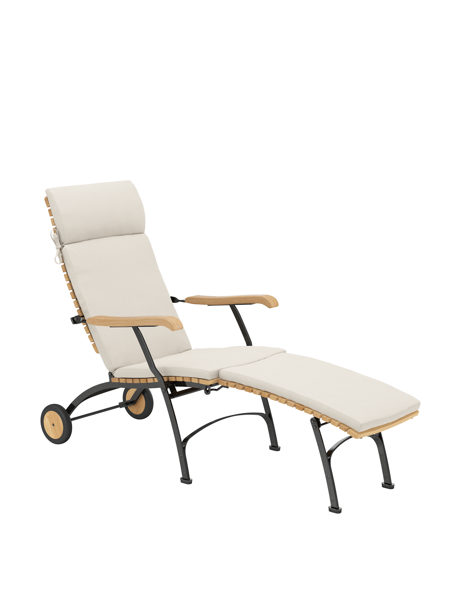 Die Rückenlehne des Deck Chairs lässt sich vierfach verstellen. Sie besteht aus massiven Teakleisten, die in engem Abstand aufeinander folgen. Ihre Form ist nach einem der ungewöhnlichsten Kurvenverläufe modelliert: dem des menschlichen Rückens. Dank seines einfach abzunehmenden Fußteils verwandelt sich der Deck Chair im Handumdrehen in einen komfortablen Sessel. Auflagen in verschiedenen Farbtönen erhöhen noch die Bequemlichkeit der Möbel und setzen feine Akzente.