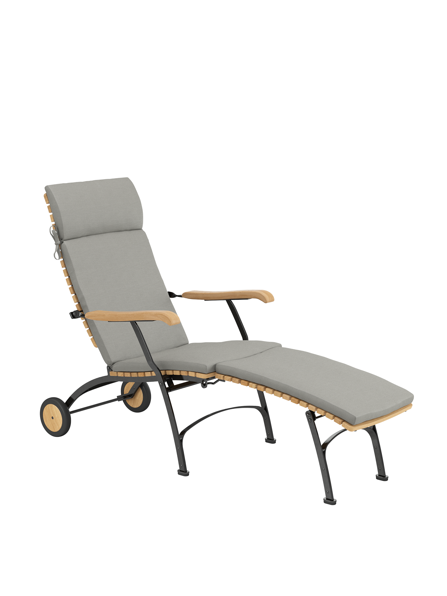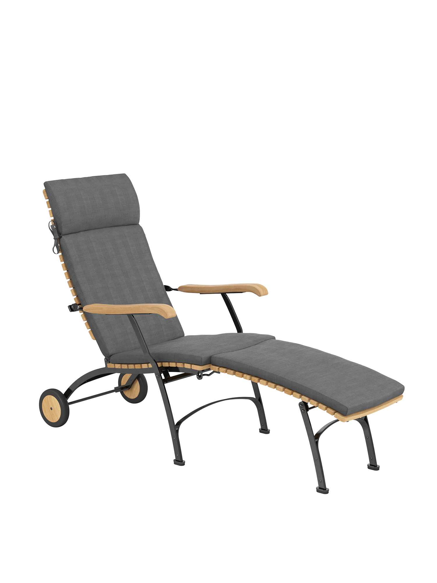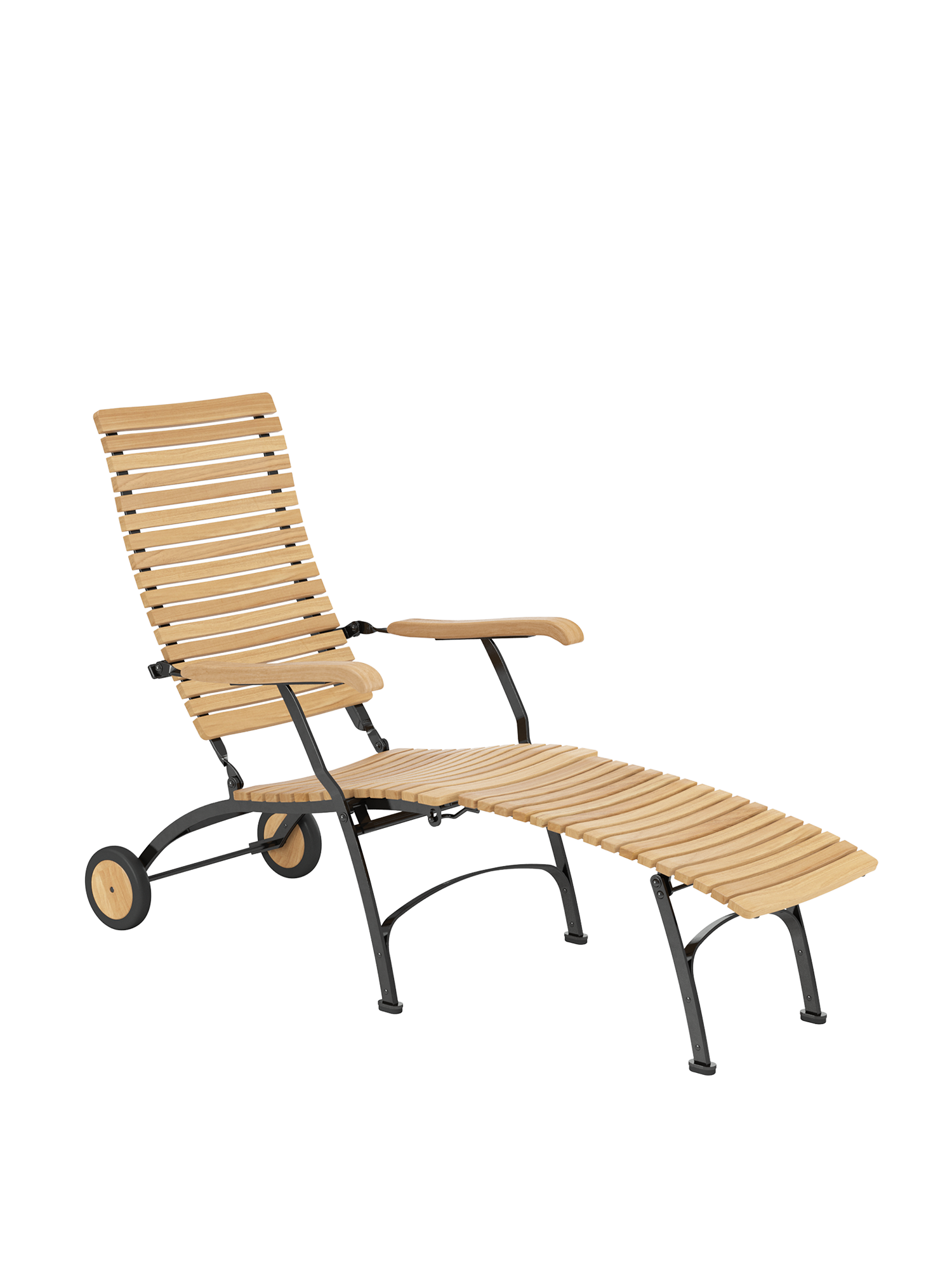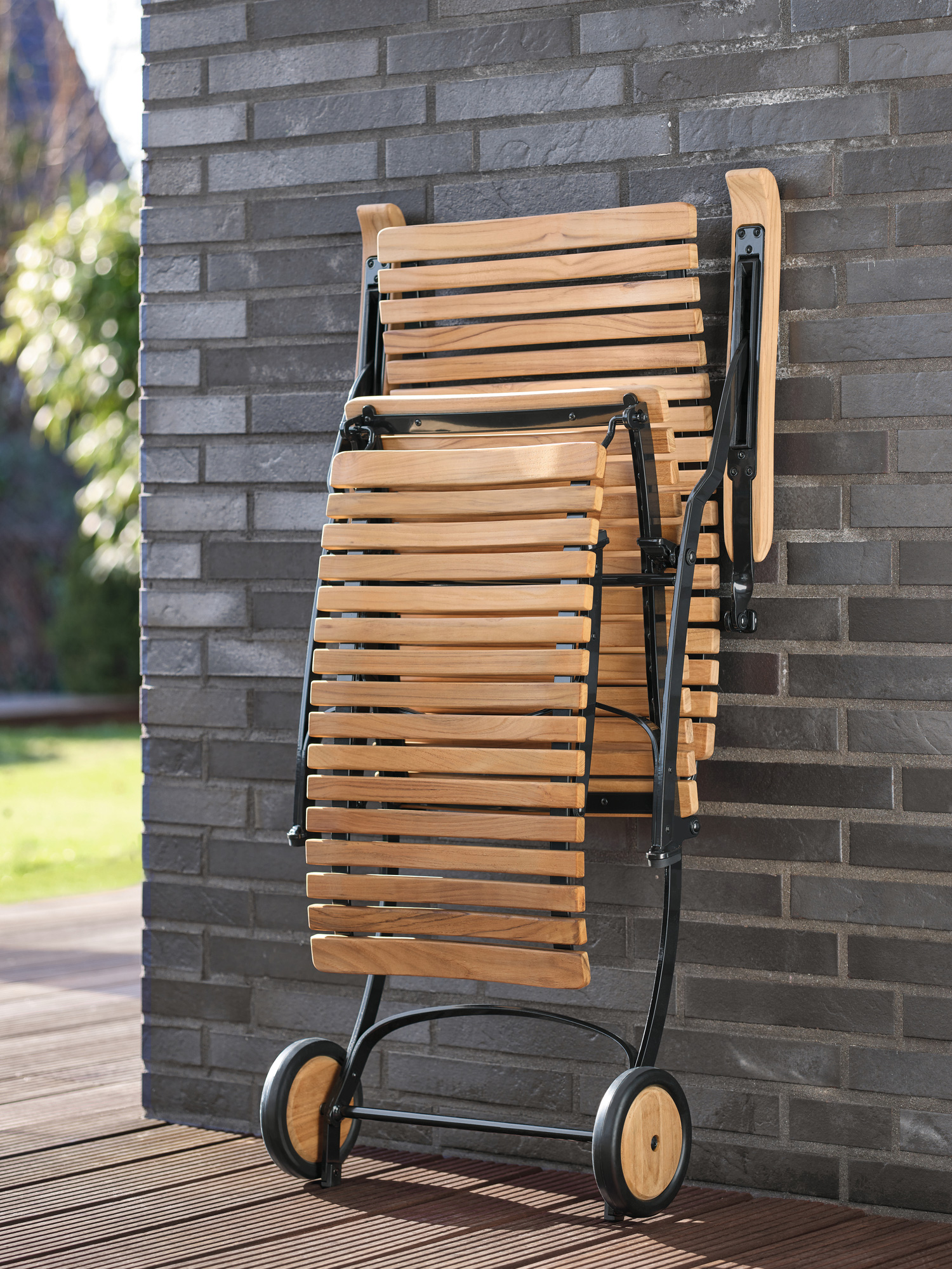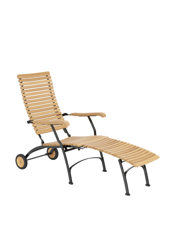 Alle Drehverbindungen aus Edelstahlbolzen sind rostfrei gelagert - für eine dauerhafte Funktion im Freien. Laufrollen aus hochwertigem Polyamid, die unter der Sitzfläche angebracht sind, unterstützen leichtgängiges Klappen und schonen die beschichteten Metallteile. Das Gestell ist aus verzinktem und damit rostgeschütztem Stahl, graphitschwarz pulverbeschichtet. Mit seinen Rädern aus Teak lässt sich der Deck Chair einfach durch den Garten bewegen. Fußgleiter aus abriebfestem Kunststoff schützen wertvolle Böden vor Kratzern.